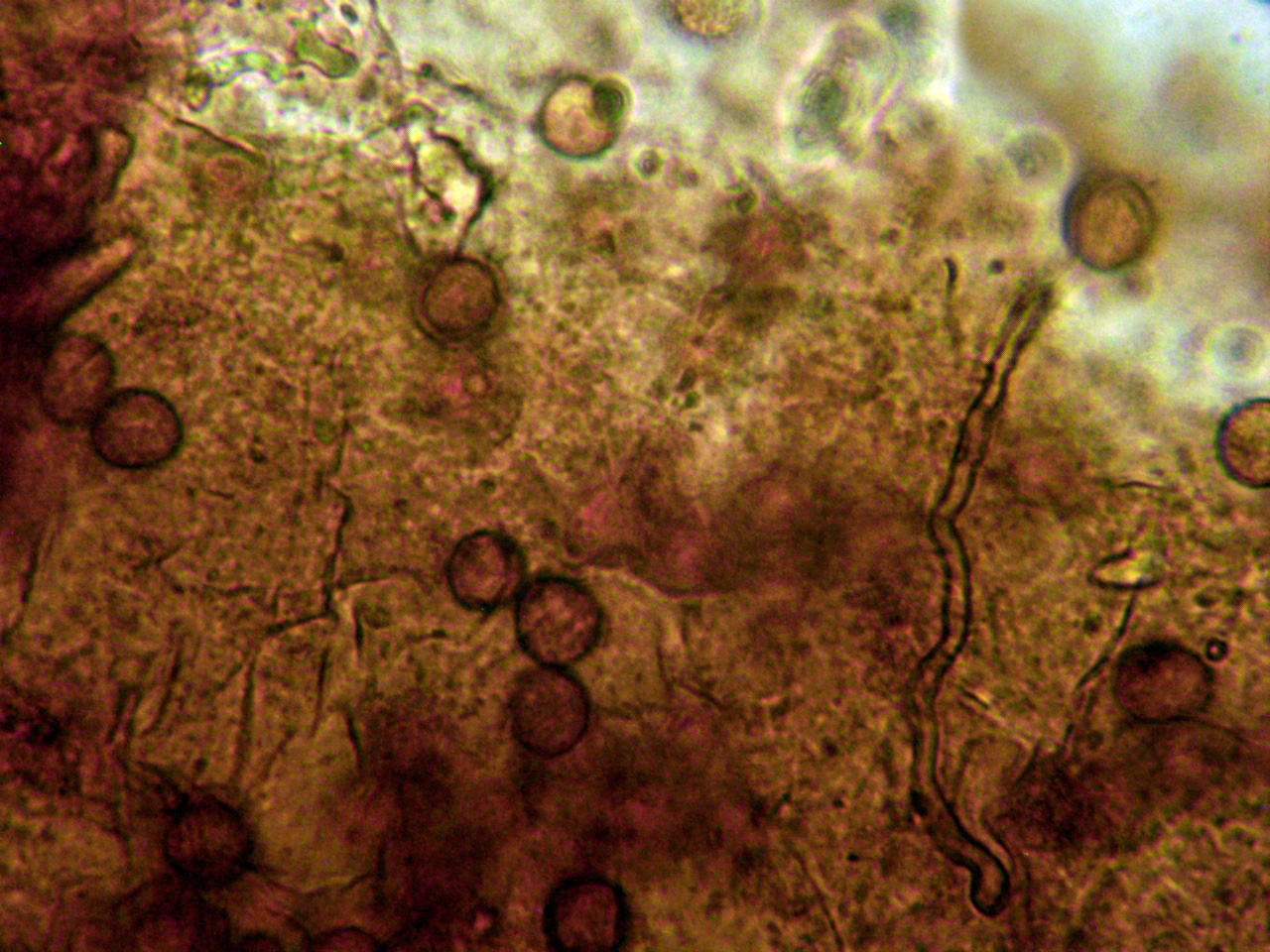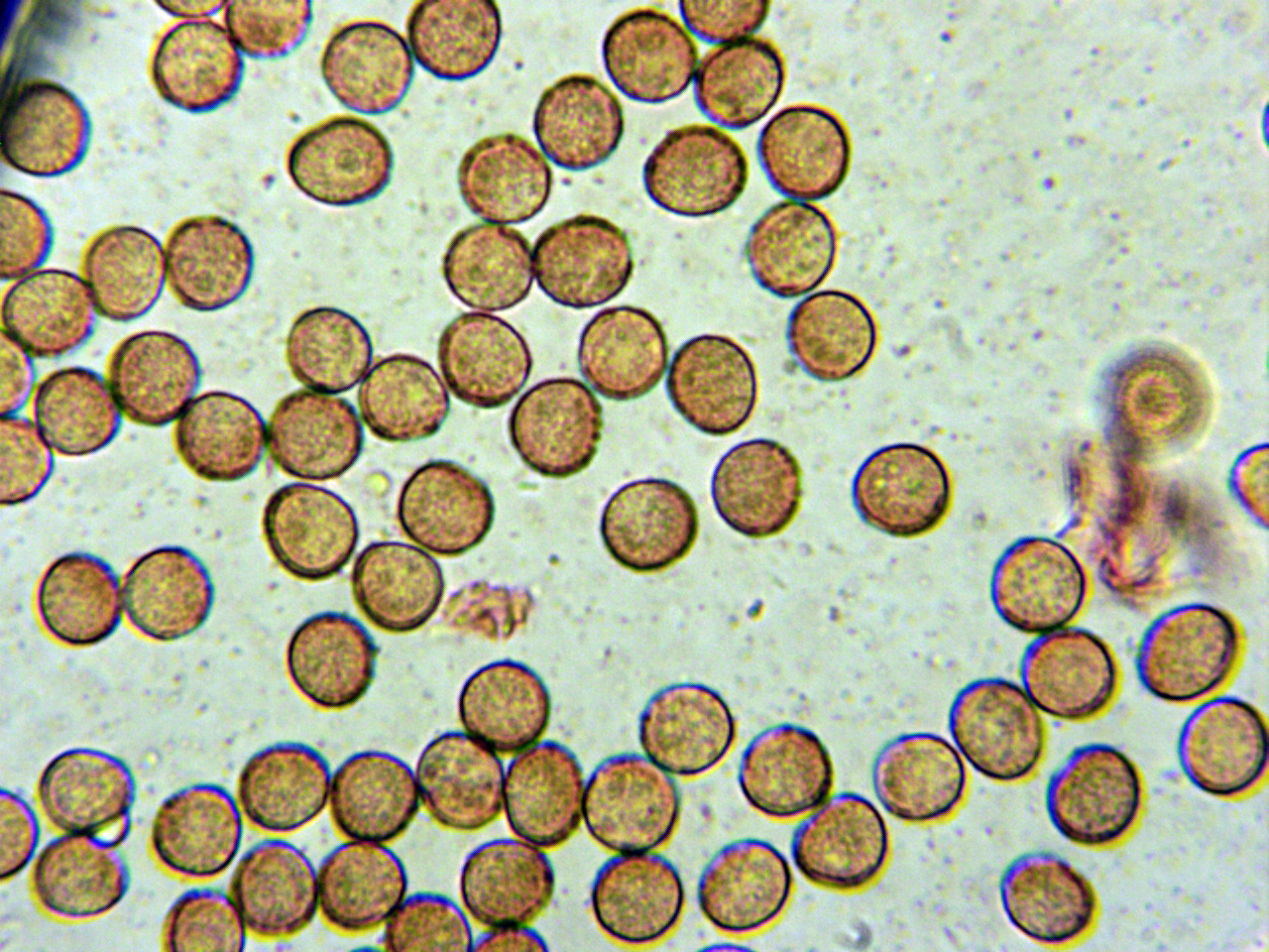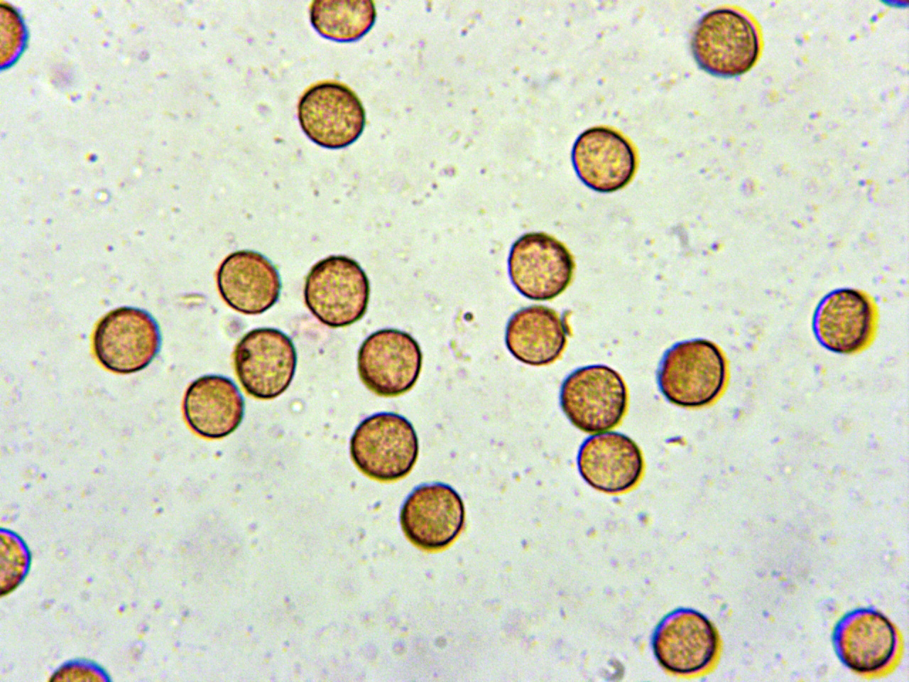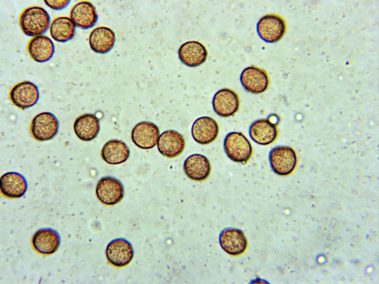 Las esporas en masa anaranjado - rojizas, al microscopio esféricas con su superficie cubierta de pequeñas verrugas difíciles de observar dispuestas densamente de manera uniforme por toda su superficie:
