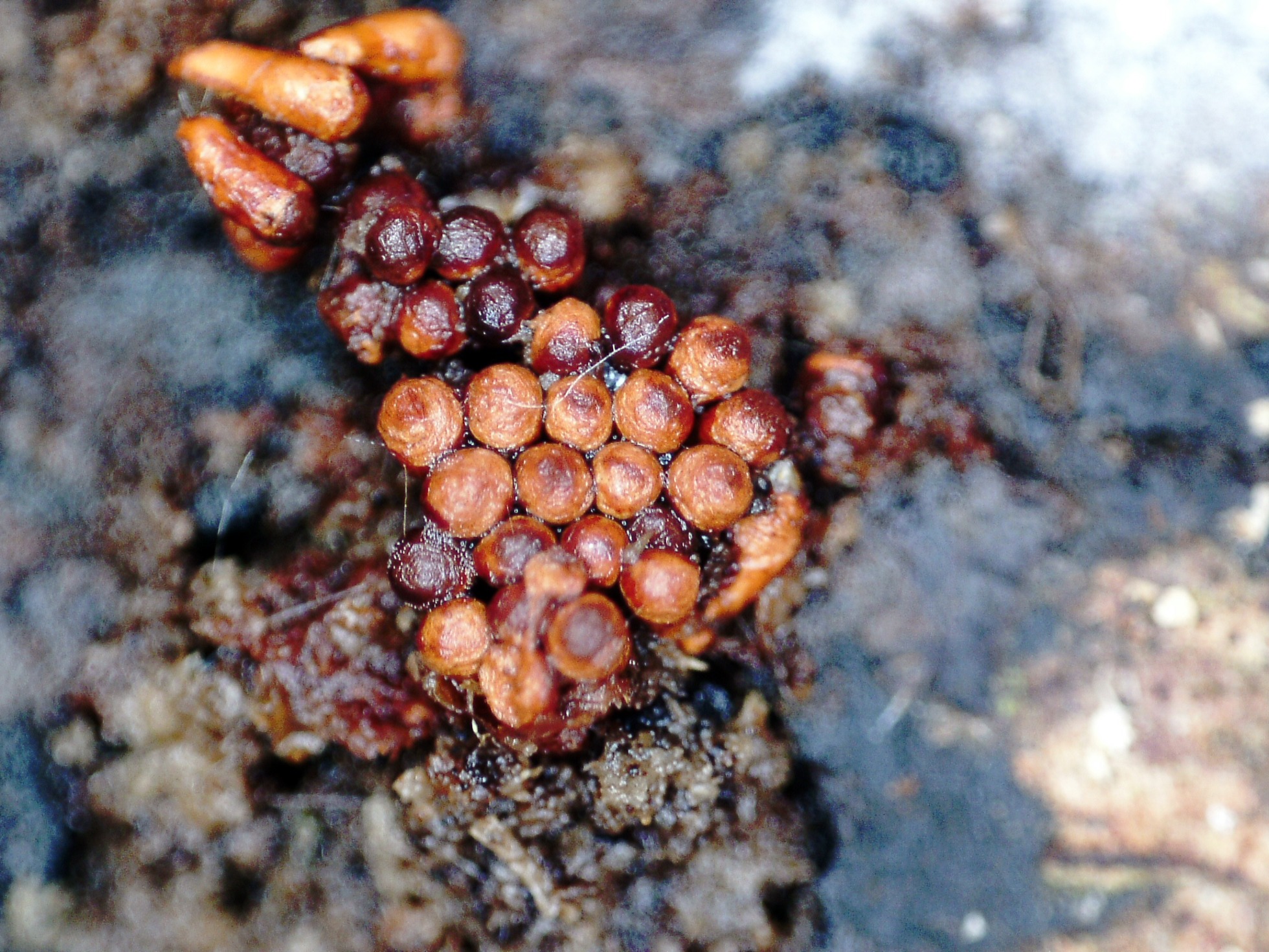 Esporocarpos densamente agregados en grupos de ejemplares bastante numerosos, sobre la corteza de un tronco de planifolio tropical indeterminado: