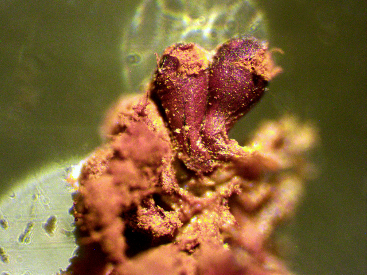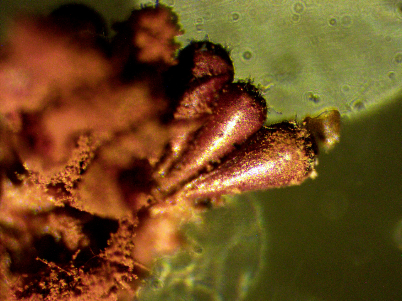 Esporotecas con forma de cono invertido con el extremo redondeado, de un color rojo púrpura con brillo metálico.