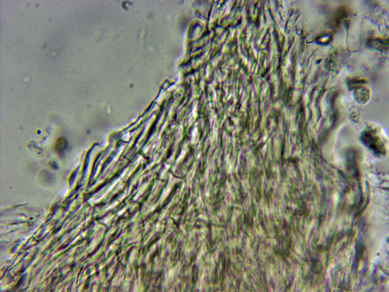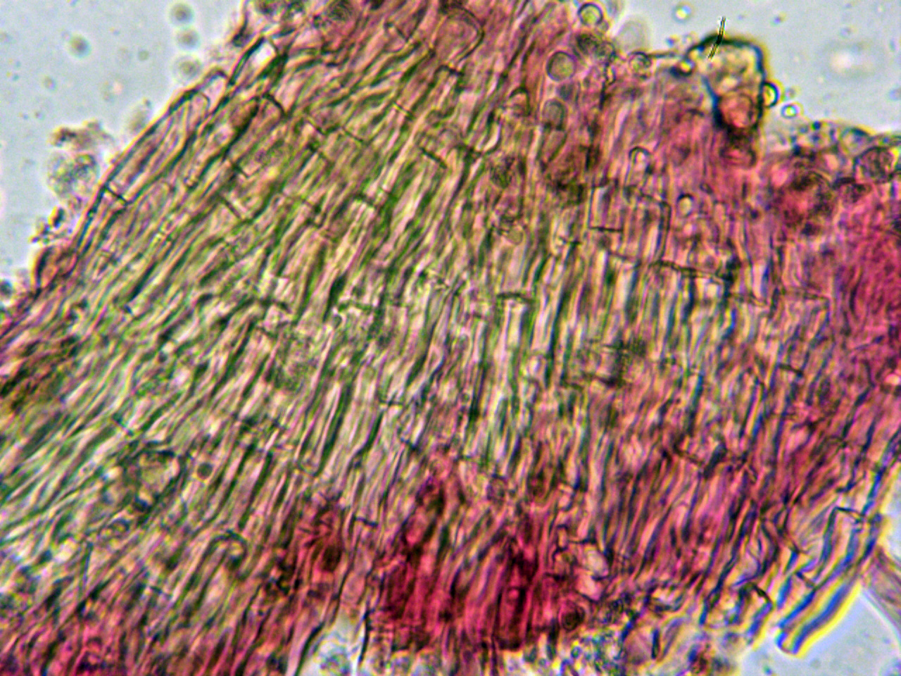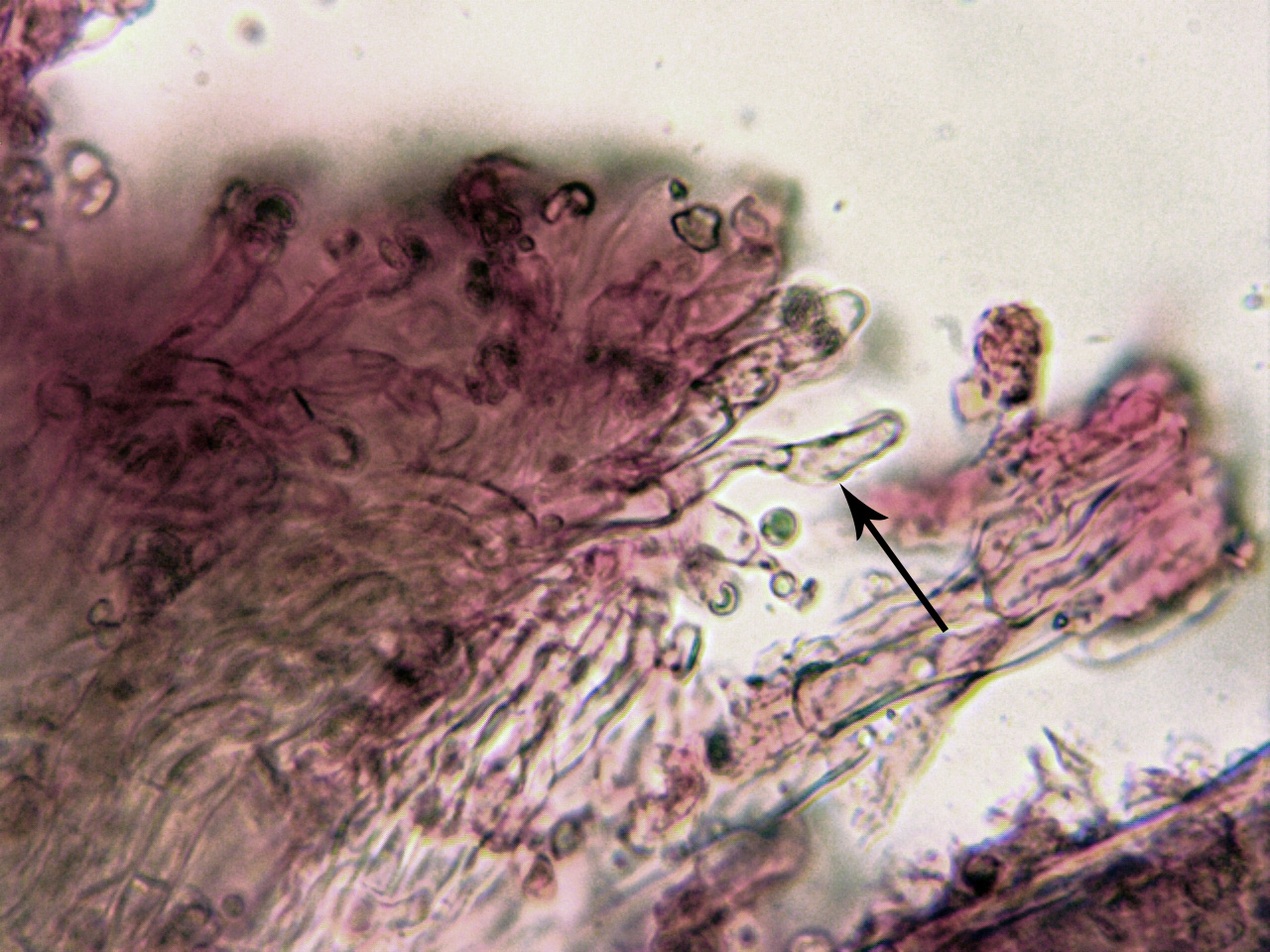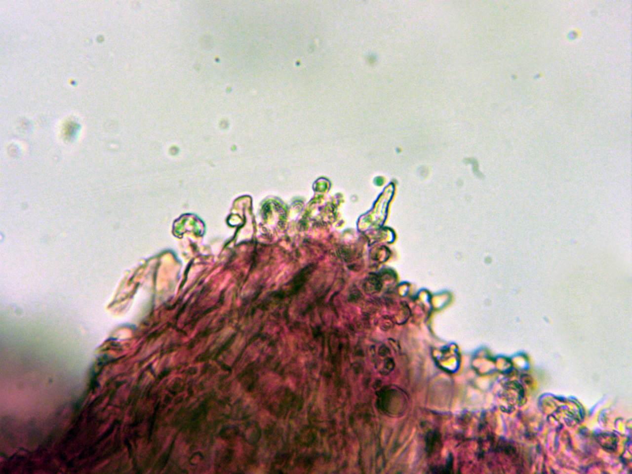 En las muestras pude observar en el himenio algunos elementos terminales con cristalizaciones en el ápice: