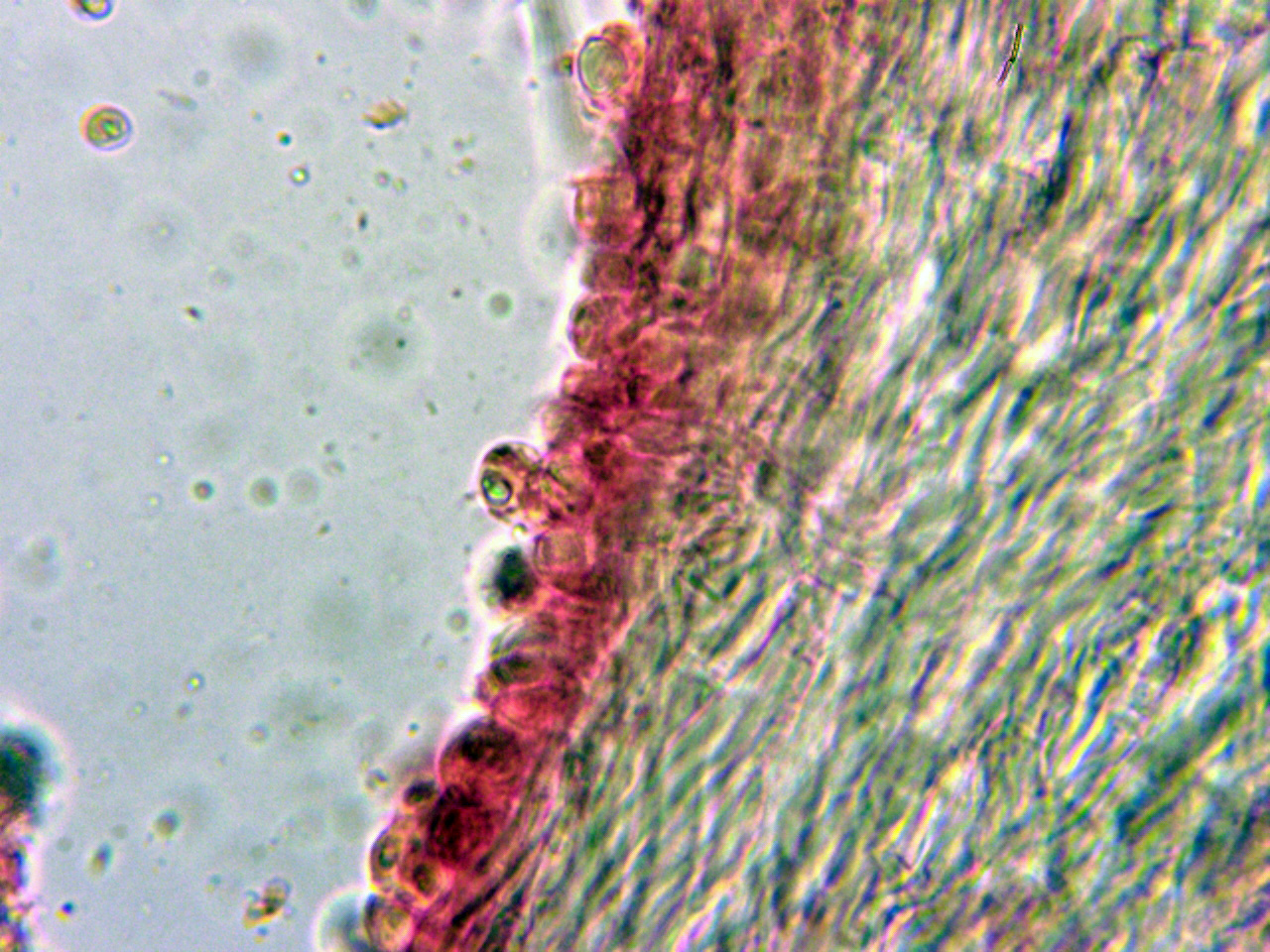 Aunque la especie se cita "sin cistidios", si pueden observarse algunos cistidiolos fusoides aislados:
