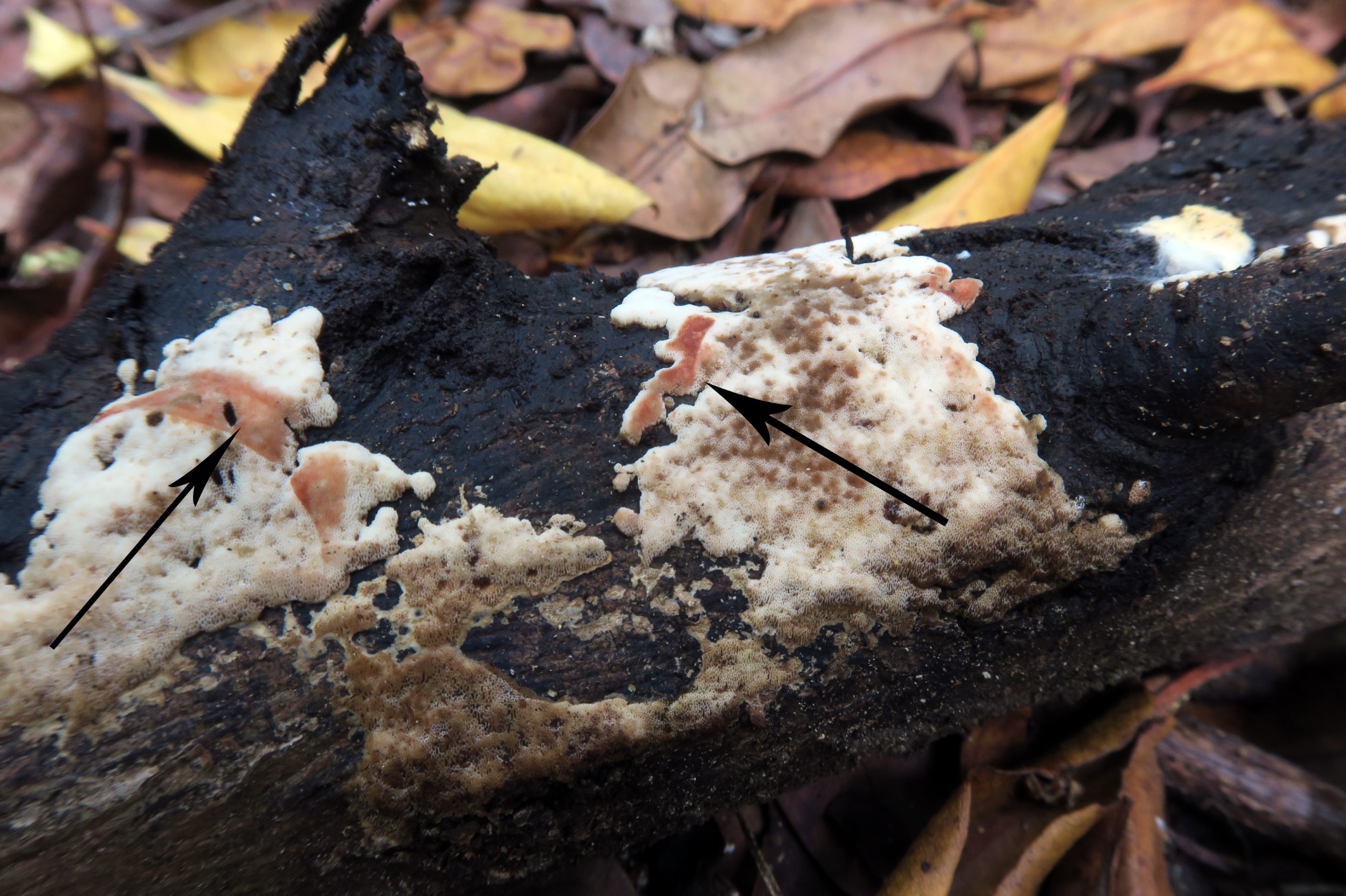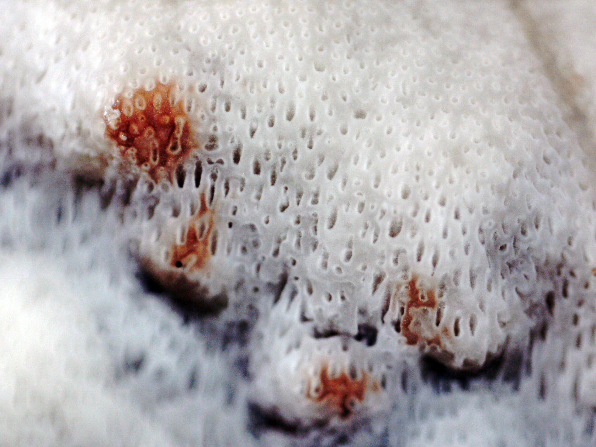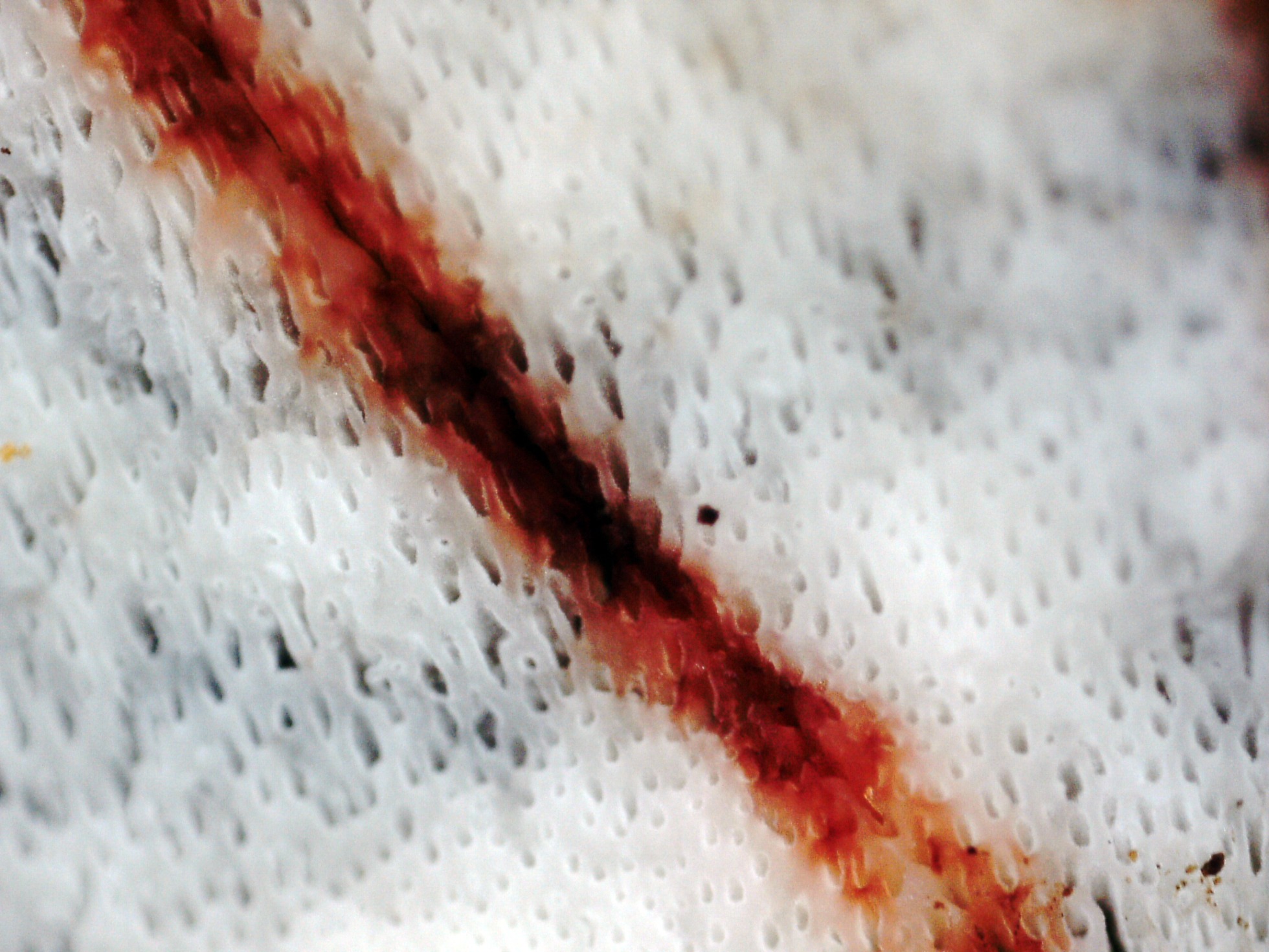 Otra imágen de una recogida distinta próxima a la primera, a destacar el tono rojizo que adquiere el basidioma con solo apoyar suavemente en su superficie el microscopio de mano (zona señalada con las flechas):