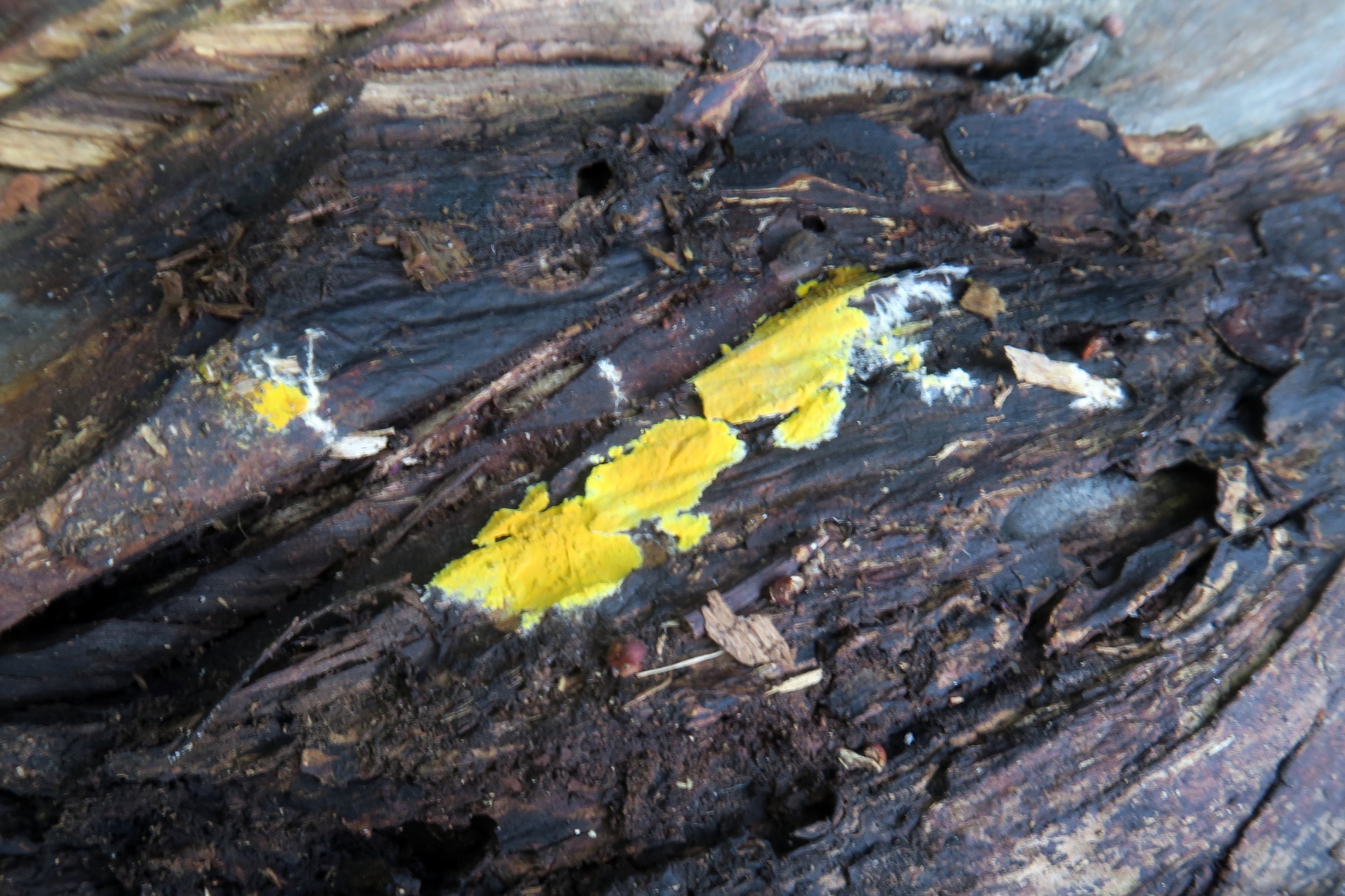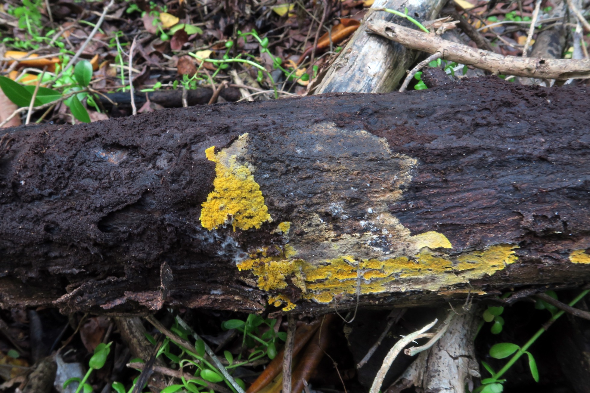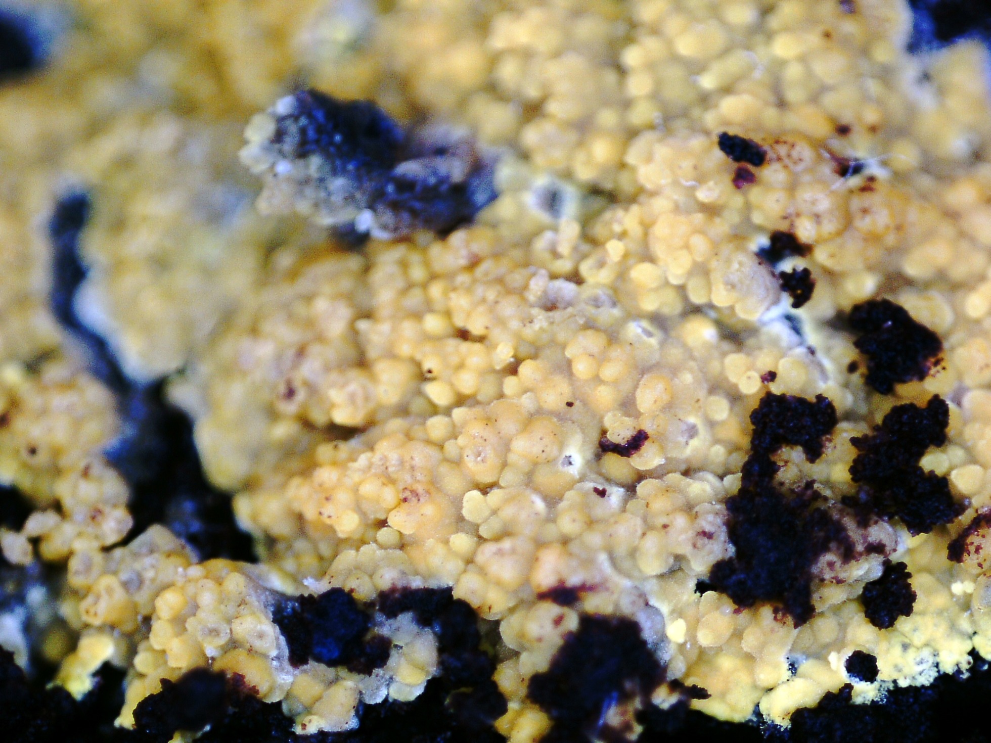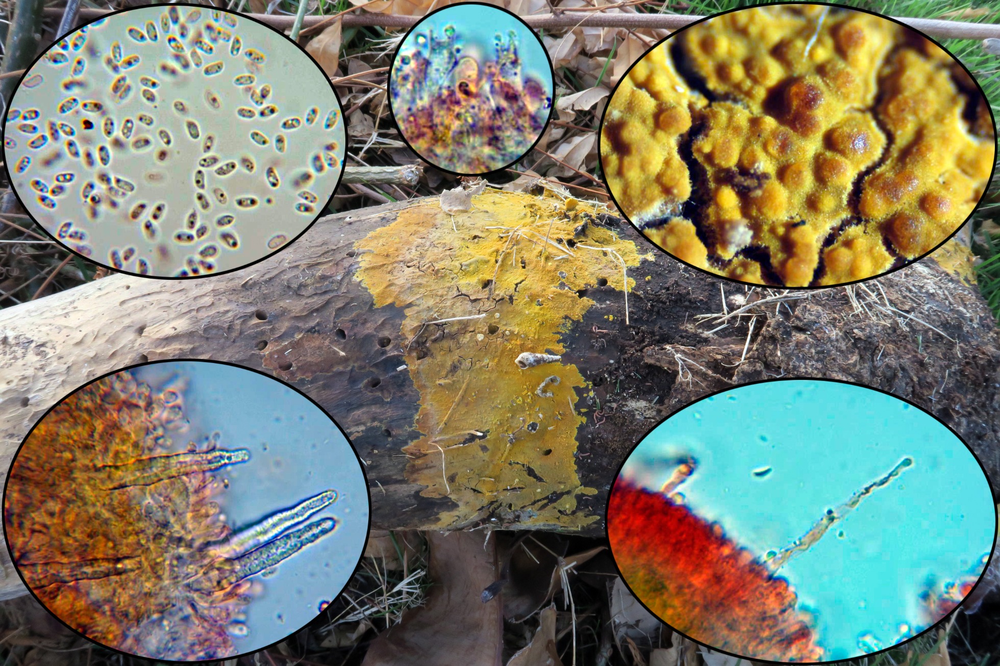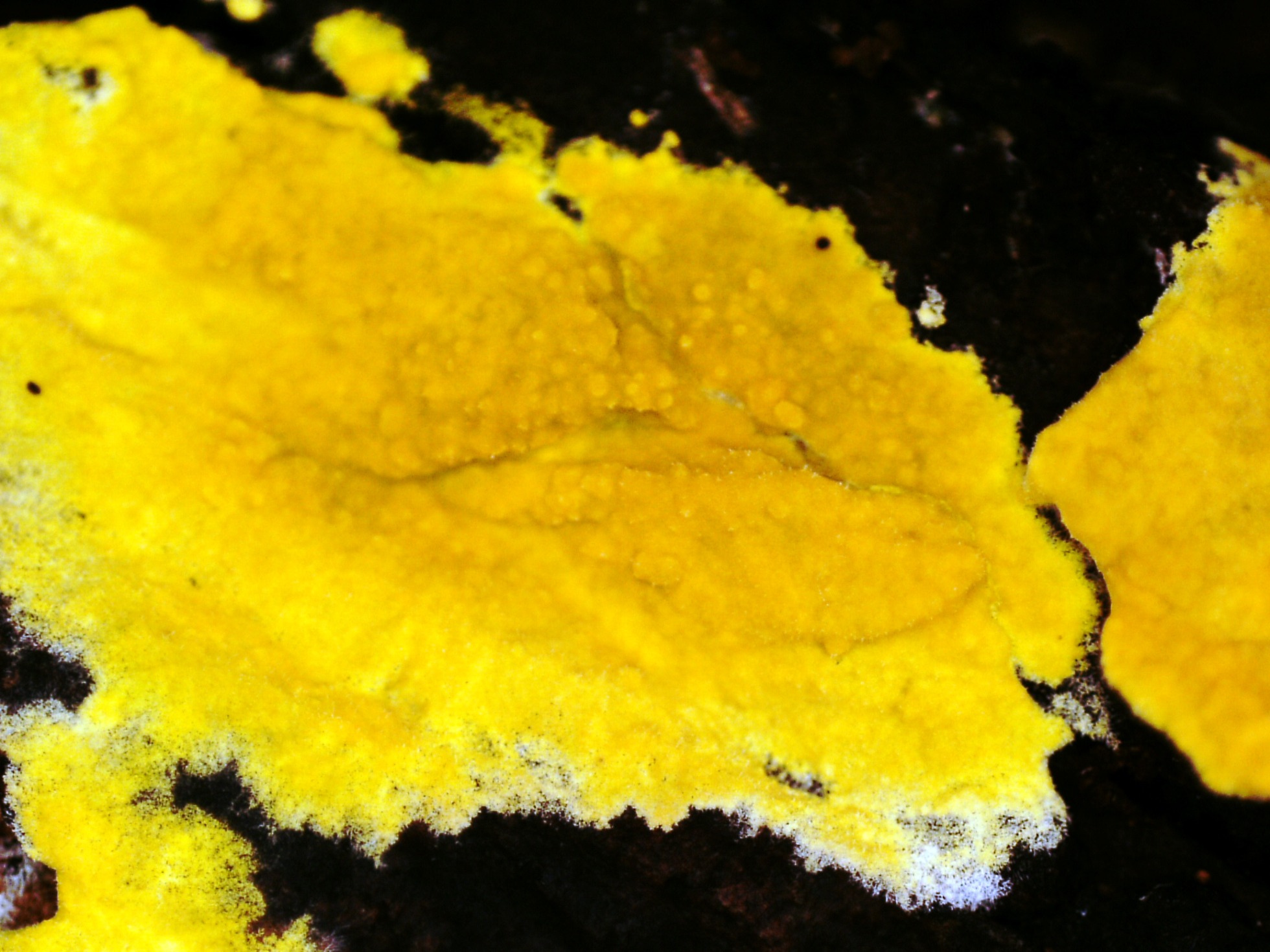 Un Corticial completamente resupinado de un vistoso color amarillo, localizado en "Laguna Bávaro", con dos recogidas de muestras a poca distancia la una de la otra.