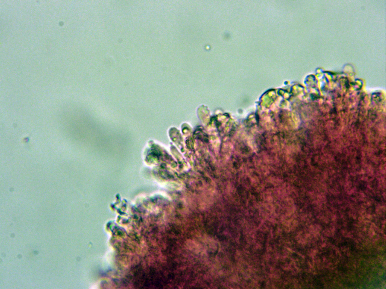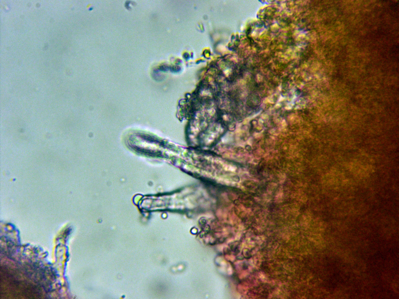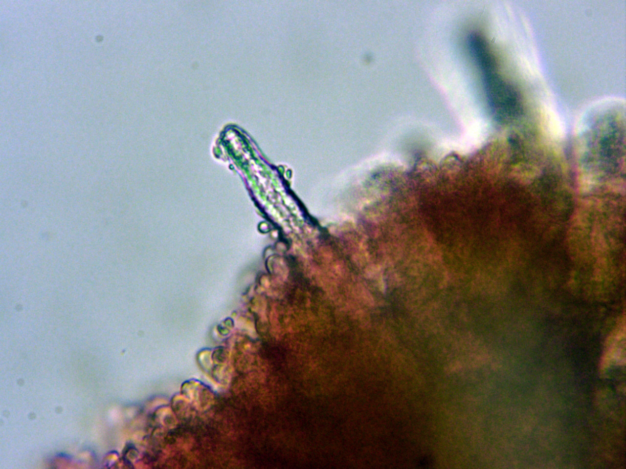 En el himenio a destacar la presencia de dos tipos distintos de cistidios, por un lado unos cistidios cilíndricos de pared gruesa y con abundantes incrustaciones: