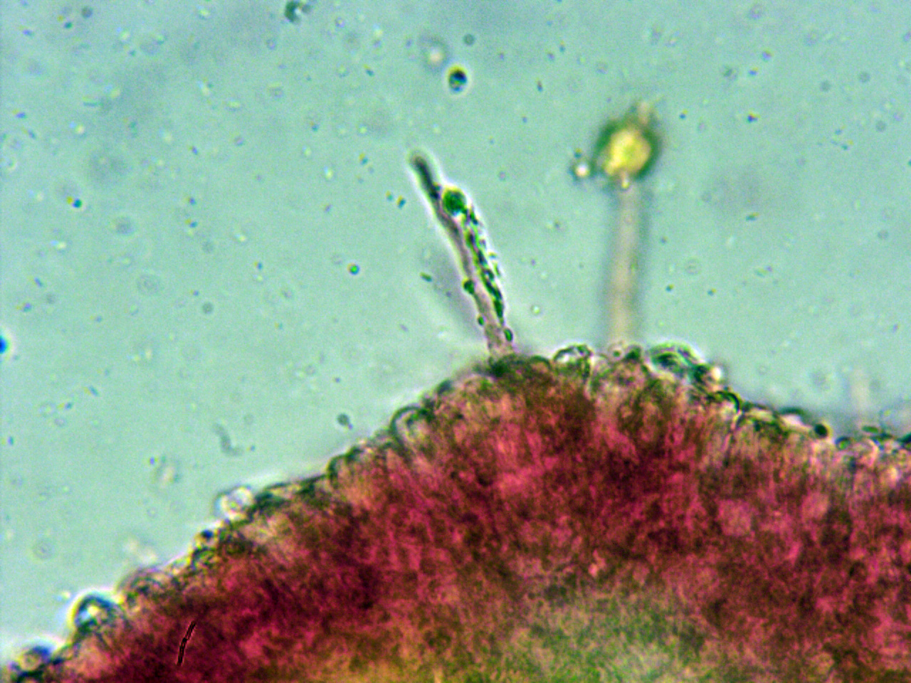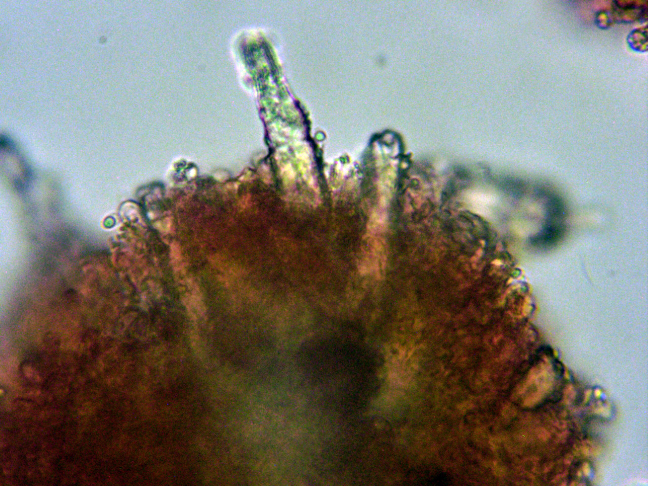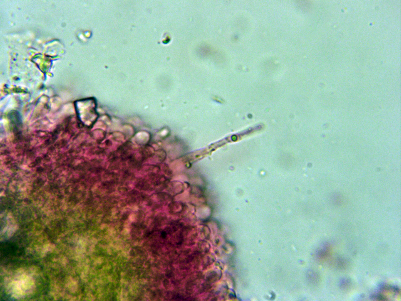 En el himenio a destacar la presencia de dos tipos distintos de cistidios, por un lado unos cistidios cilíndricos de pared gruesa y con abundantes incrustaciones: