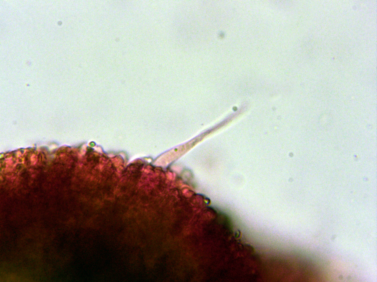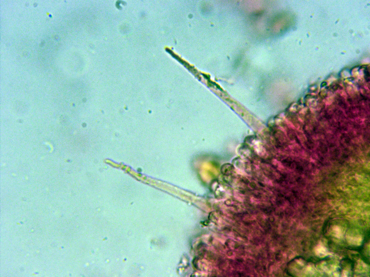 Y mezclados con los anteriores unos cistidios lisos, de pared fina, muy alargados, algo ventricosos y con el extremo apuntado: