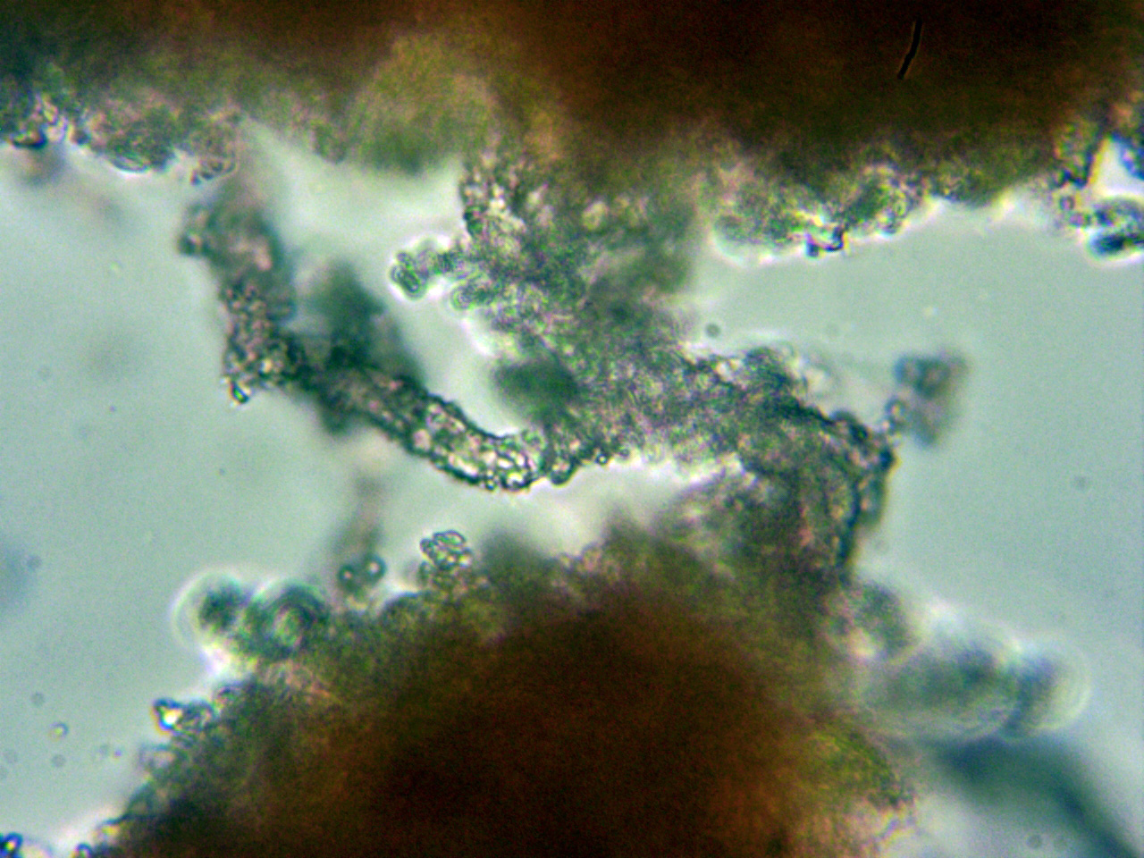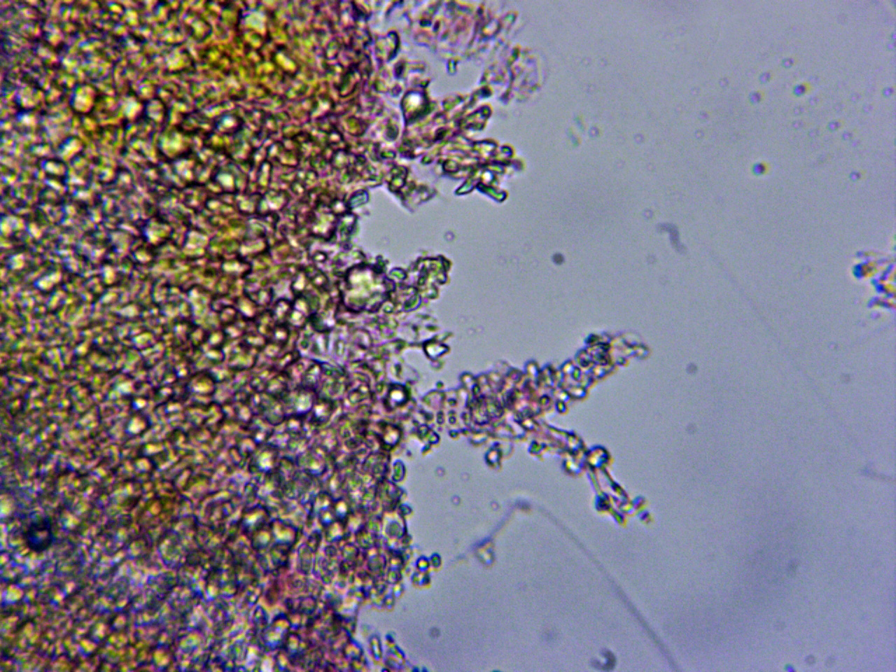 Un par de ampliaciones se su superficie a 20 aumentos, a destacar su margen de crecimiento con discretos rizomorfos blanquecinos.