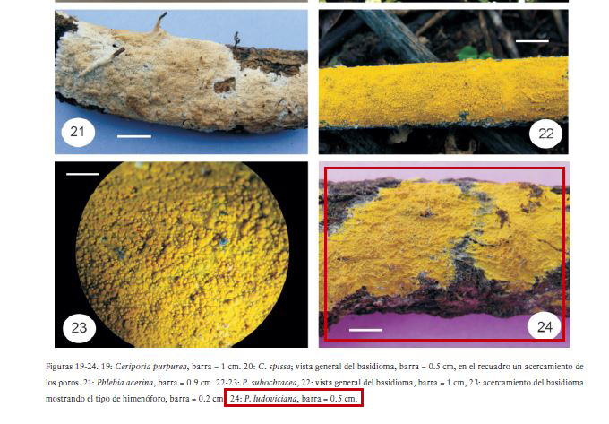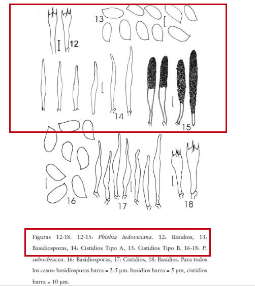 Observaciones: Estudio contrastado con el documento de Fidel Tapia y Santiago Chacón (2015), con el título de "Registros de hongos corticioides de la familia Meruliaceae (Polyporales, Agaricomycetes) de Veracruz, México", en el que se indican unas medidas esporales para la Phlebia ludoviciana de 4-6 (-6.5) x 2-2.5 (-3) μm, muy acordes con las de los presentes estudios.