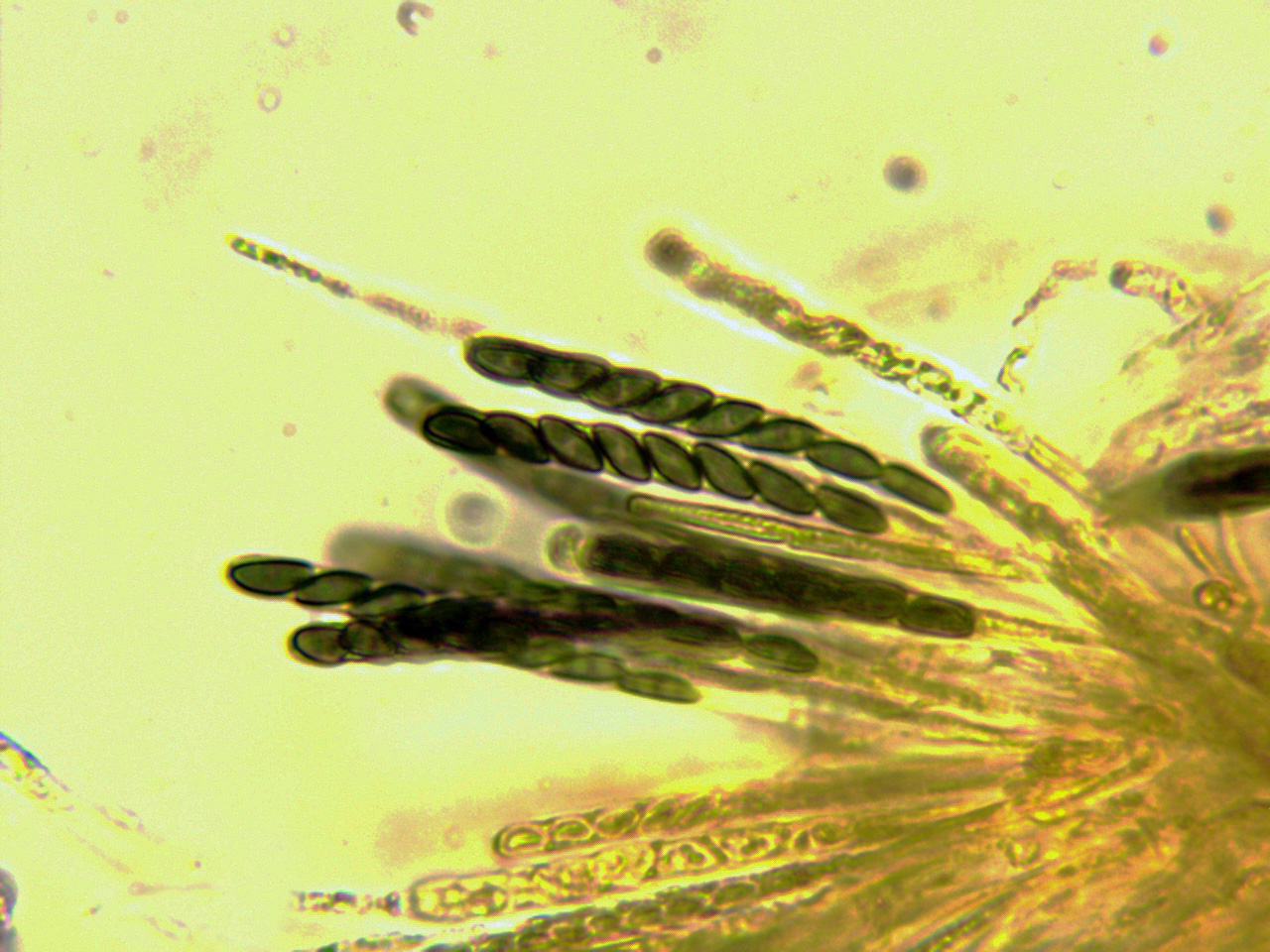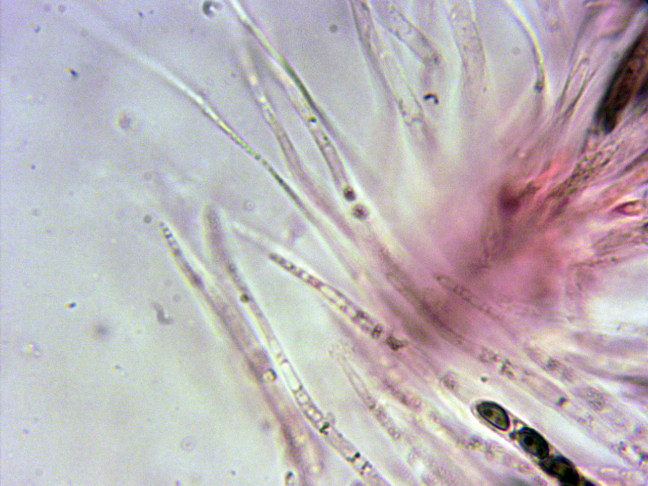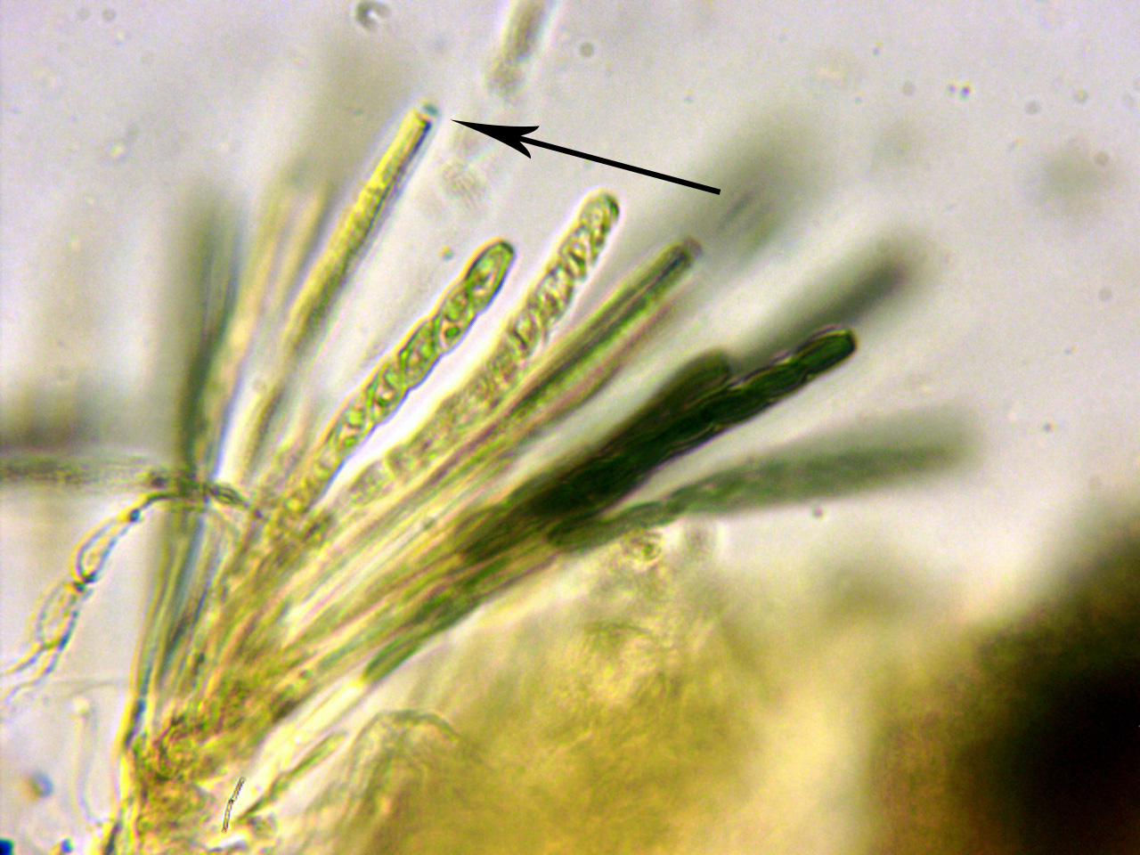 Paráfisis filiformes hialinas que sobresalen por encima del nivel de los ascos.