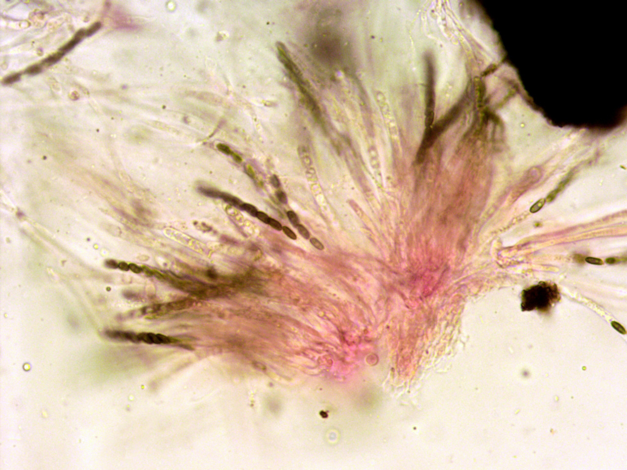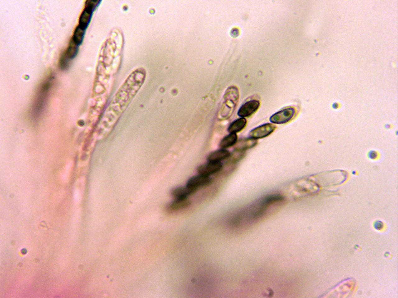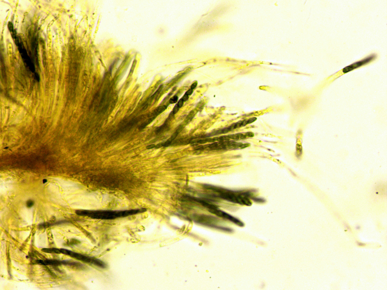 Paráfisis filiformes hialinas que sobresalen por encima del nivel de los ascos.