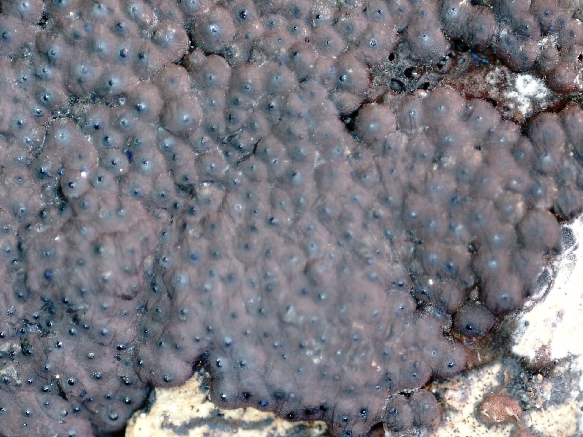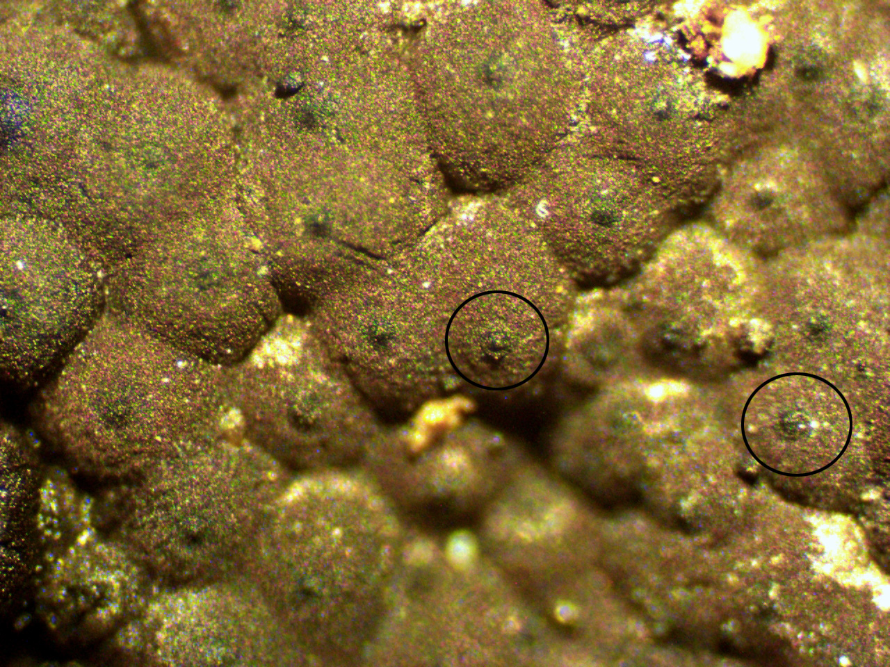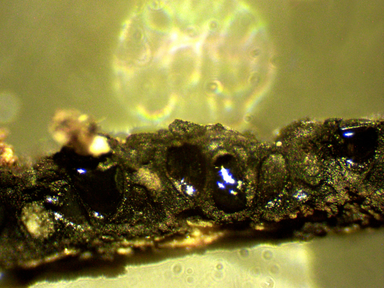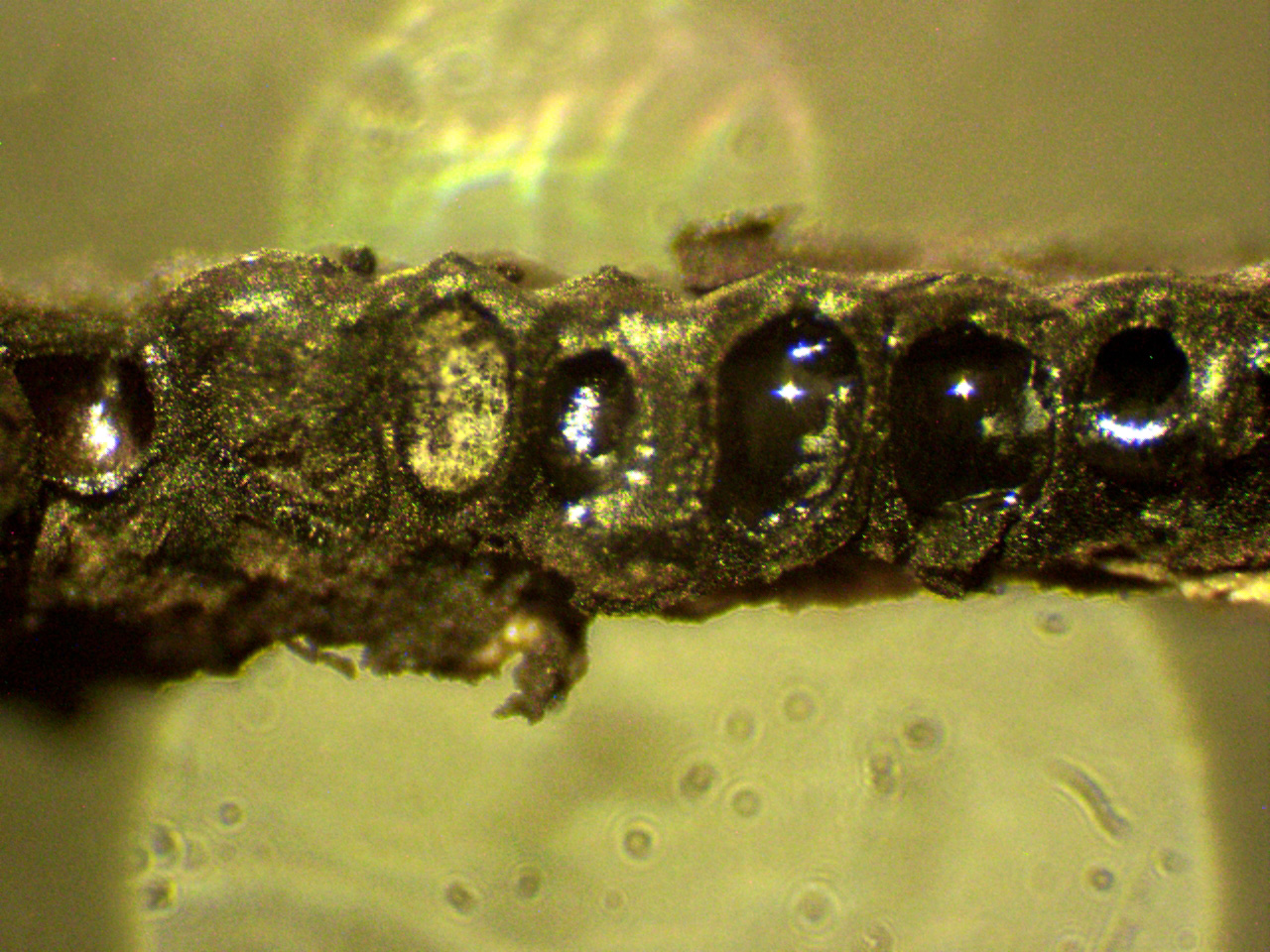 Superficie de los peritecios a 40 aumentos, con un ostiolo provisto de un pequeño disco que apenas llega a las 150 micras, este detalle lo separa de la Europea Annulohypoxylon stygium var. annulatum con disco apical más pronunciado y de entre 250 y 380 micras.