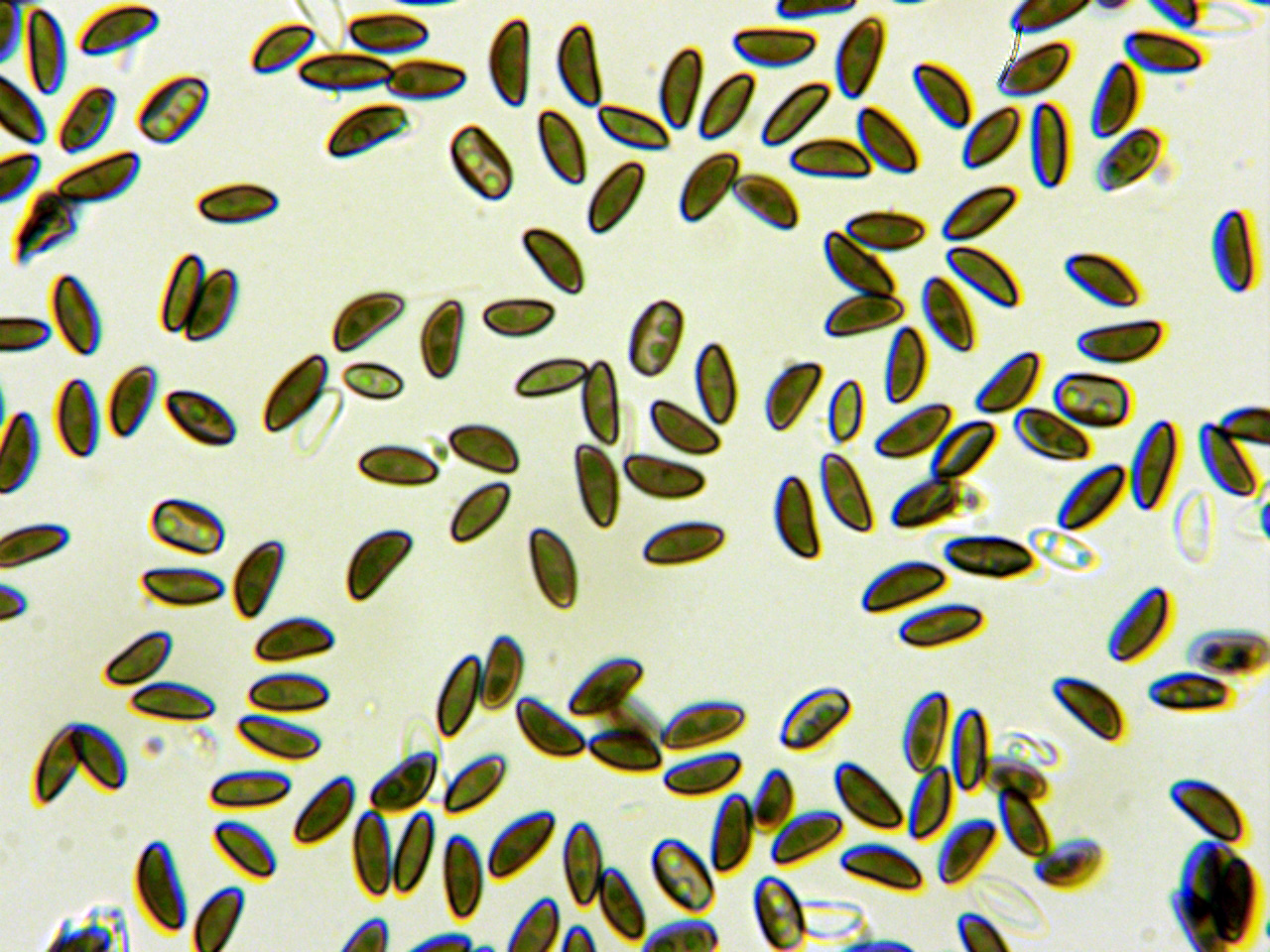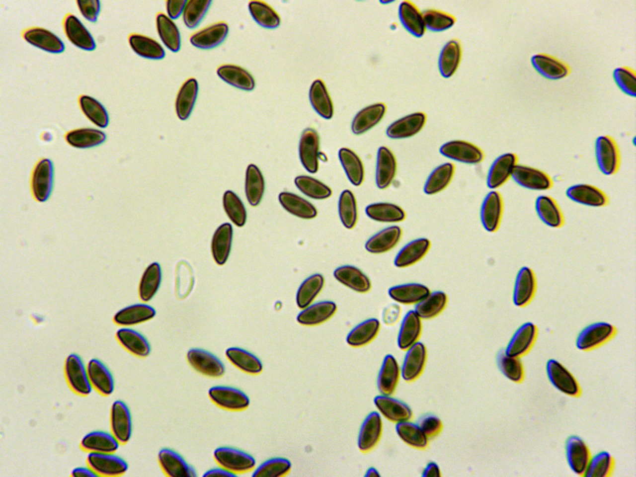 Las esporas inequilaterales, de color marrón claro con hendidura germinal cerca del lado aplanado y unas medidas en agua de: