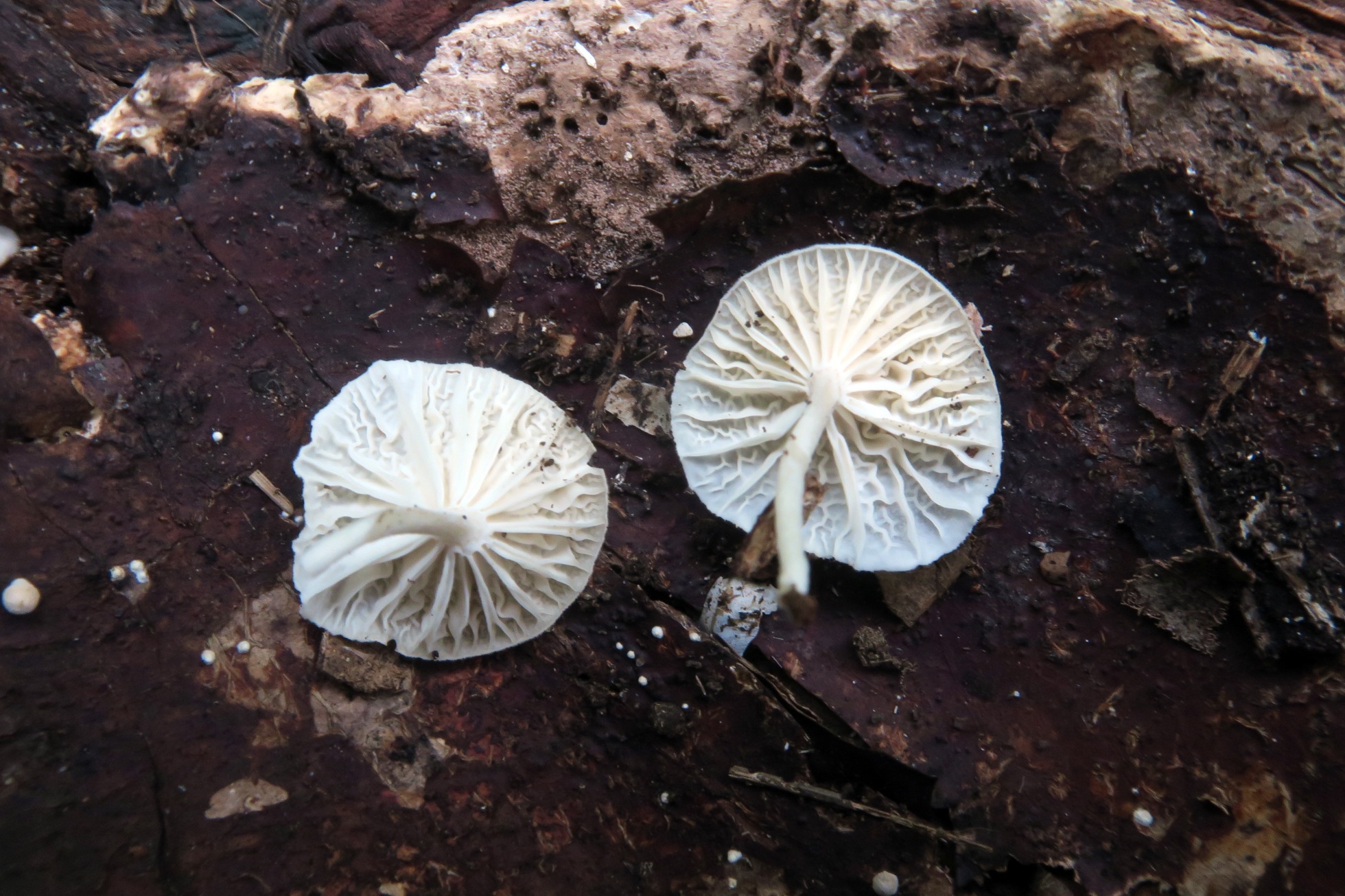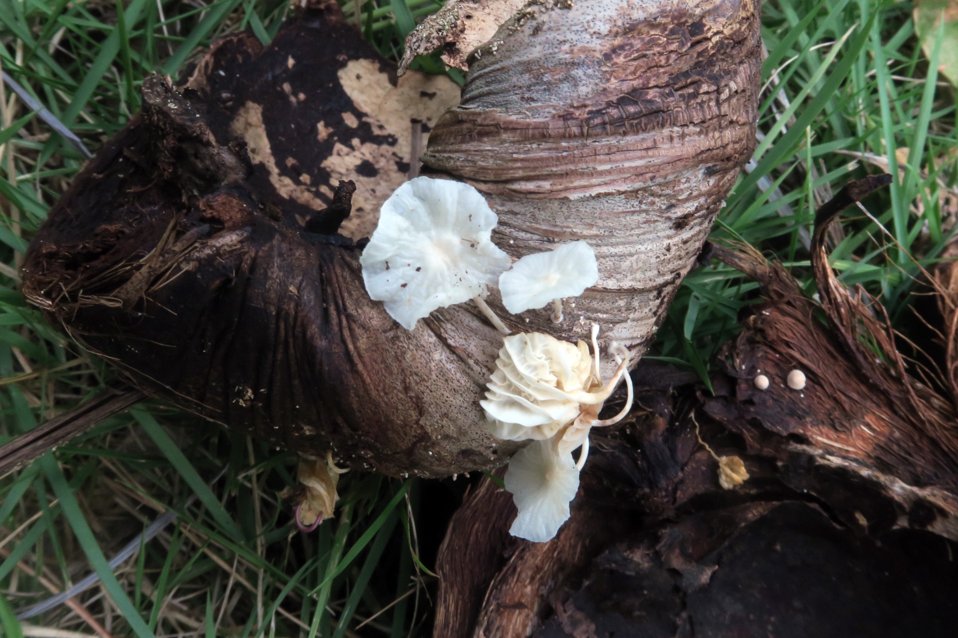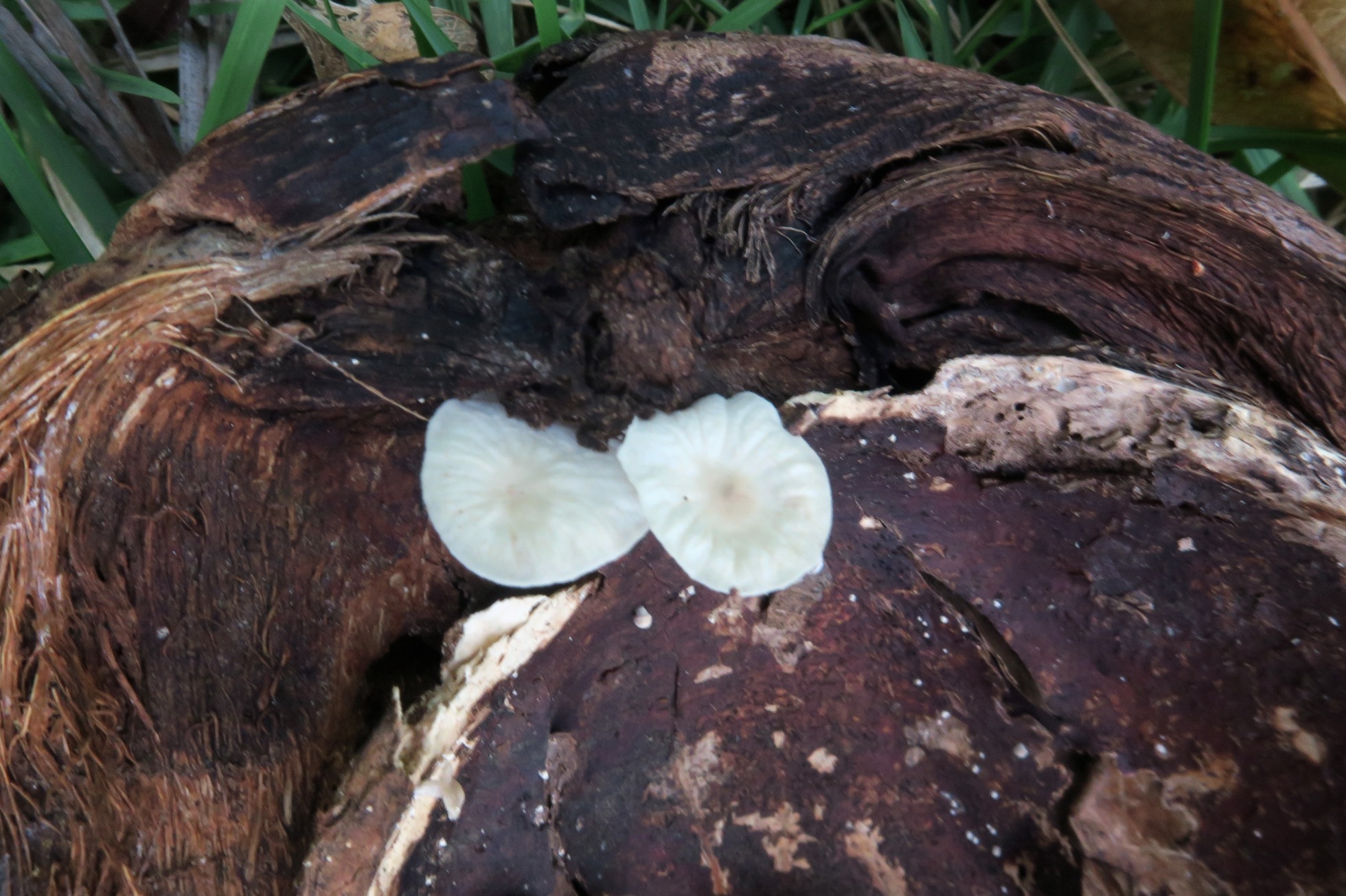 Un Marasmiellus que si bien me había encontrado varias veces en España, esta es la primera vez que me lo encuentro en el Continente Americano y curiosamente sobre un sustrato que me ha dado muchas alegrías en el pasado, sobre restos de cáscaras de coco tenemos el Marasmiellus candidus.