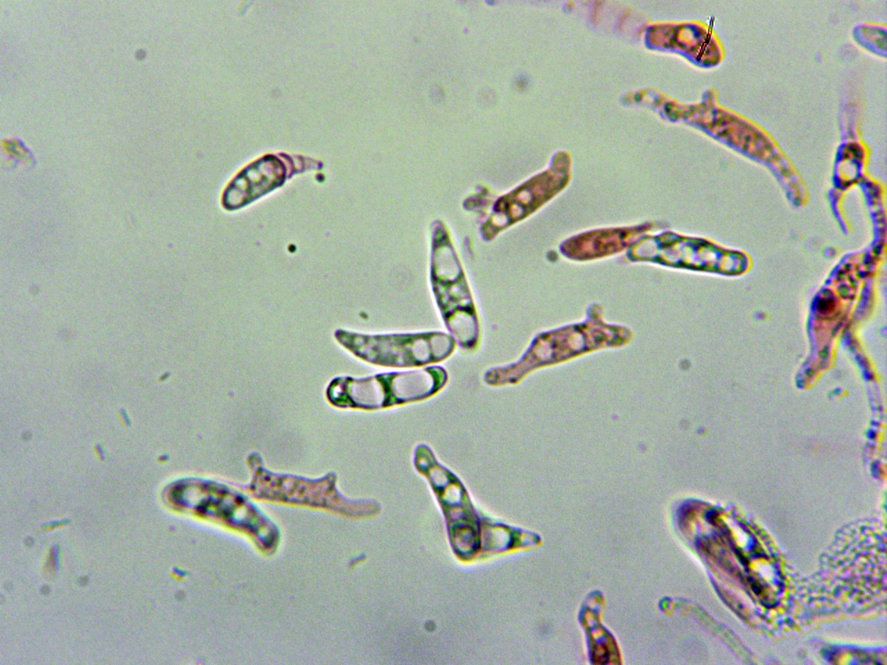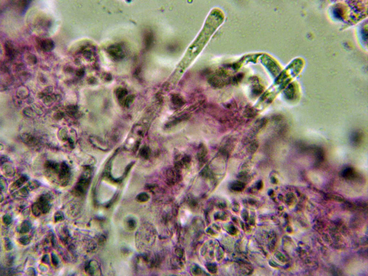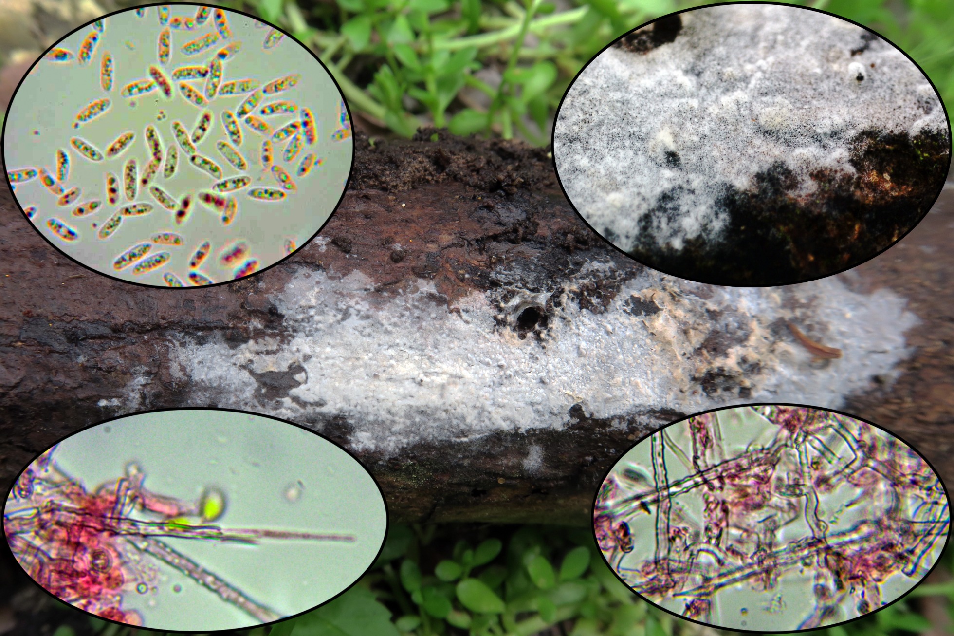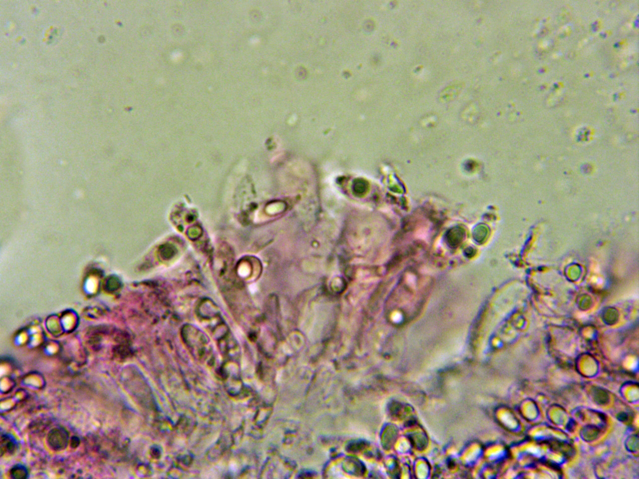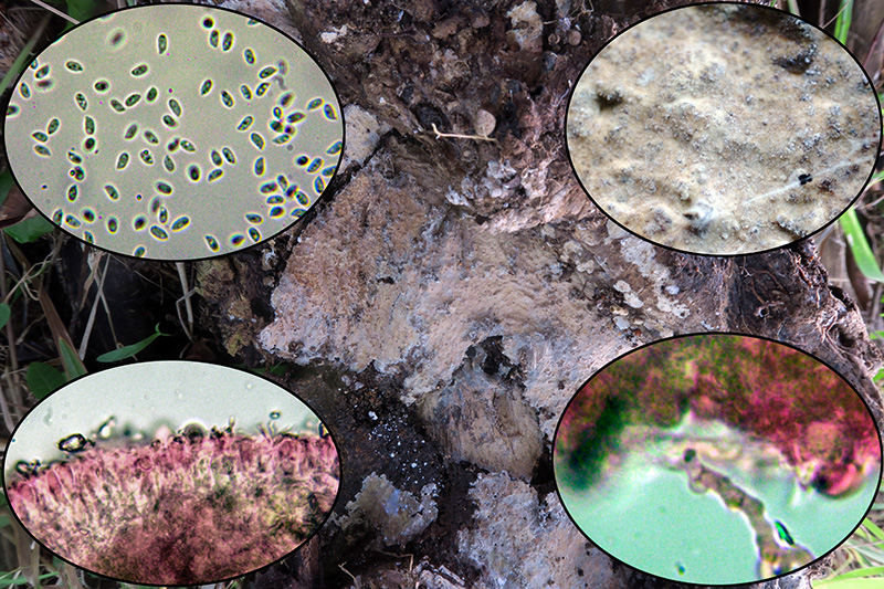 Y para terminar un par de estudios que parecen ser de lo mismo, ambos de un Corticial sobre un tronco de árbol tropical indeterminado, atendiendo a sus cistidios, la presencia de fíbulas y sus medidas esporales, siguiendo las Claves de "Les Champignons de Suisse" llevan a la Phlebia livida, actualmente Mycoacia livida, para la que se indican unas medidas esporales de 4,5-5 x 2-2,5 micras.