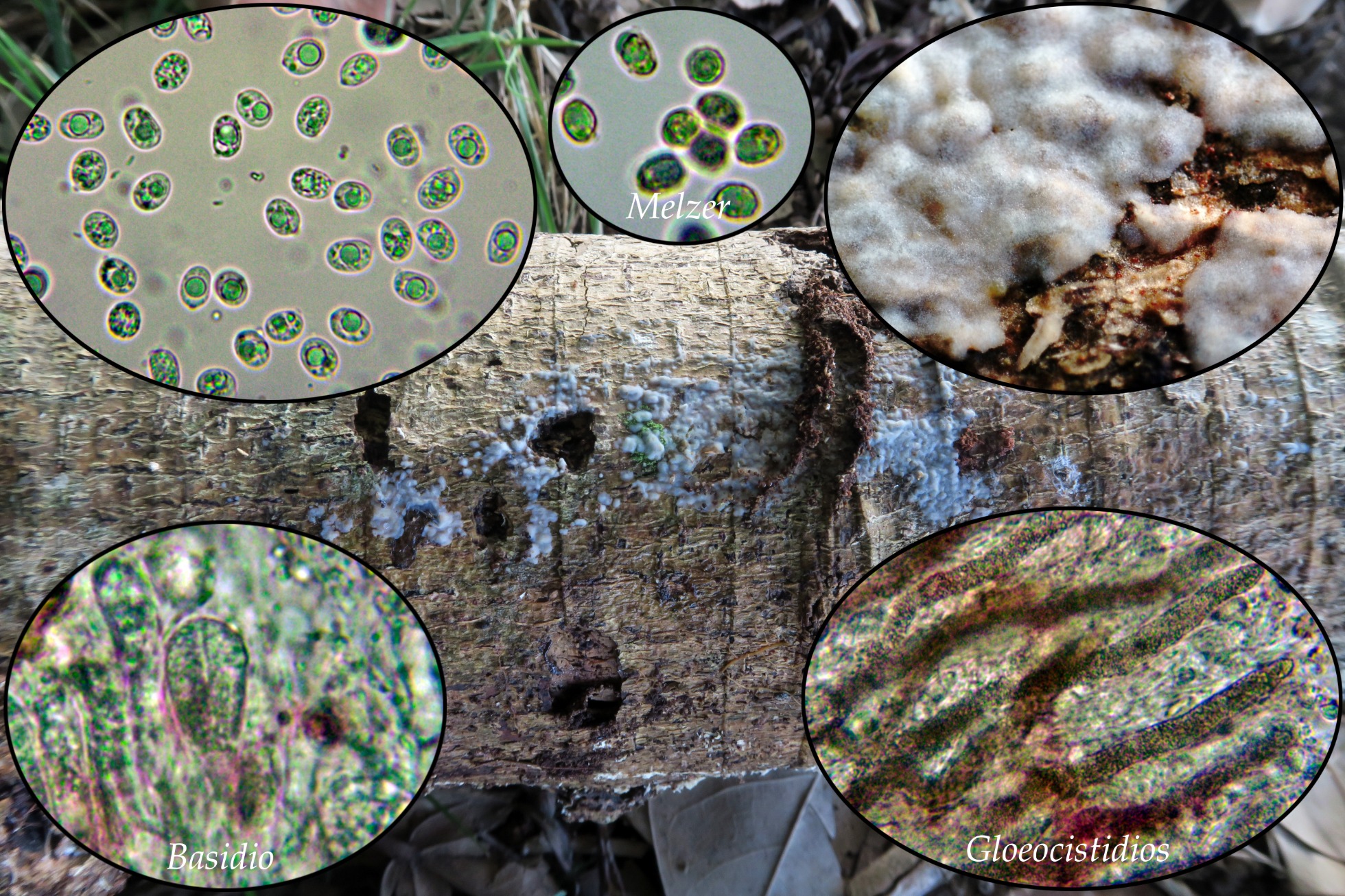 Un Corticial céreo, con basidios tabicados, abundantes gloeocistidios y esporas de considerable tamaño, atendiendo a estos datos todo parece indicar que se trataría de la abundante Exidiopsis galzinii, aunque sería la primera vez que me la encuentro en el Continente Americano.