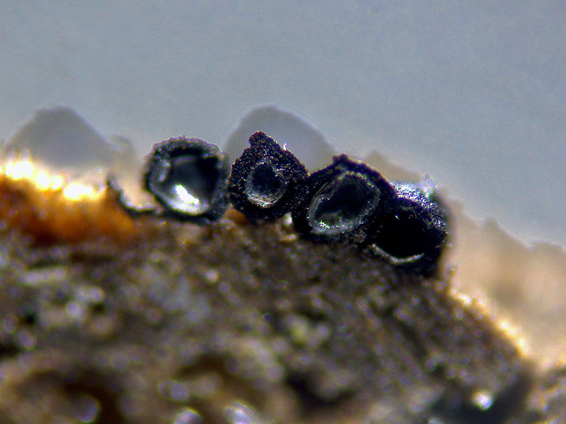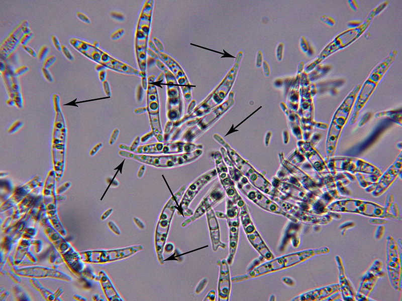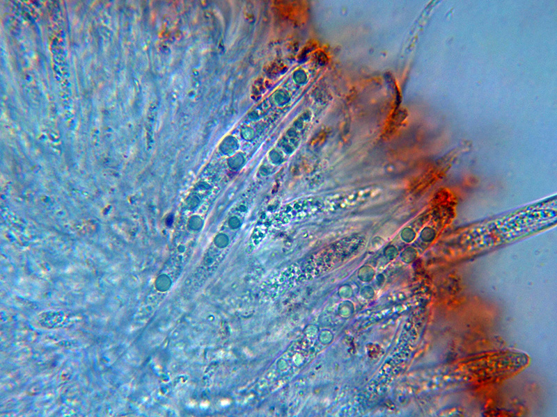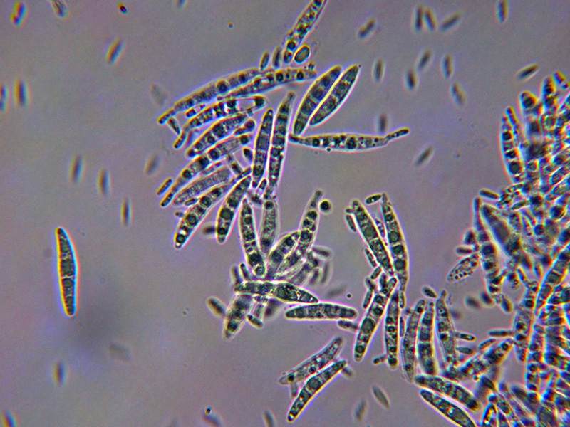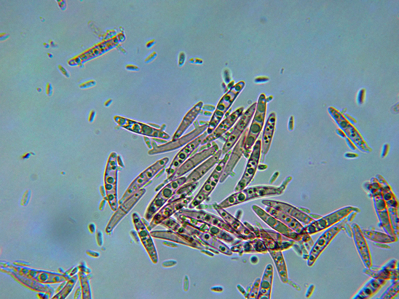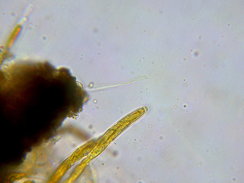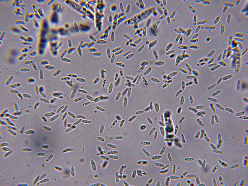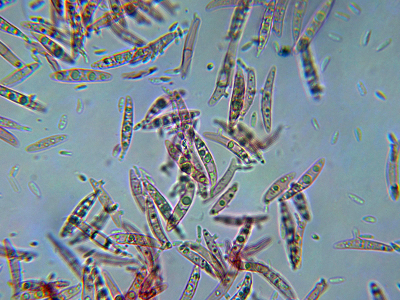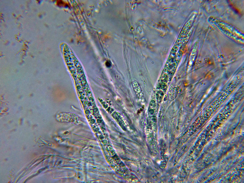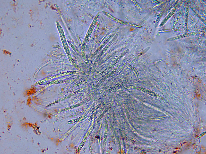A pesar de que los apotecios parecían muertos, solo con hidratarlos a las 24 horas ya habían soltado una gran cantidad de posibles conidios fusiformes, algunos discretamente alantoides, de los que se producen y se desprenden de sus extremos unas pequeñas microsporas.