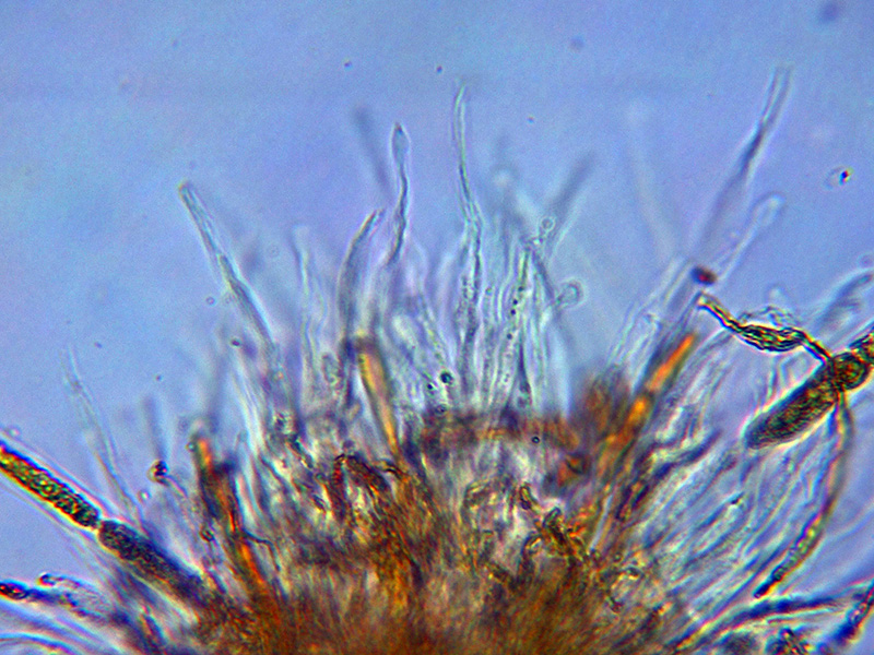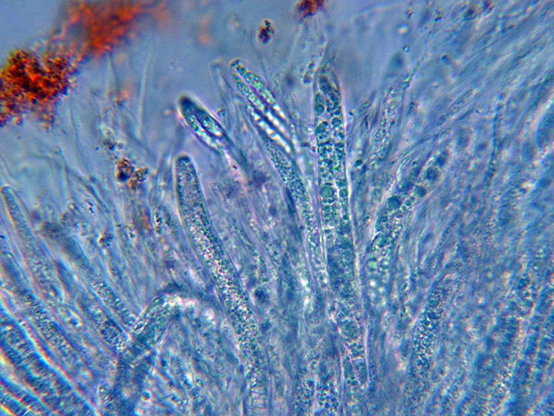 Paráfisis filiformes e hilainas, inamiloides al Melzer que sobresalen poco por encima del nivel de los ascos.