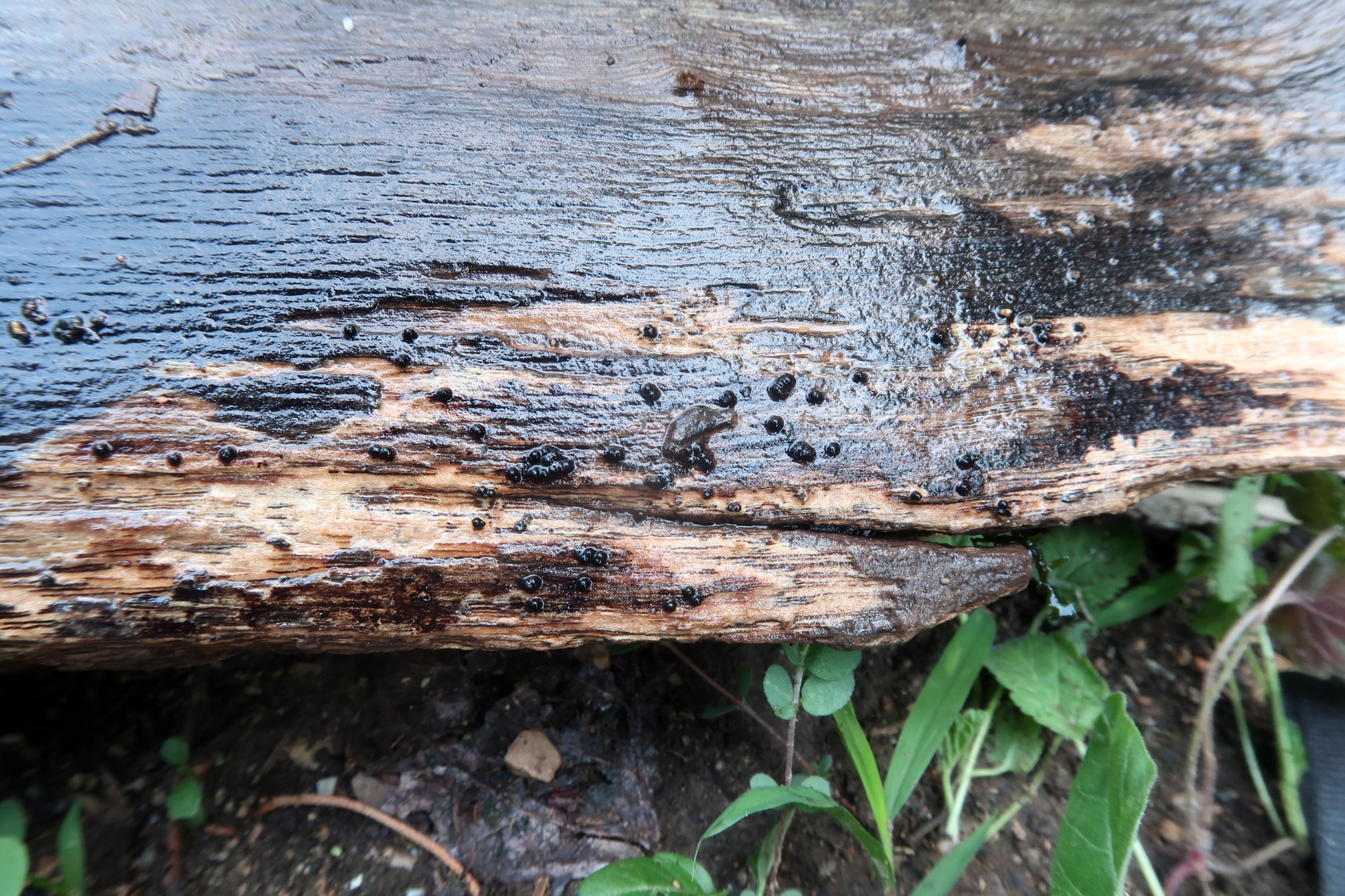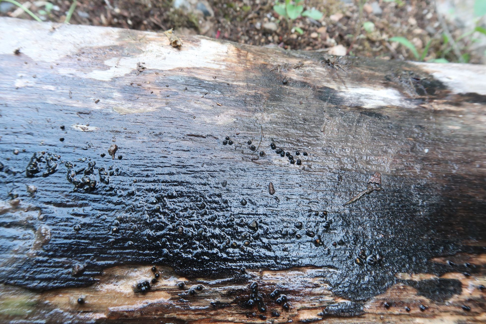 Una Rosellinia localizada este pasado domingo sobre la superficie descortezada de un tronco semisumergido en agua limpia, en cauce fluvial.