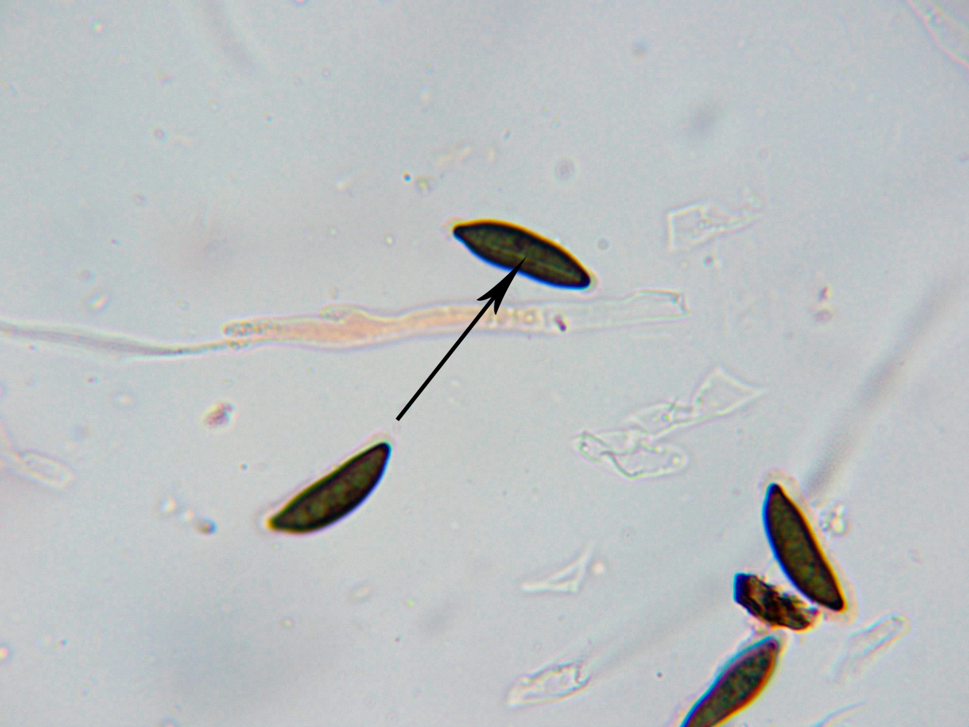 Ascosporas de color marrón oscuro, inequilaterales, mayoritariamente con los extremos que parecen pellizcados, y con una hendidura germinal recta.