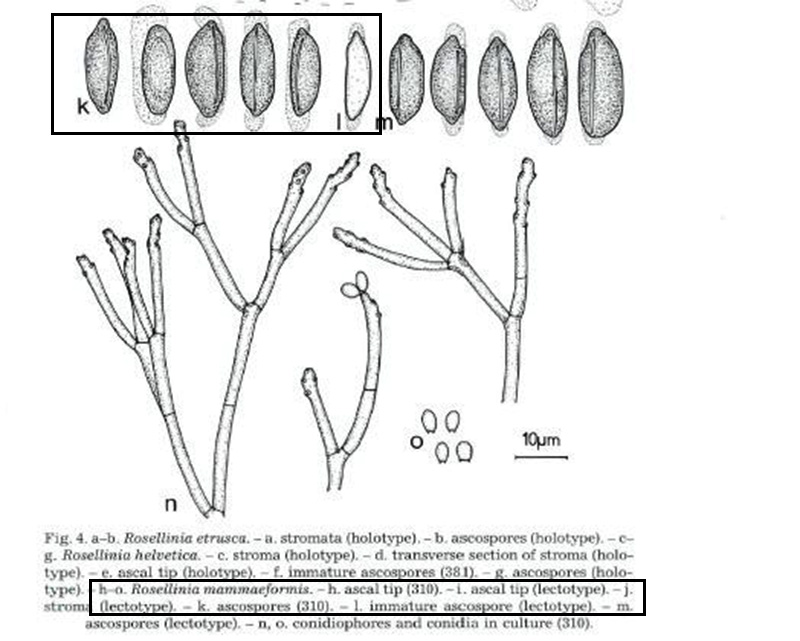 Observaciones: Determinación hecha siguiendo las Claves del género, que por la ausencia de un subículo común, conducen al subgénero Calomastia, que con esporas de 17-21 x 6-7 µm. llevan a la Rosellinia mammaeformis. En las mismas Claves se citan unas medidas de los estromas de 0,7 a 1 mm. de diámetro (0,67 y 0,88 mm. en este estudio)