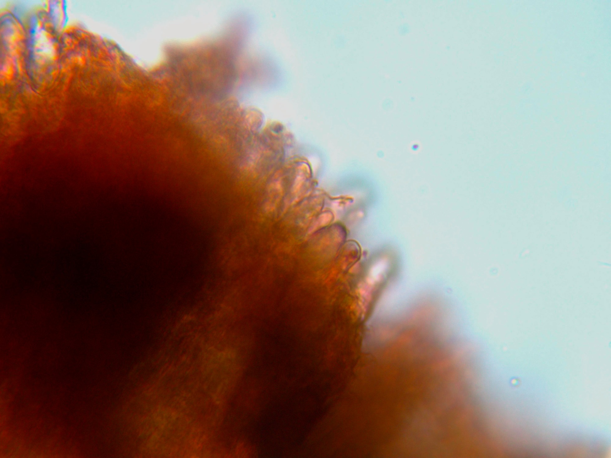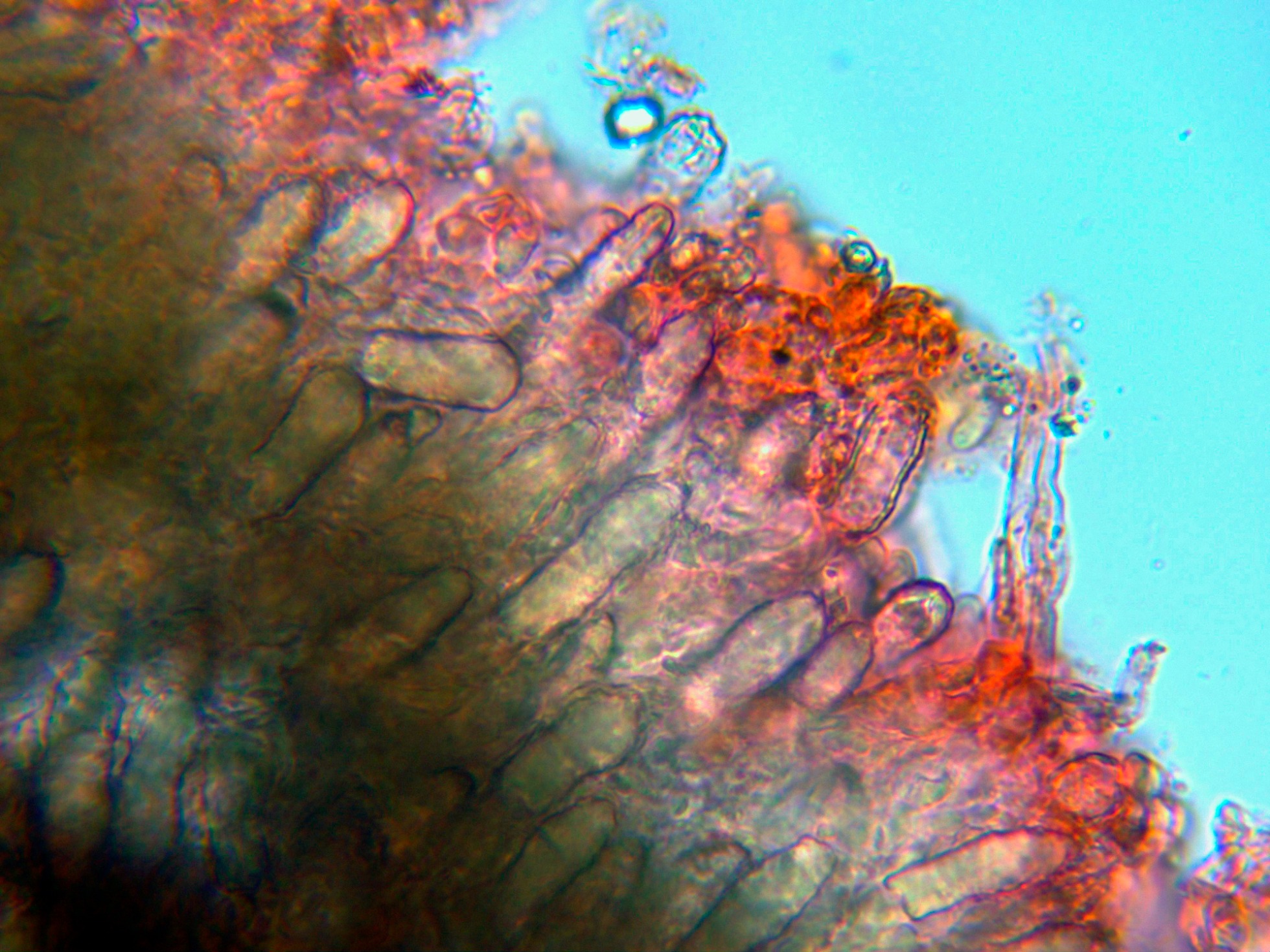 Unas imágenes de la sección a 100 aumentos, en su superficie ya se intuyen los numerosos lamprocistidios que sobresalen por encima del nivel del himenio: