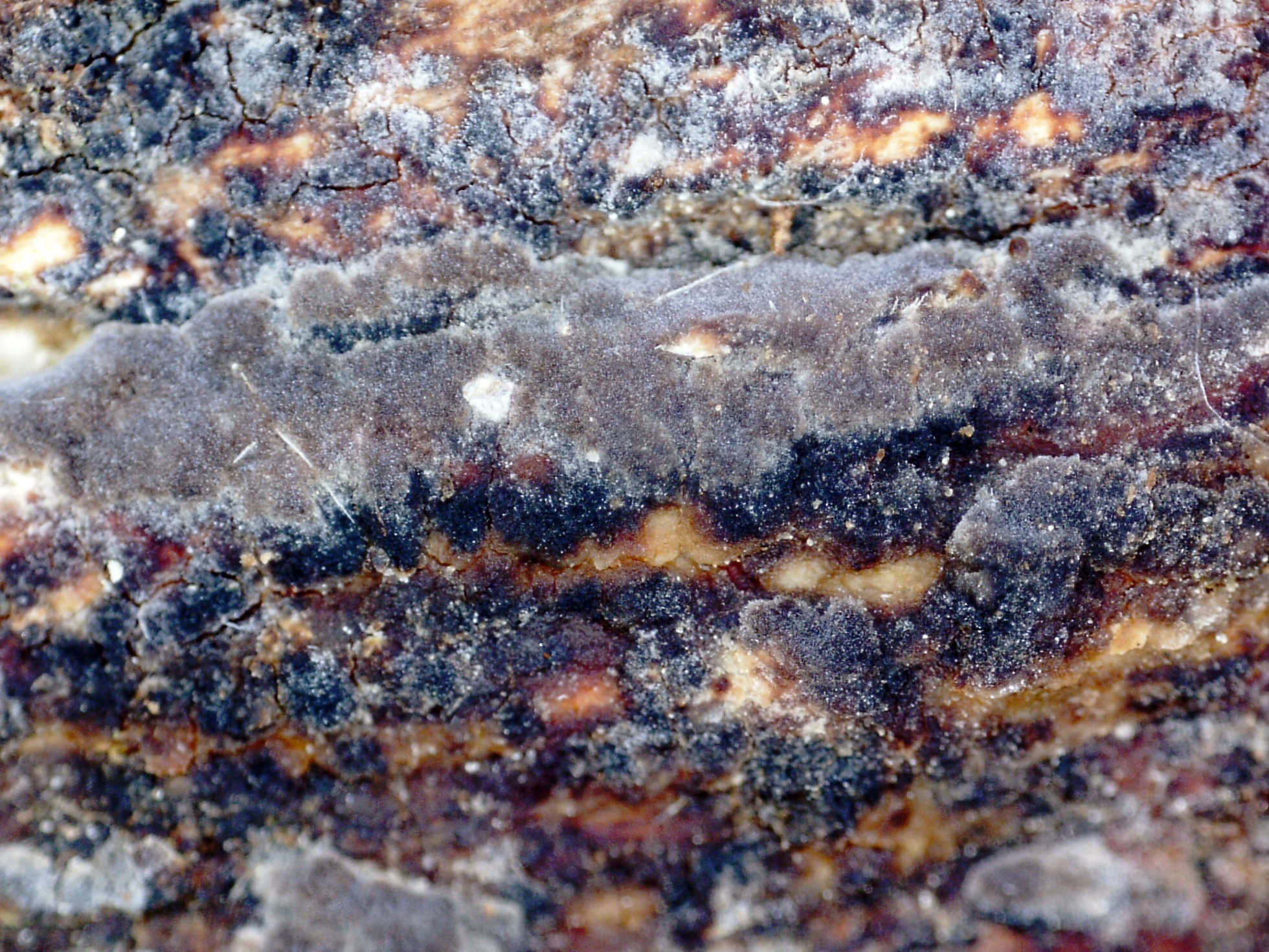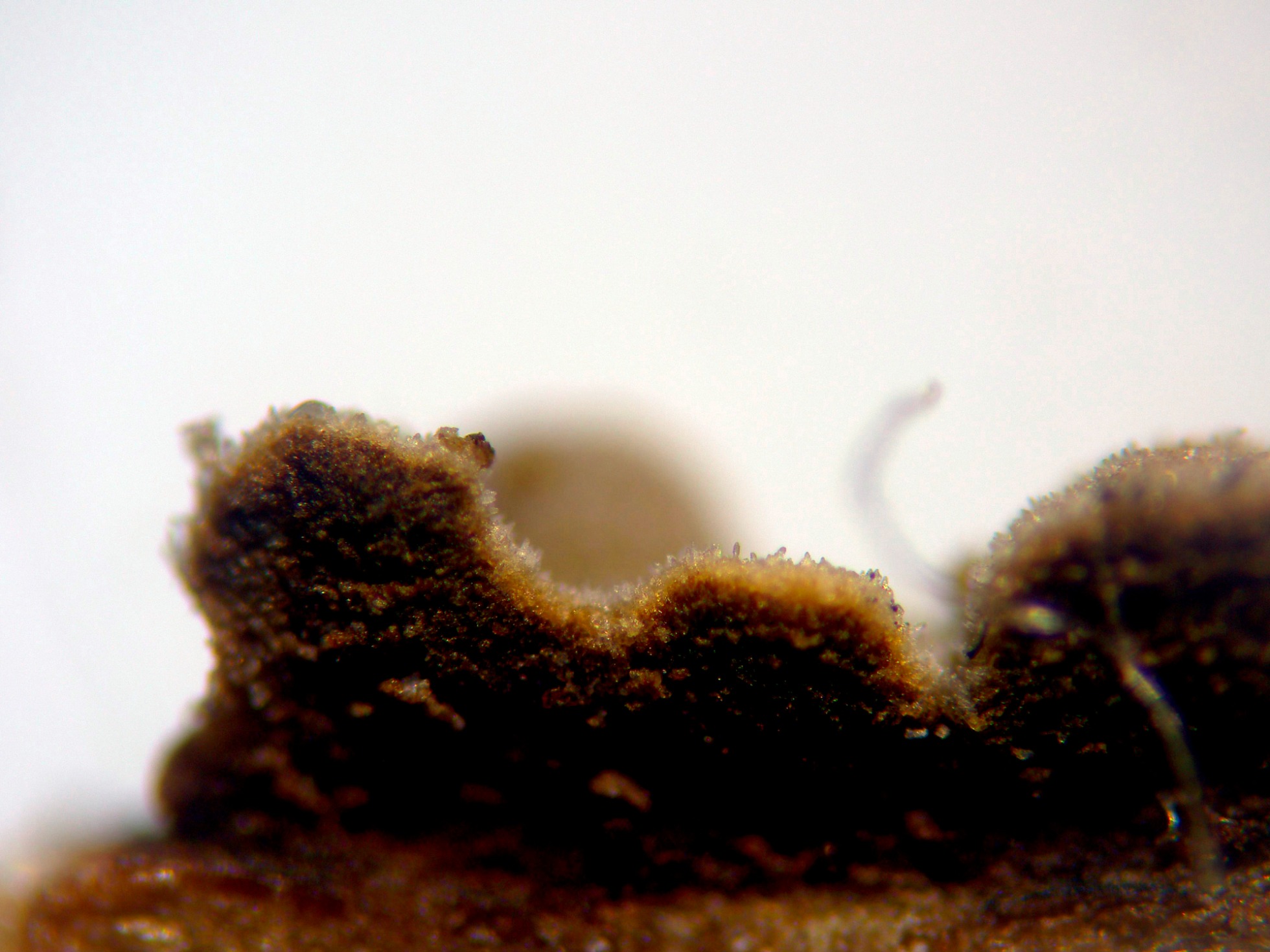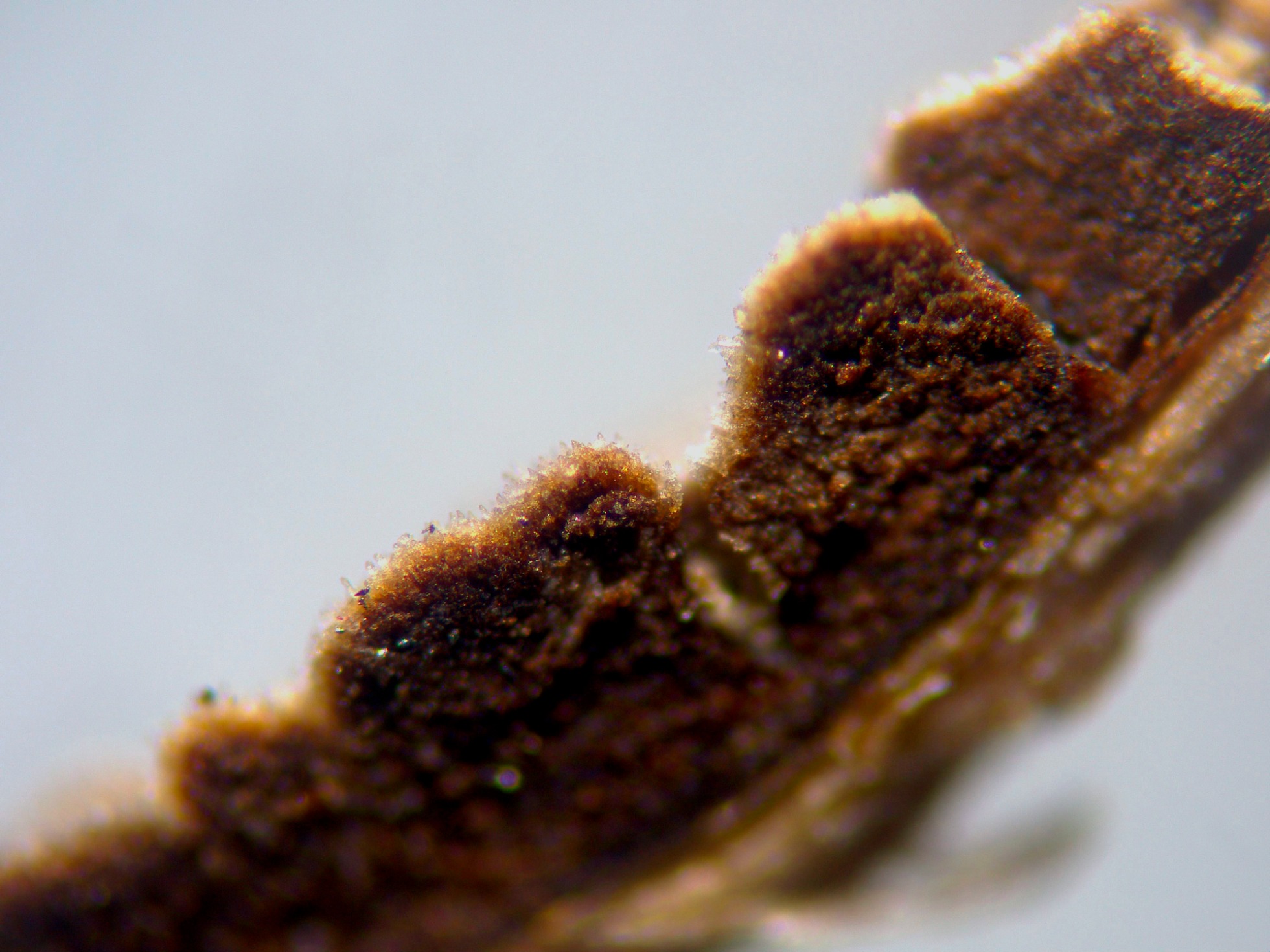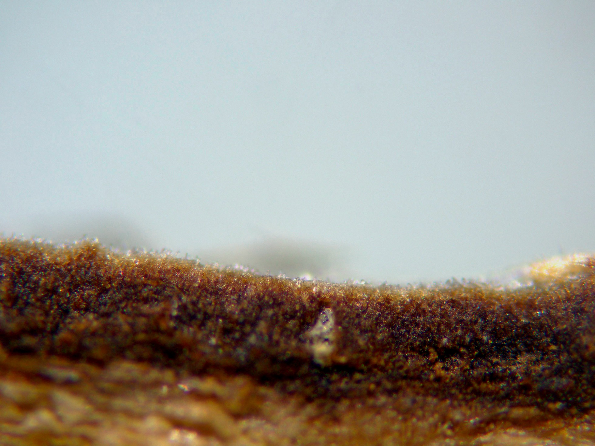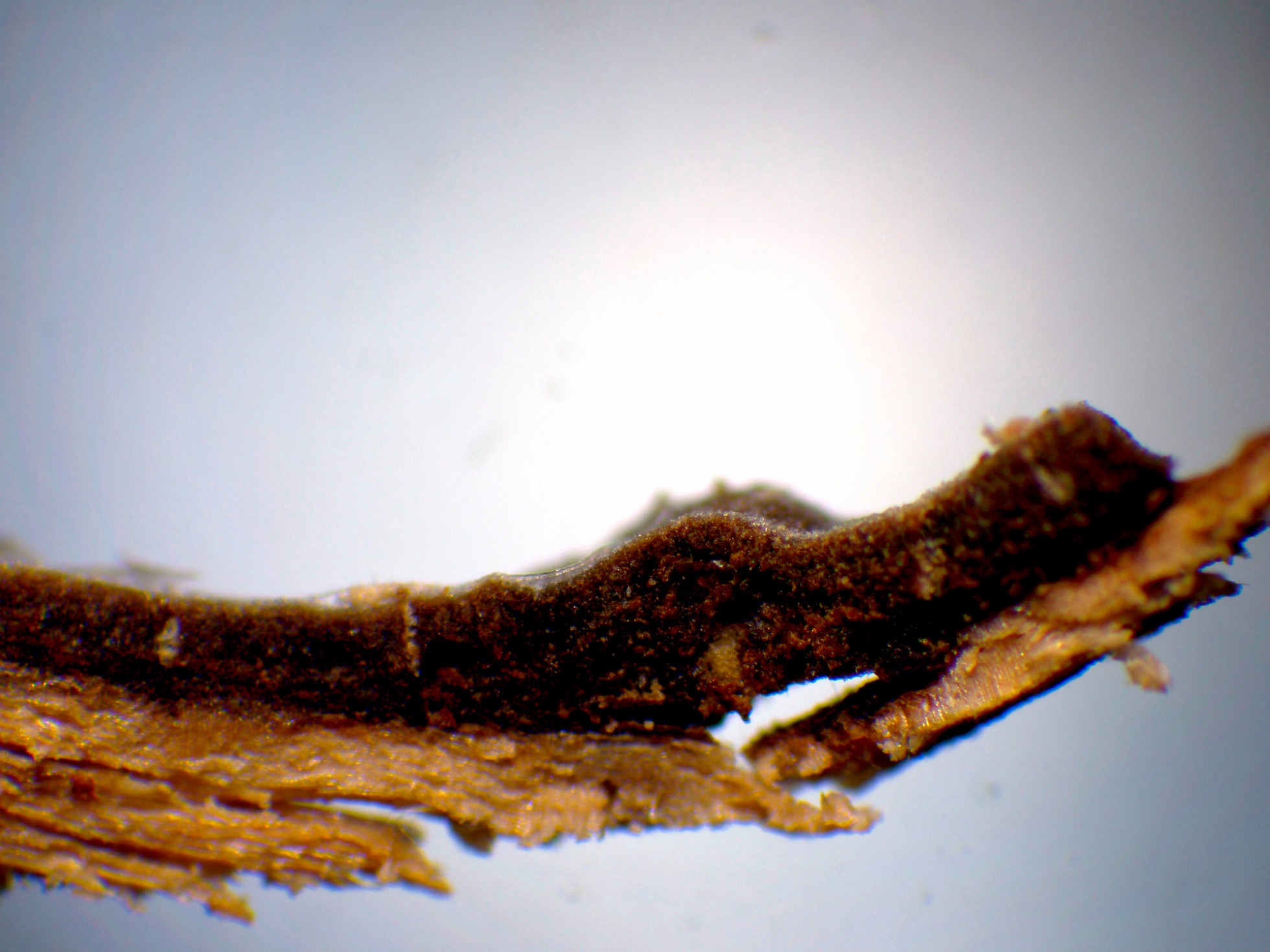 Una imágen de la sección a 40 aumentos, a destacar el poco grosor de las fructificaciones, de menos de 0,1 mm. de espesor.