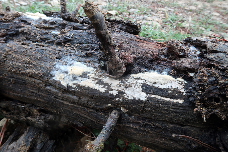 Localizado el pasado domingo sobre la superficie de un tronco de Pinus sylvestris en la parte que está en contacto con el suelo, aunque resulta común que aparezca sobre la madera, también parece ser que puede aparecer directamente sobre el suelo.