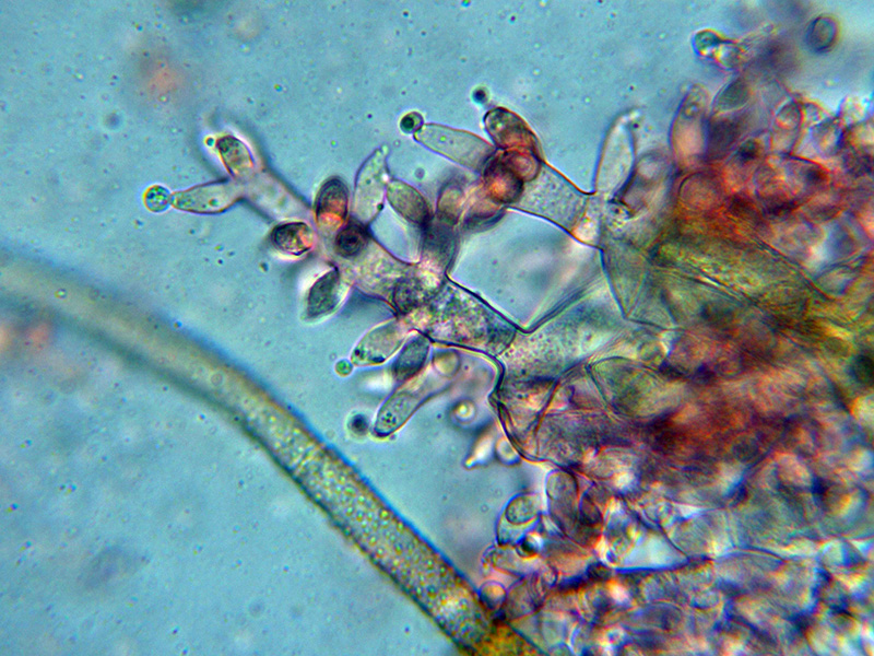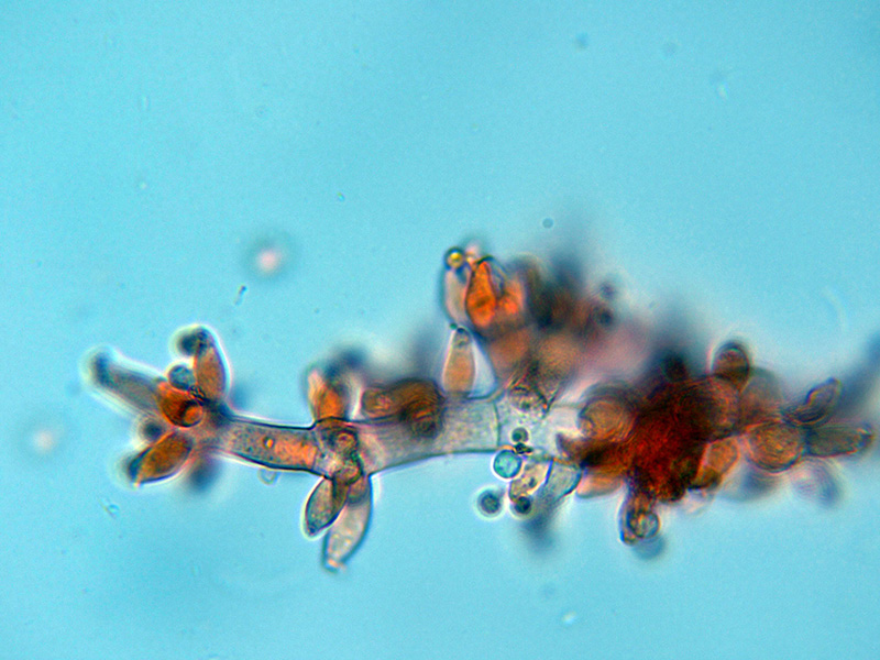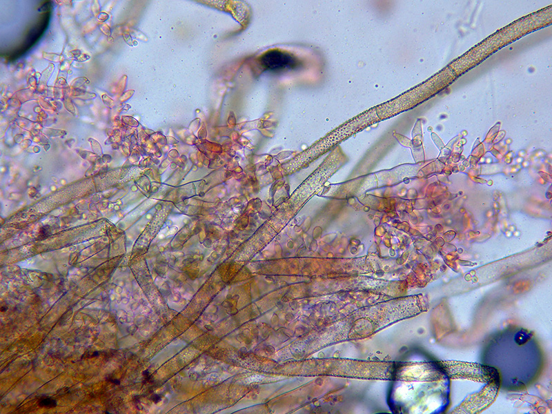 Estas hifas basales terminan en unas hifas conidiógenas o conidióforos, muy abundantes y ramificados: