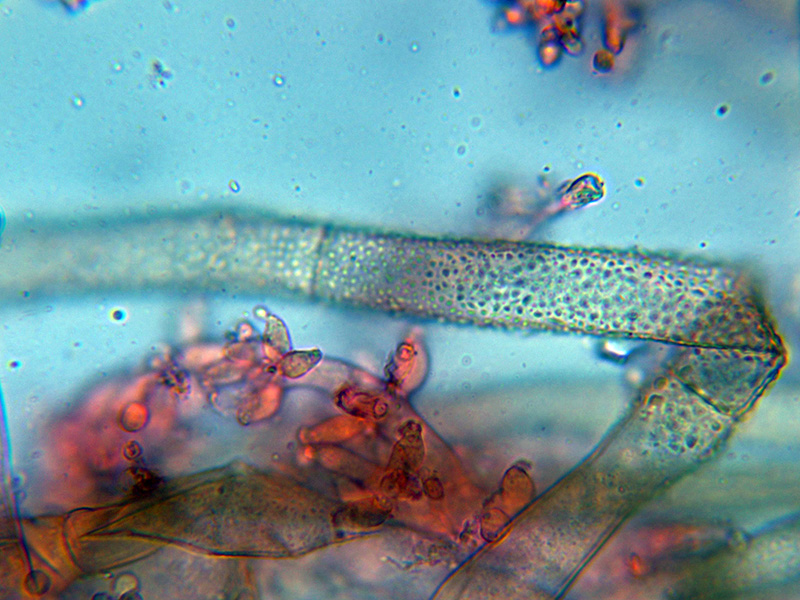 Hifas basales con tabiques simples, pigmentadas de pardo amarillento, ornamentadas con numerosas verrugas de color marón oscuro.