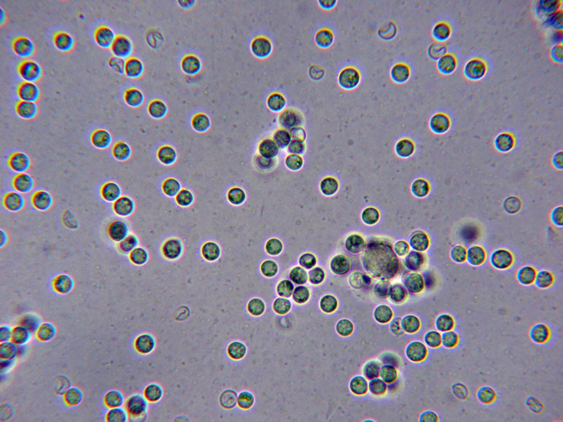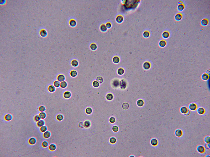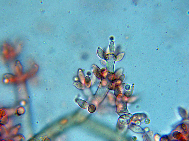 Estos conidióforos producen unos conidios lisos, completamente esféricos, hialinos de pared fina y con unas medidas en agua de: