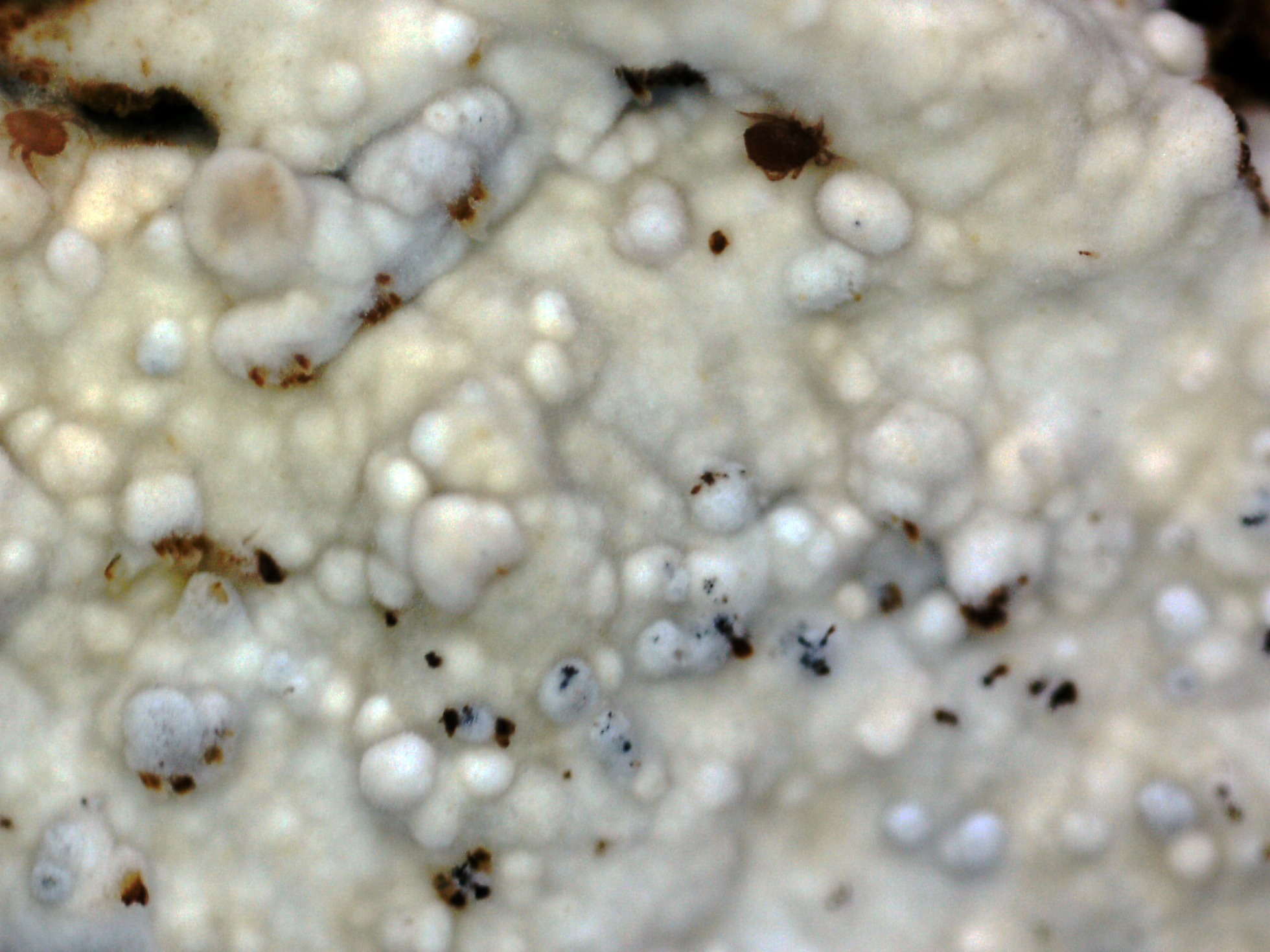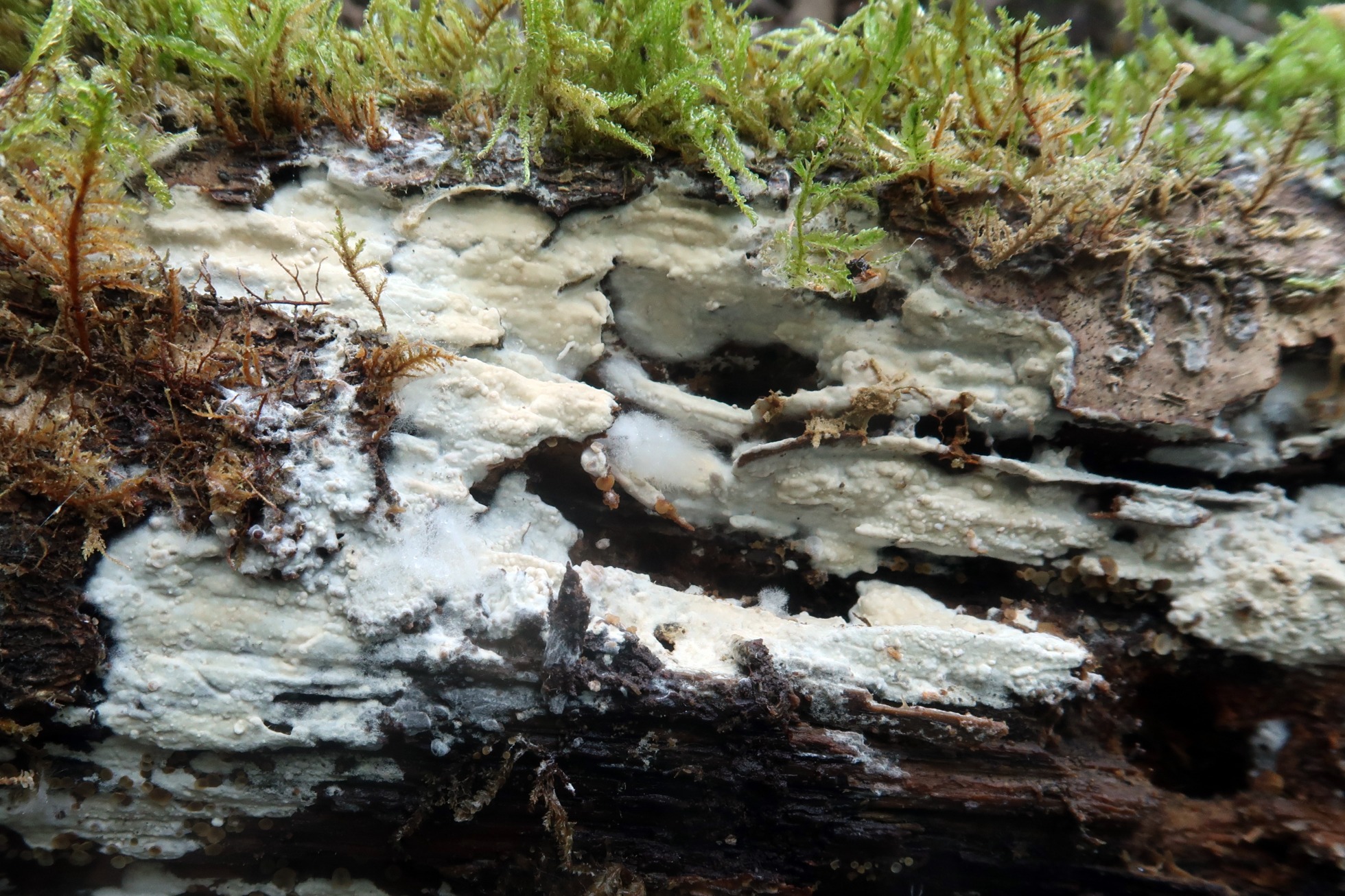 Un Corticial del domingo 4 de Septiembre, en soto fluvial, sobre la superficie de un tronco de planifolio indeterminado en la parte que está en contacto con el suelo, probablemente Gloeocystidiellum luridum.