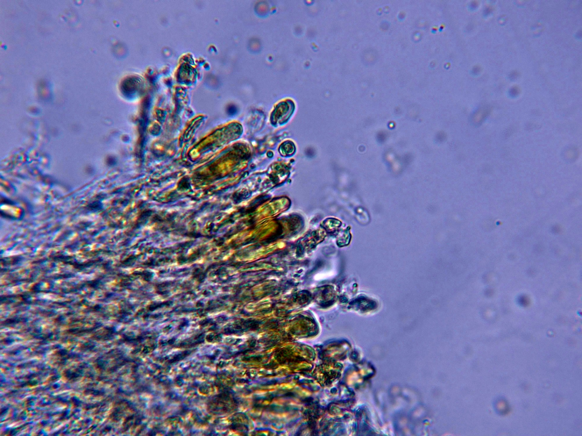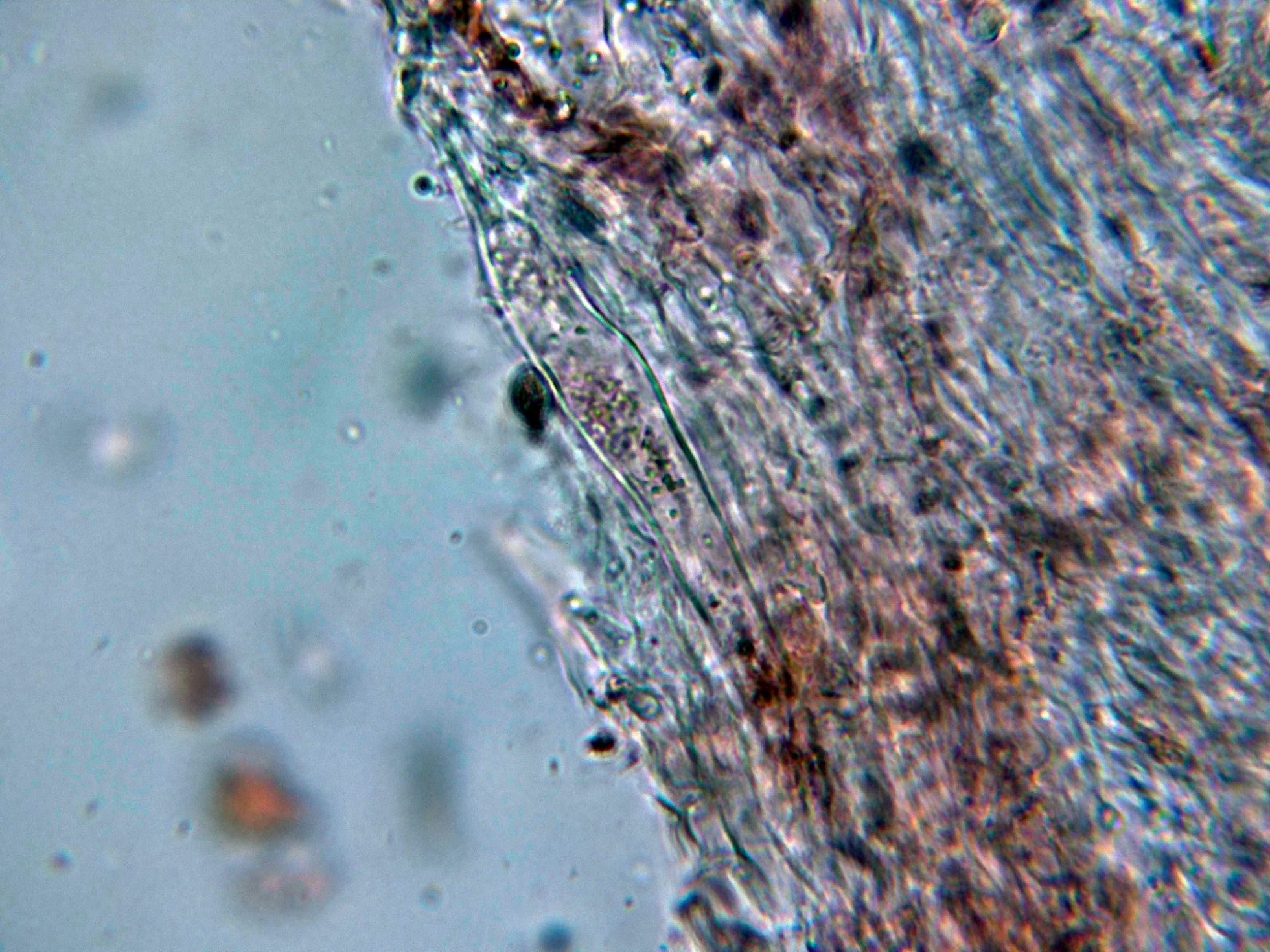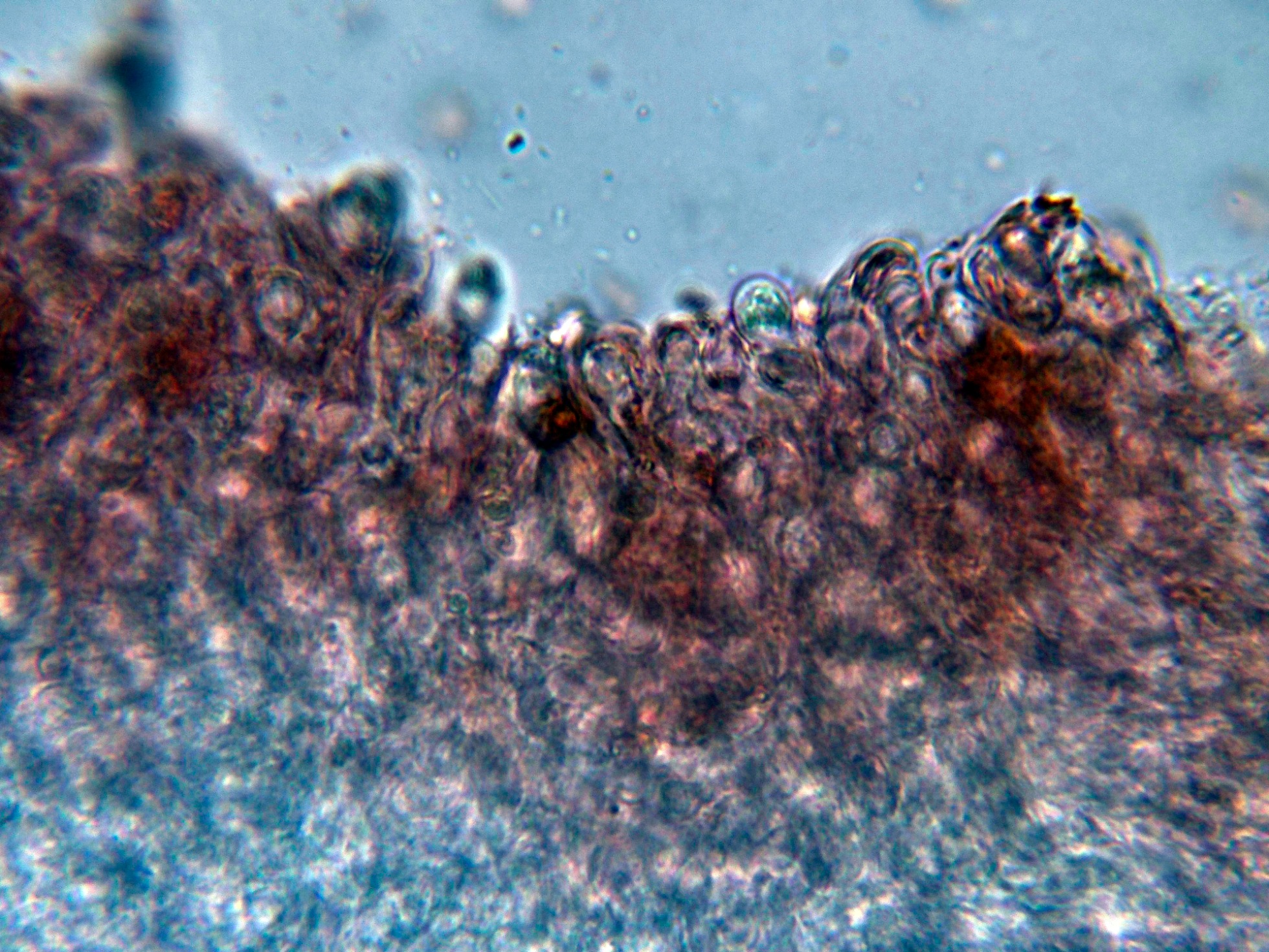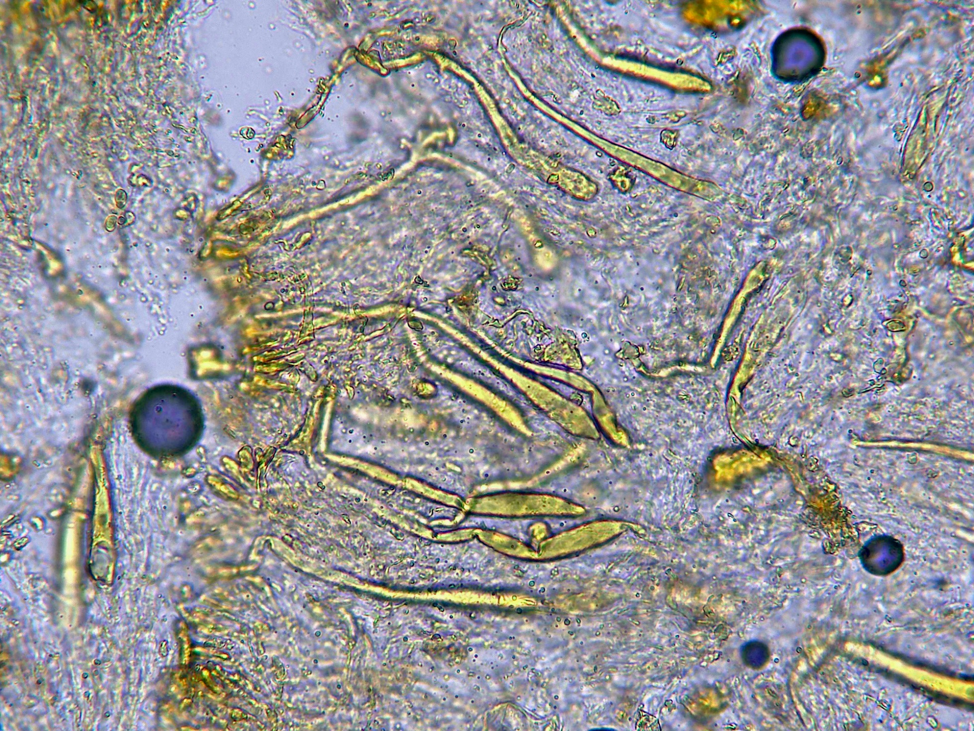 Himenio a 400 aumentos en Reactivo de Melzer, en él ya se pueden observar los numerosos gloeocistidios inmersos: