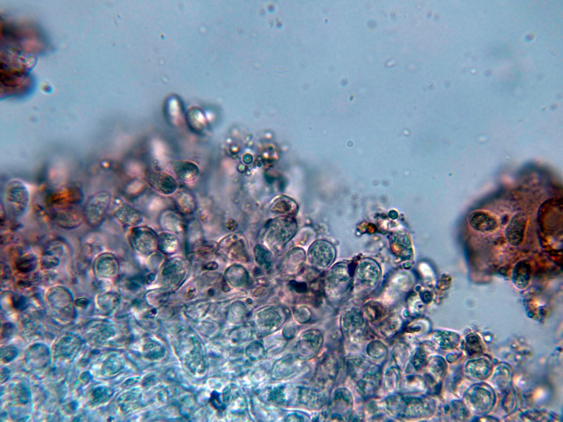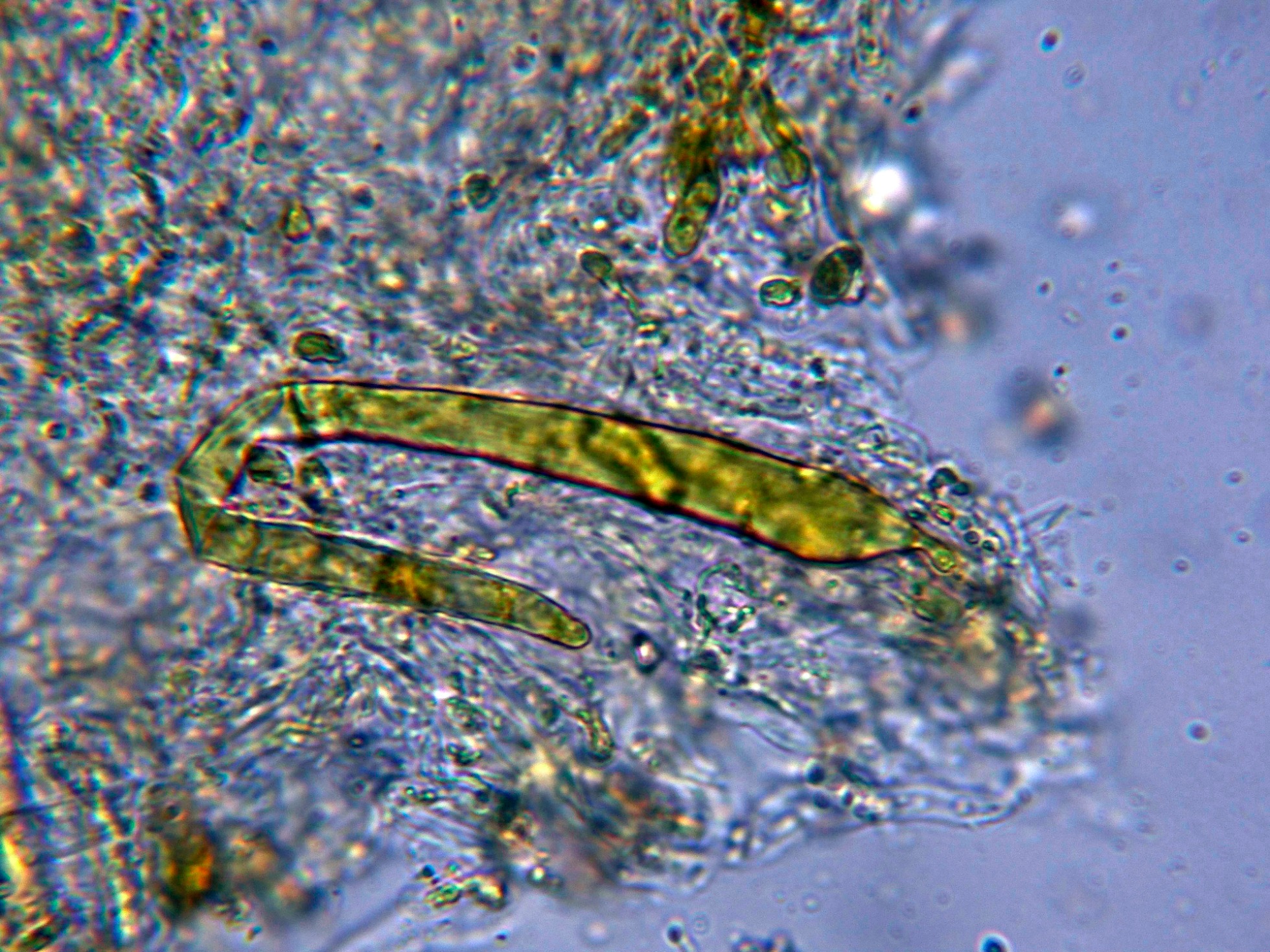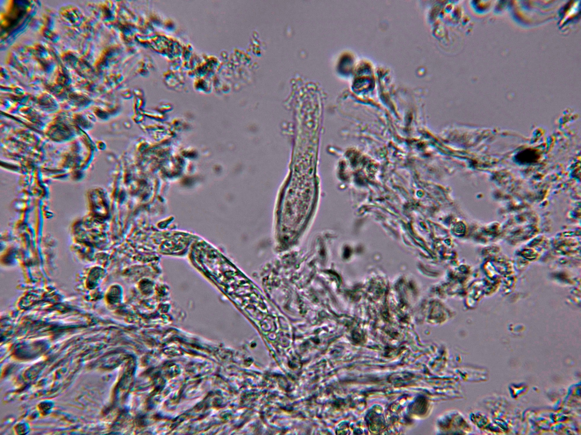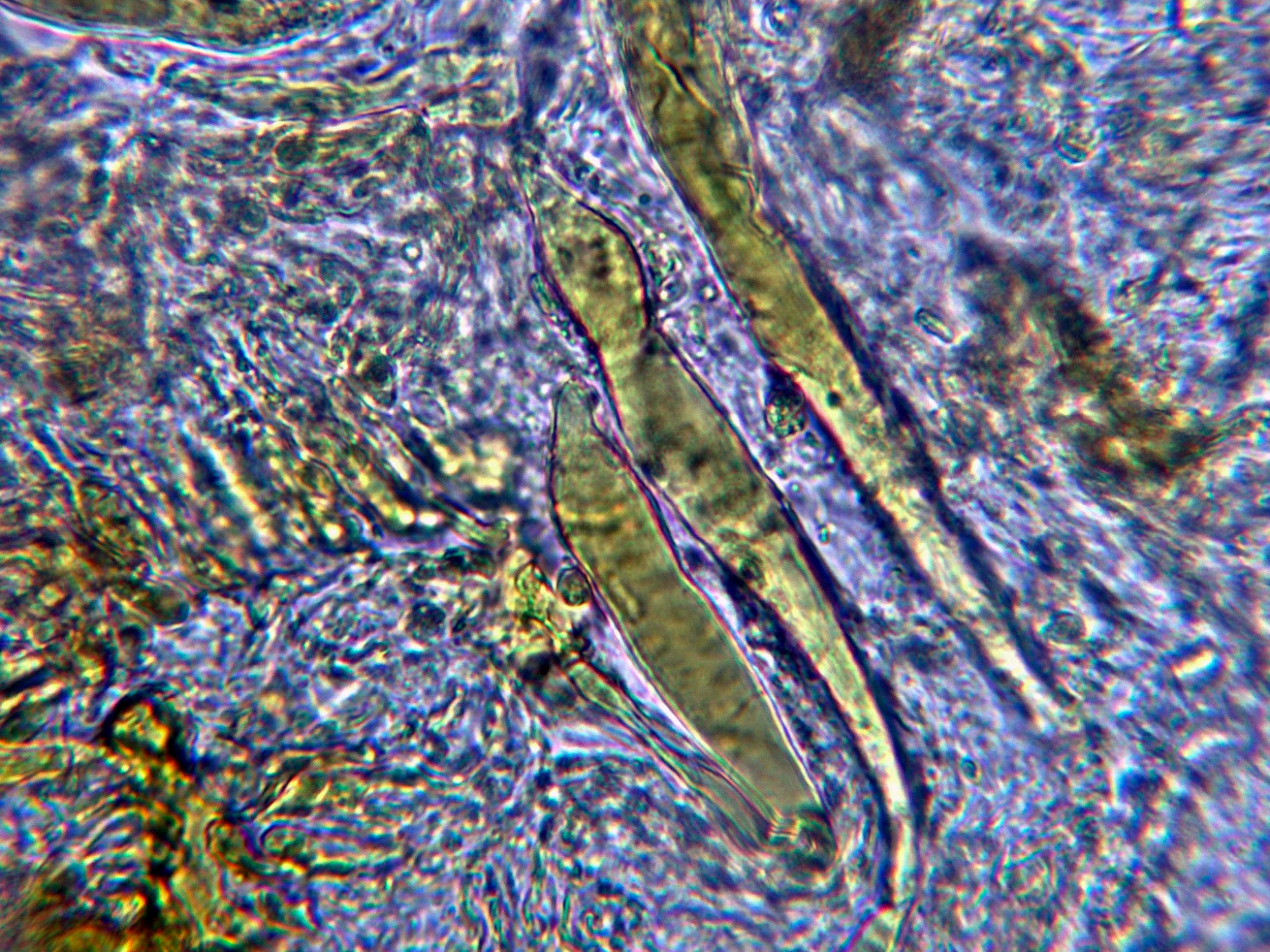 Himenio a 400 aumentos en Reactivo de Melzer, en él ya se pueden observar los numerosos gloeocistidios inmersos:
