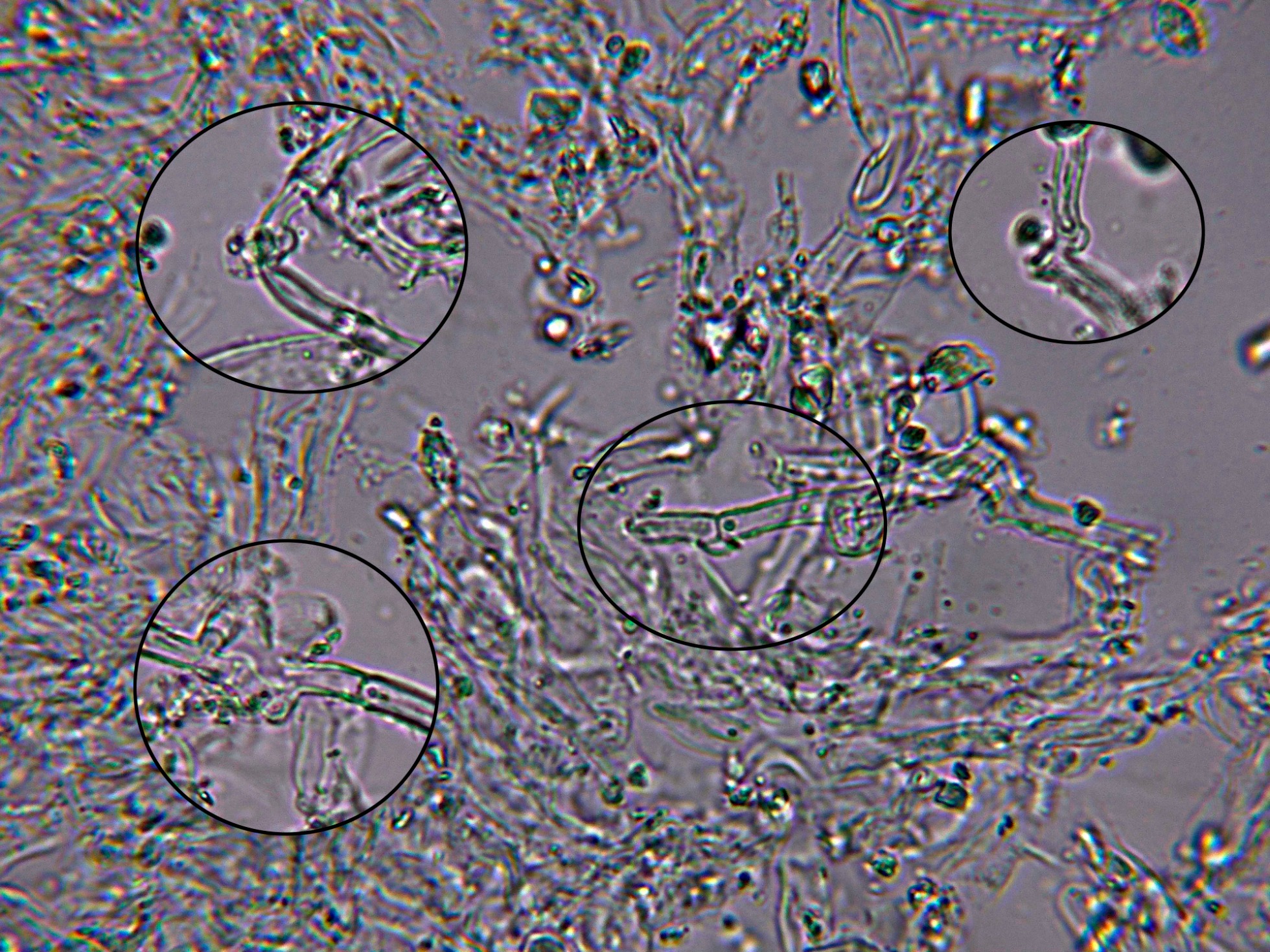 Al contrastar este estudio con la opinión de "Les Champignons de Suisse" encontré una cierta diferencia en cuanto al tamaño esporal, en la misma fuente se indica unas esporas para el Gloeocystidiellum luridum con un tamaño de 7-10,5 x 4-5,3 um, estas medidas por encima de mi estudio, es por lo que decidí probar de nuevo con el Rojo Congo diluido: