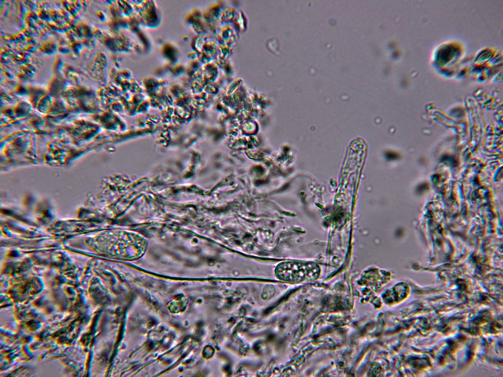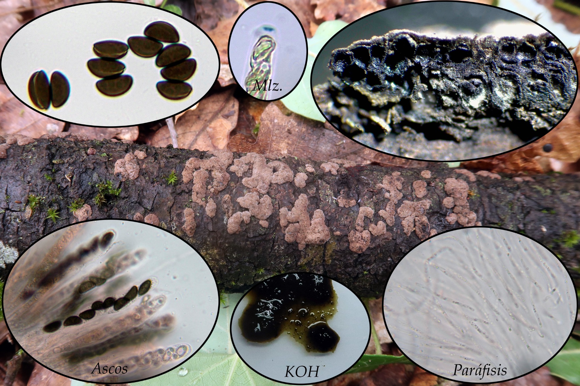 Un Hypoxylon, con aparato apical discoide y amiloide, con pigmento extraíble en KOH de color sepia verdoso, con esporas marrón oscuro, inequilaterales , estas esporas con hendidura germinal algo sigmoide, muy probablemente el Hypoxylon fuscum.