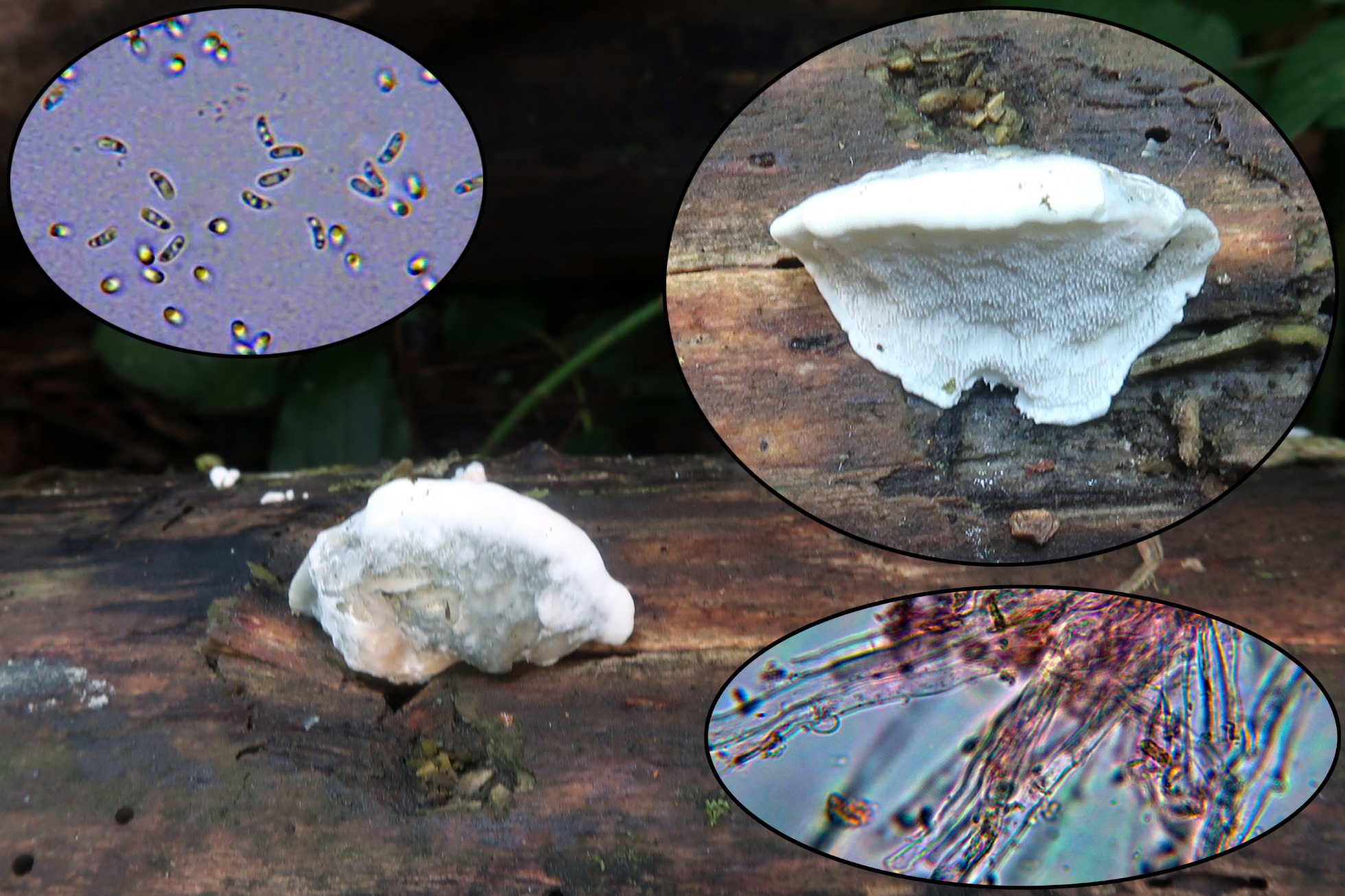 Una Postia fuertemente azuleante, por su pequeño tamaño esporal lo más probable es que se trate de la Postia caesia.