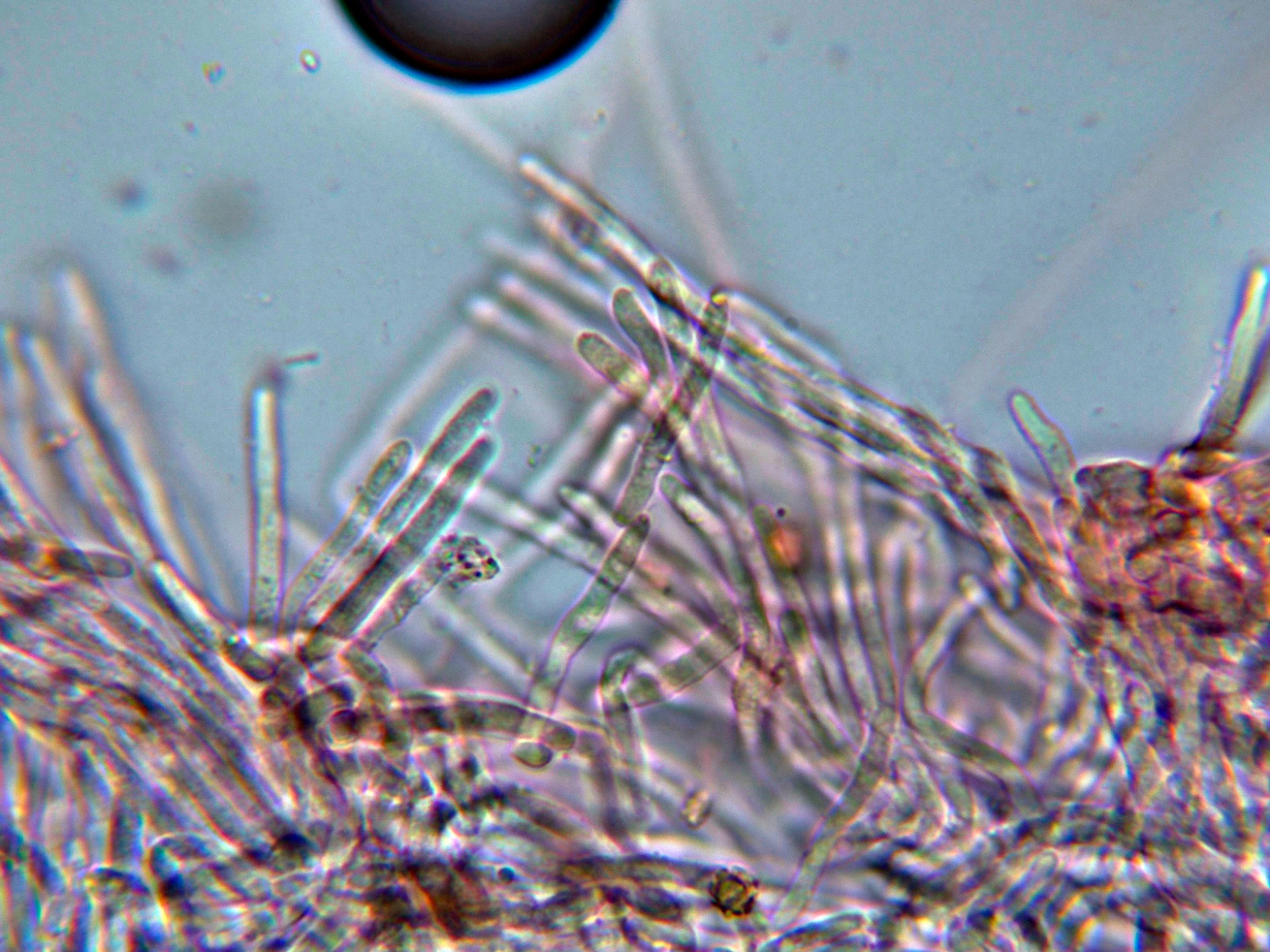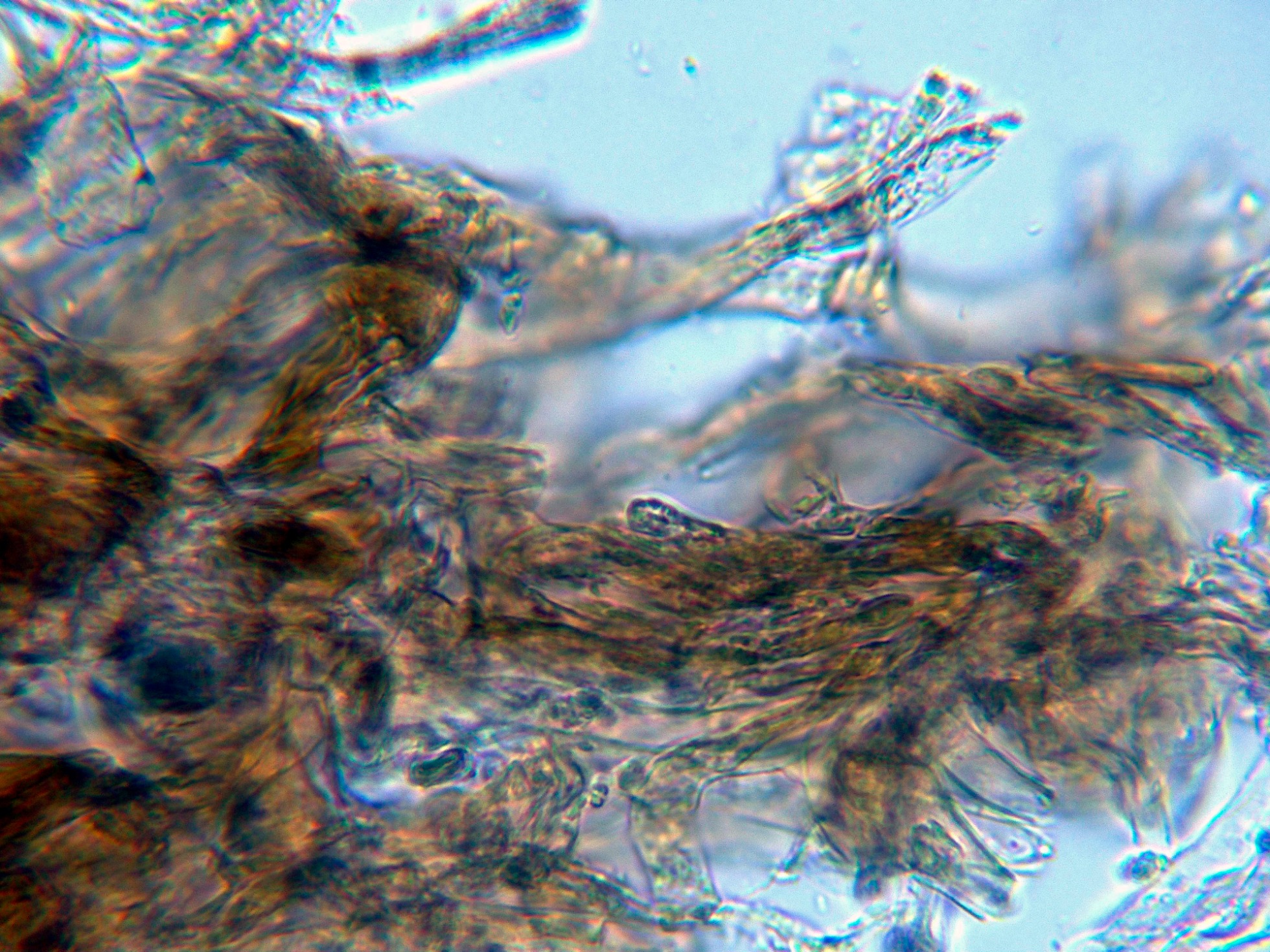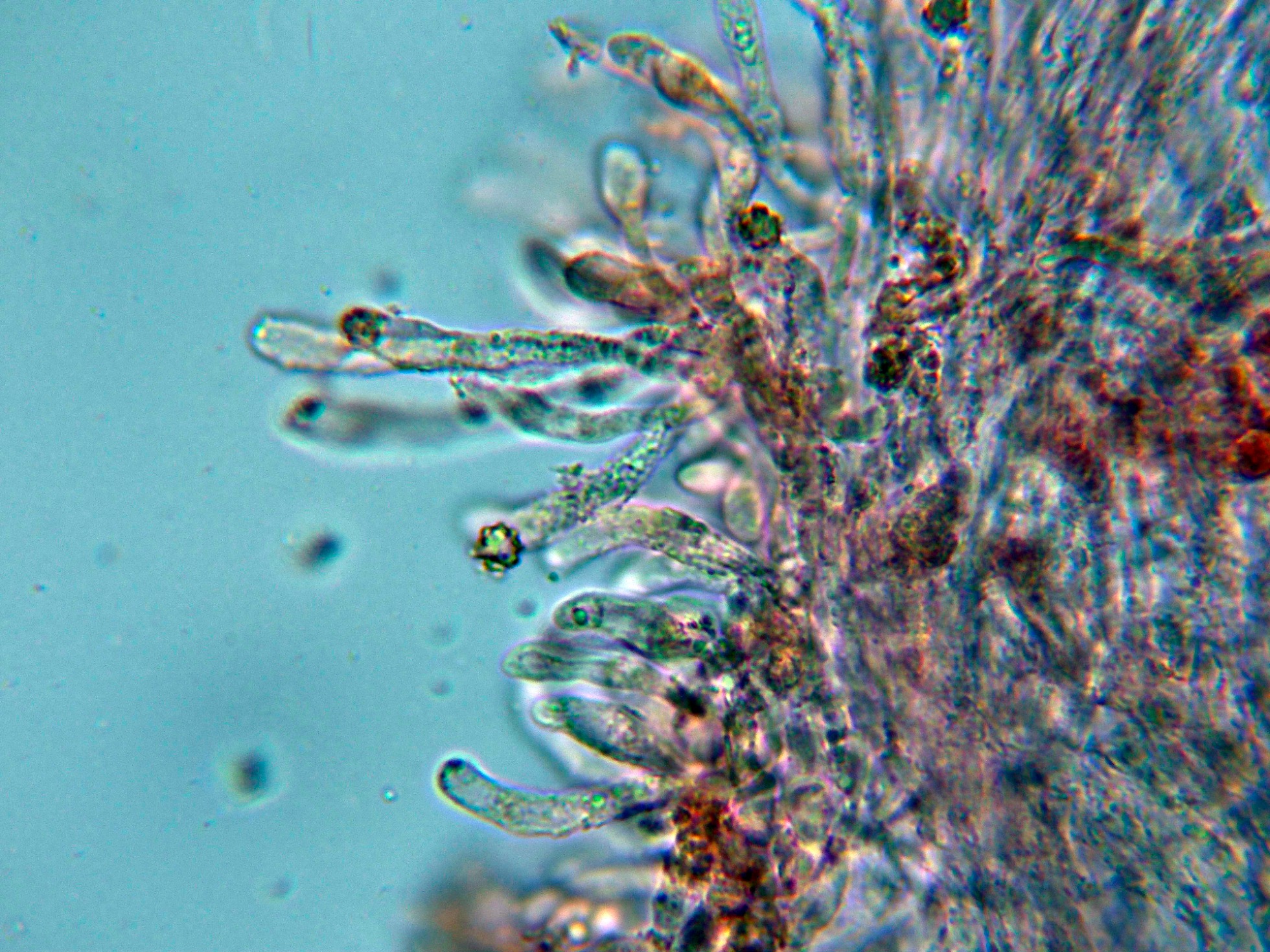 Aunque no se citan cistidios para la especie, si que pude observar unas hifas terminales en los extremos de los acúleos a modo de pelos: