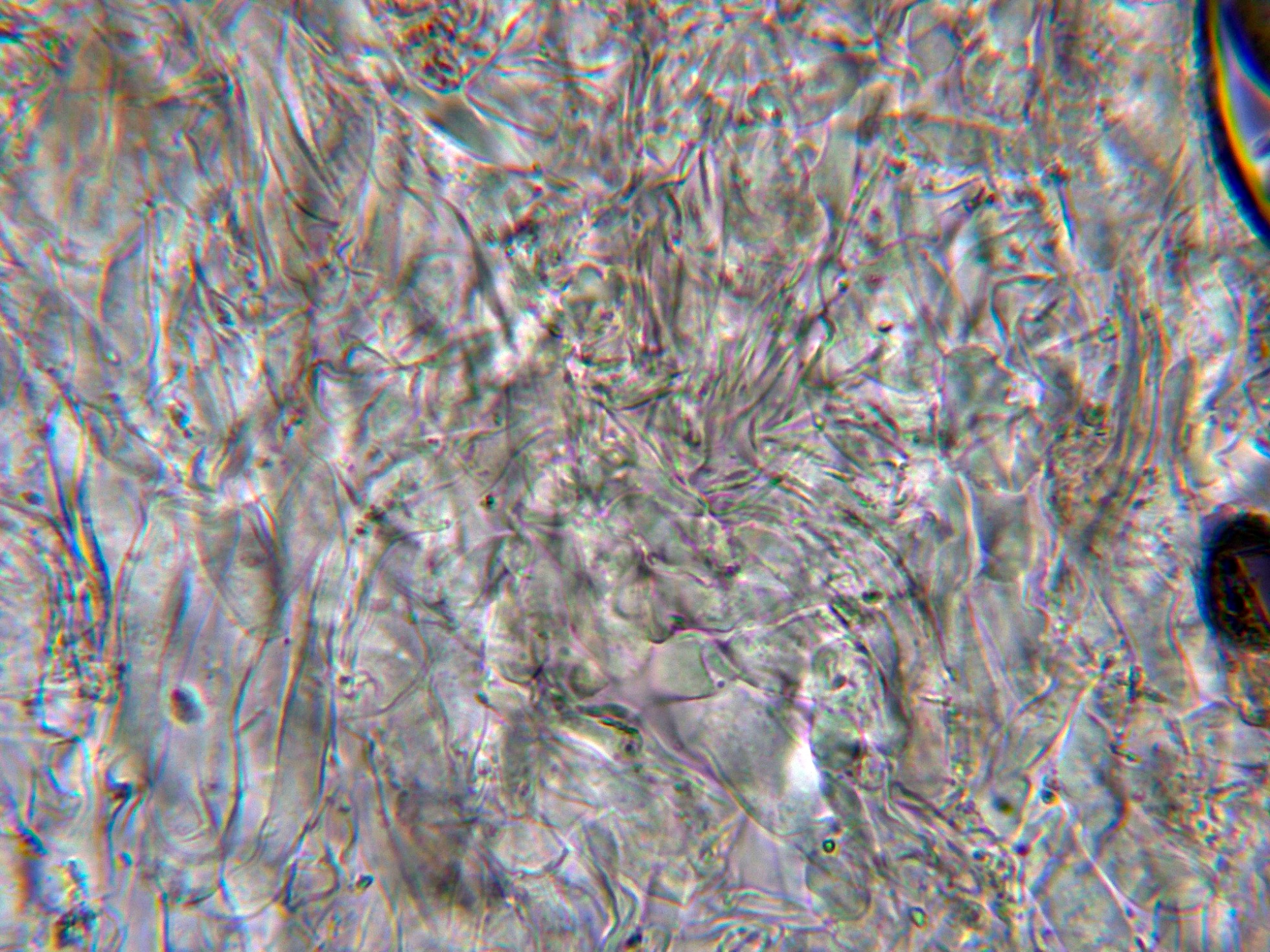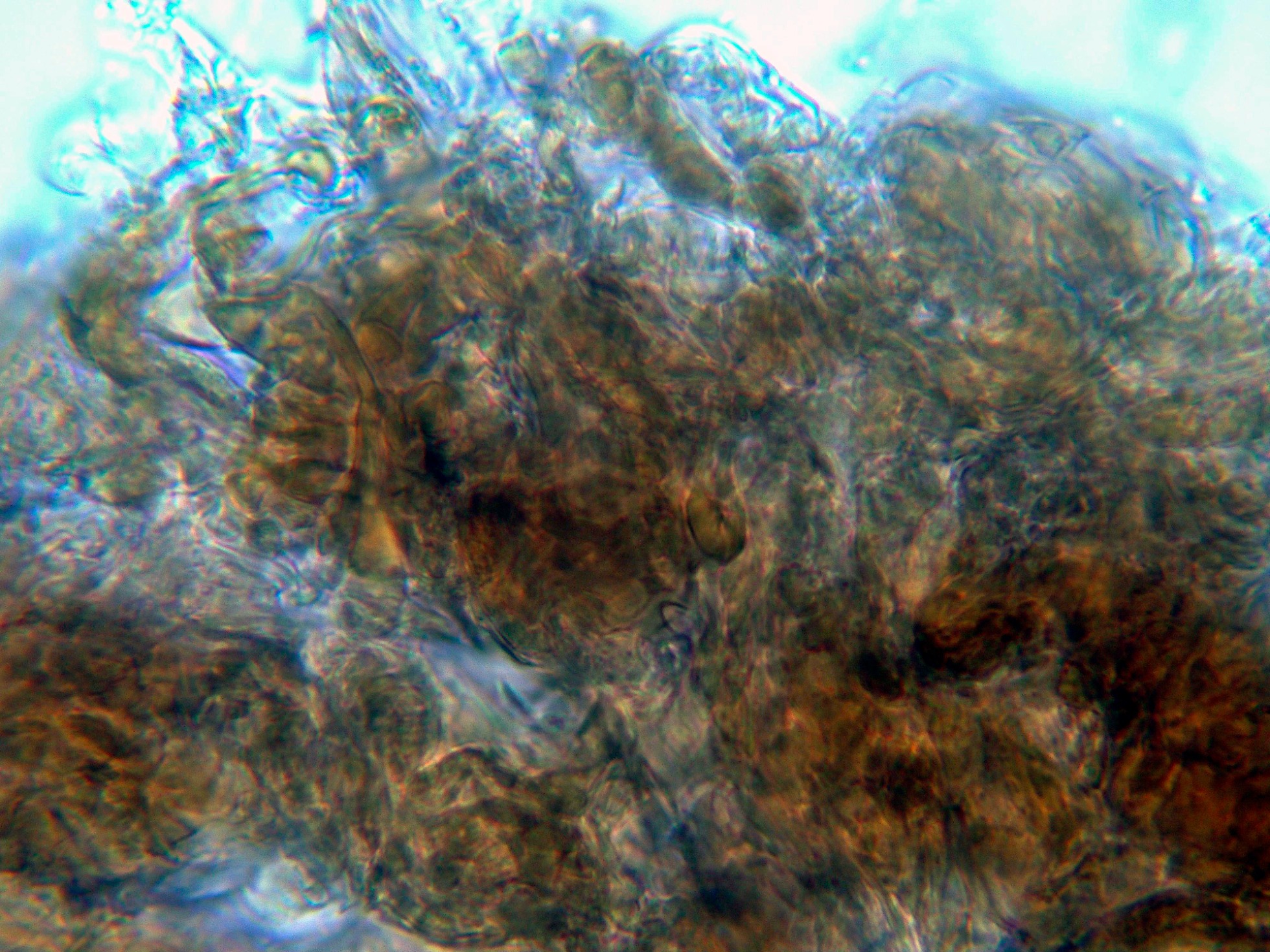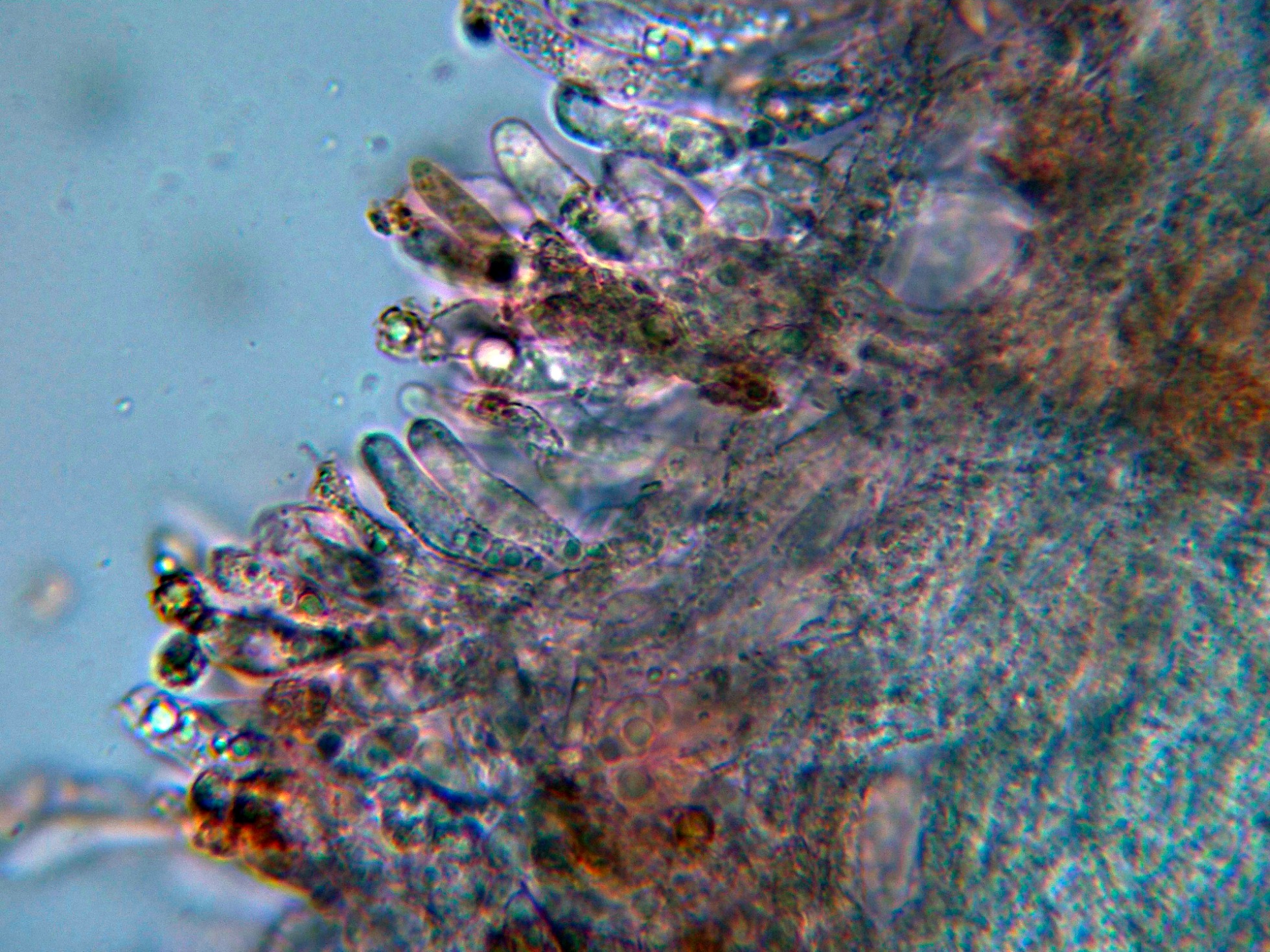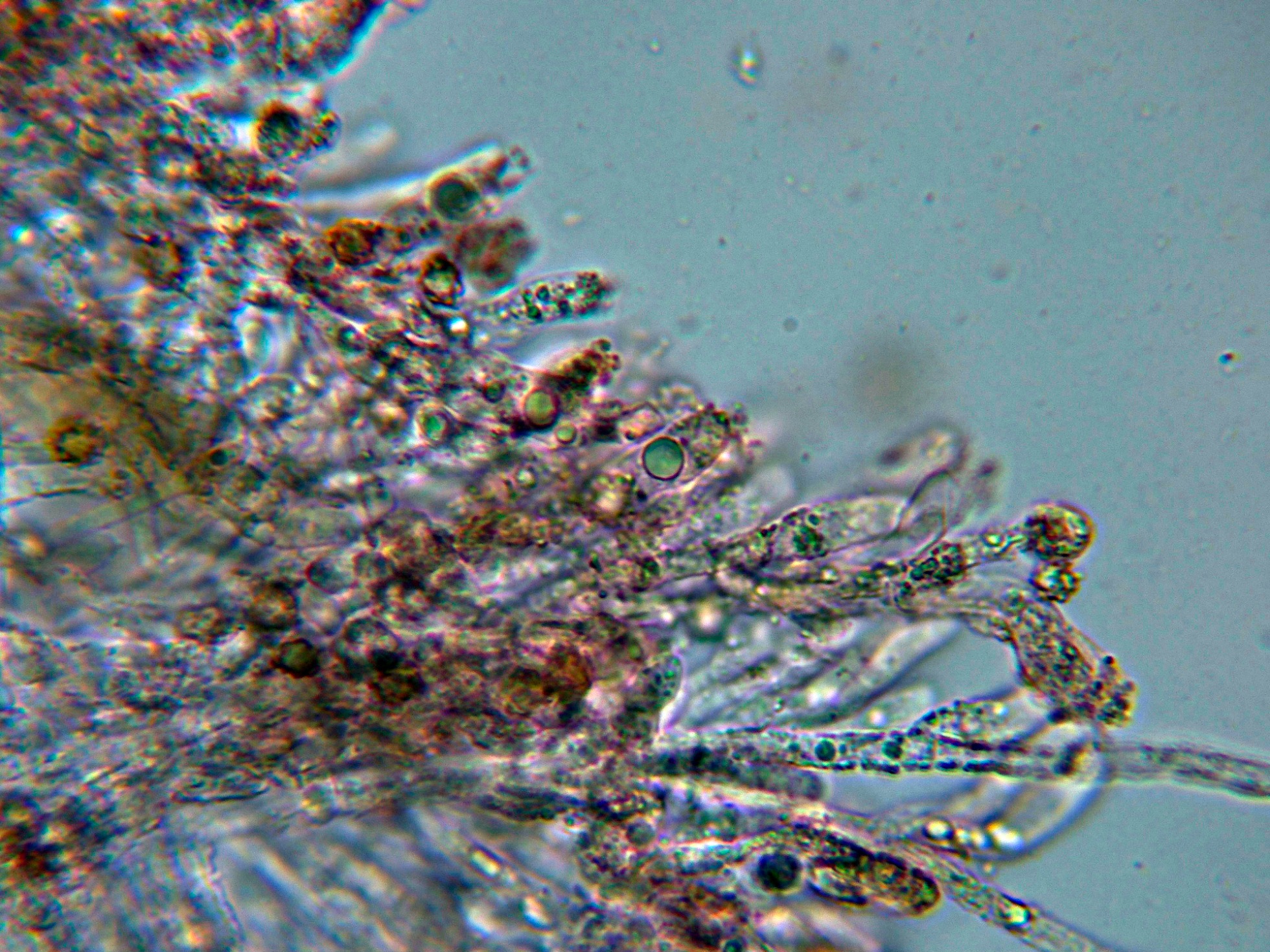 Aunque no se citan cistidios para la especie, si que pude observar unas hifas terminales en los extremos de los acúleos a modo de pelos: