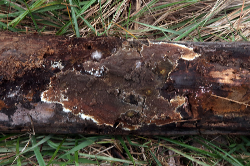 Fotografiado el domingo 18 de Septiembre sobre la superficie de un tronco en la parte que está en contacto con el suelo, en soto fluvial donde abundaban los abedules, pero justo al lado de un bosque de Pinus.