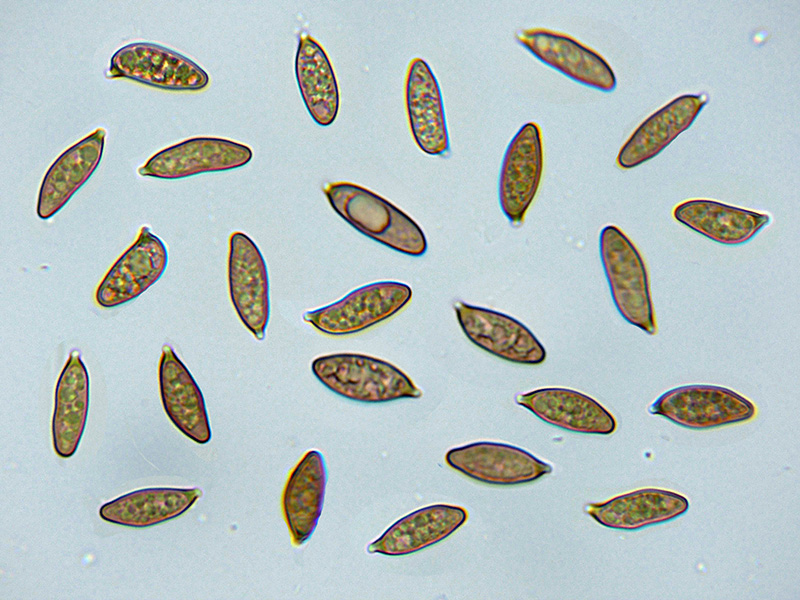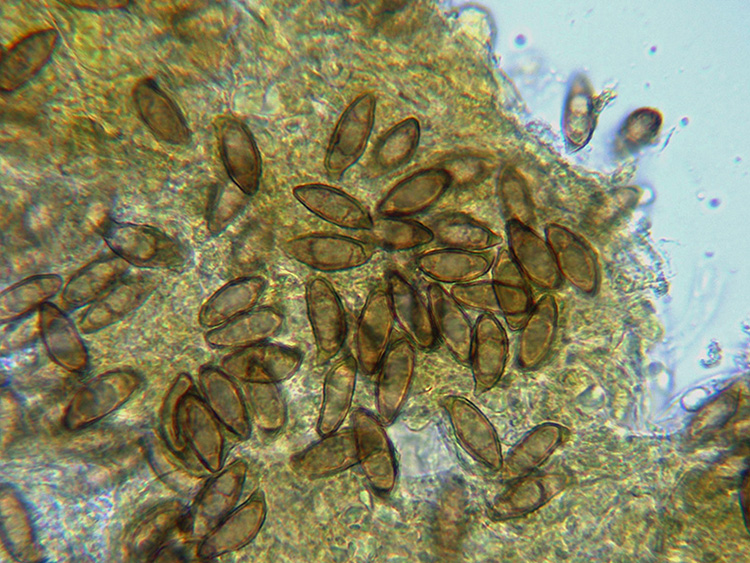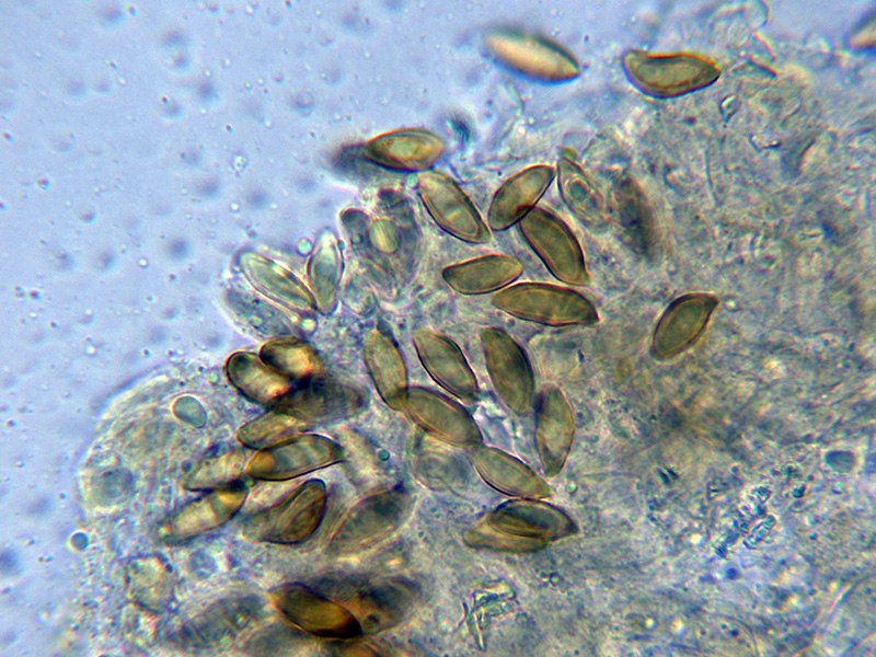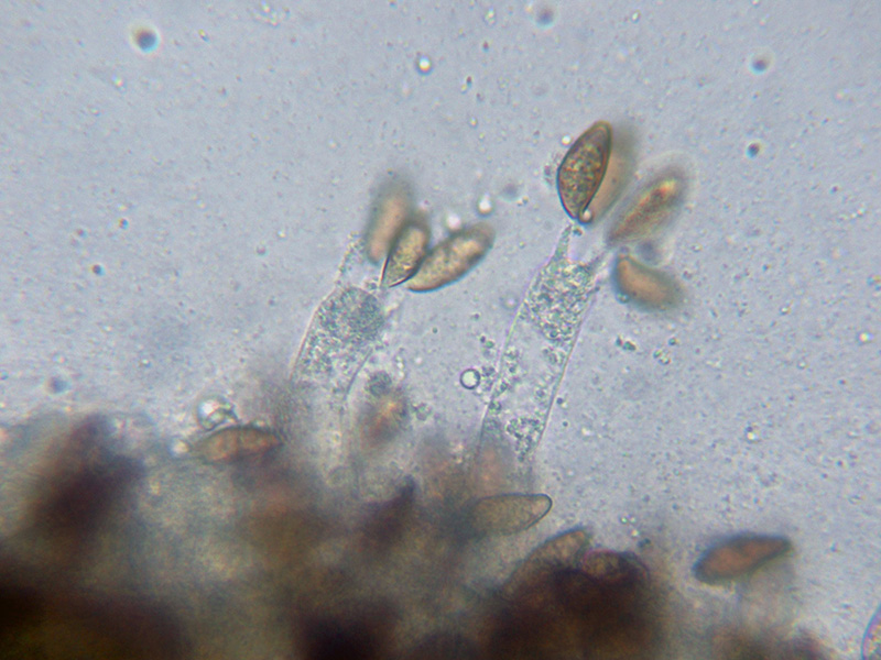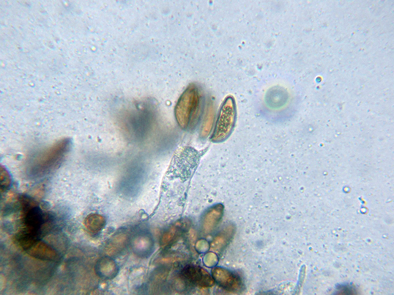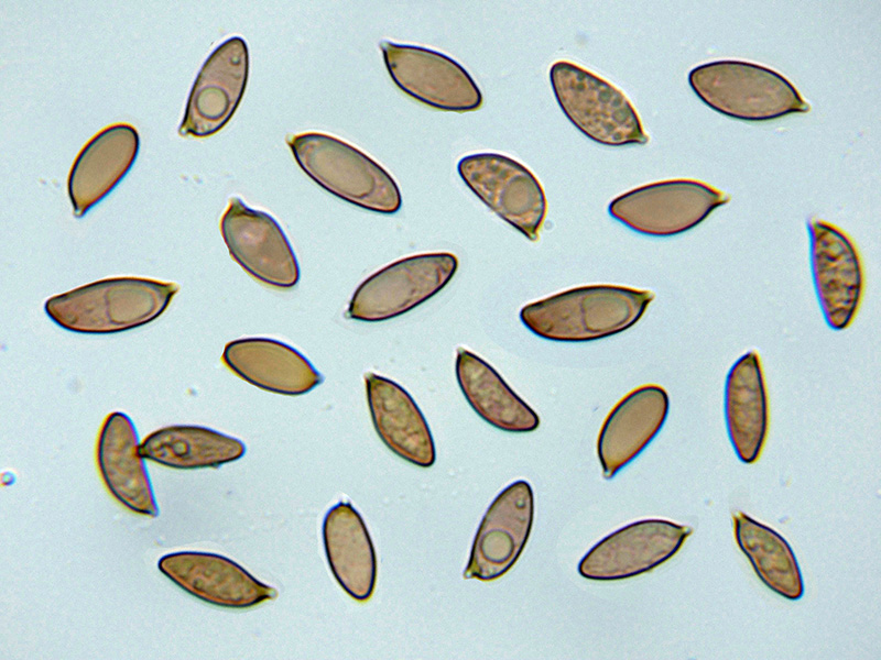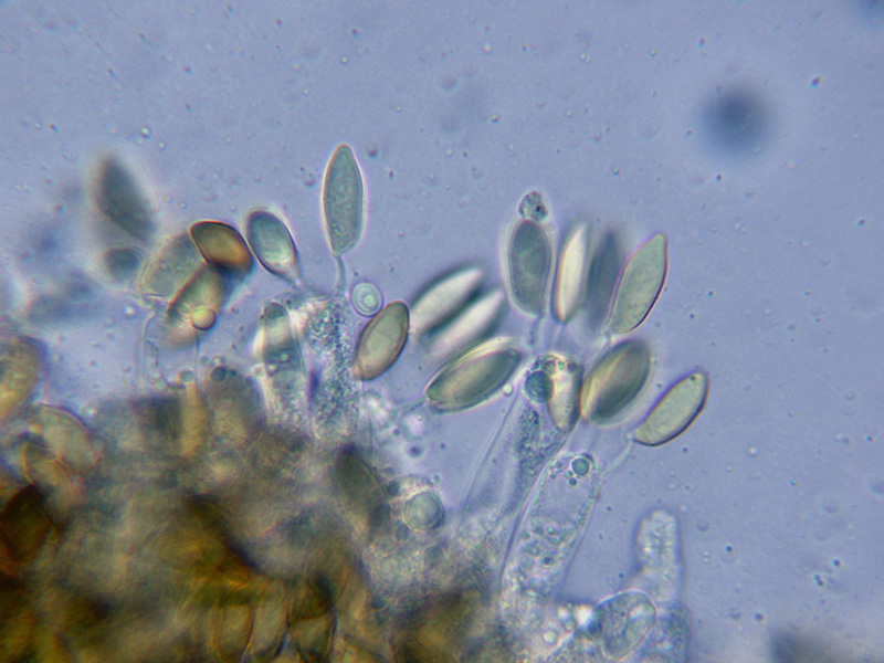 Estos basidios producen unas esporas pigmentadas con forma entre navicular y fusiforme, contenido granuloso en su interior y con una marcada apícula excéntrica en uno de sus extremos, estas esporas prácticamente no reaccionan con el Reactivo de Melzer por lo que se podrían considerar inamiloides, aunque se decoloran de manera moderada al aplicar KOH.