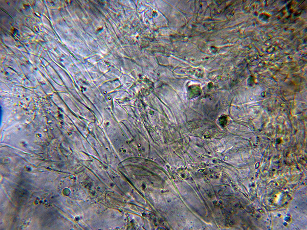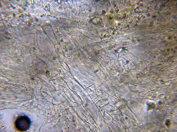 Hifas subiculares prácticamente inexistentes y de muy difícil observación, las pocas que pude aislar prácticamente hialinas, con algunos ensanchamientos y sin fíbulas observadas de manera clara.