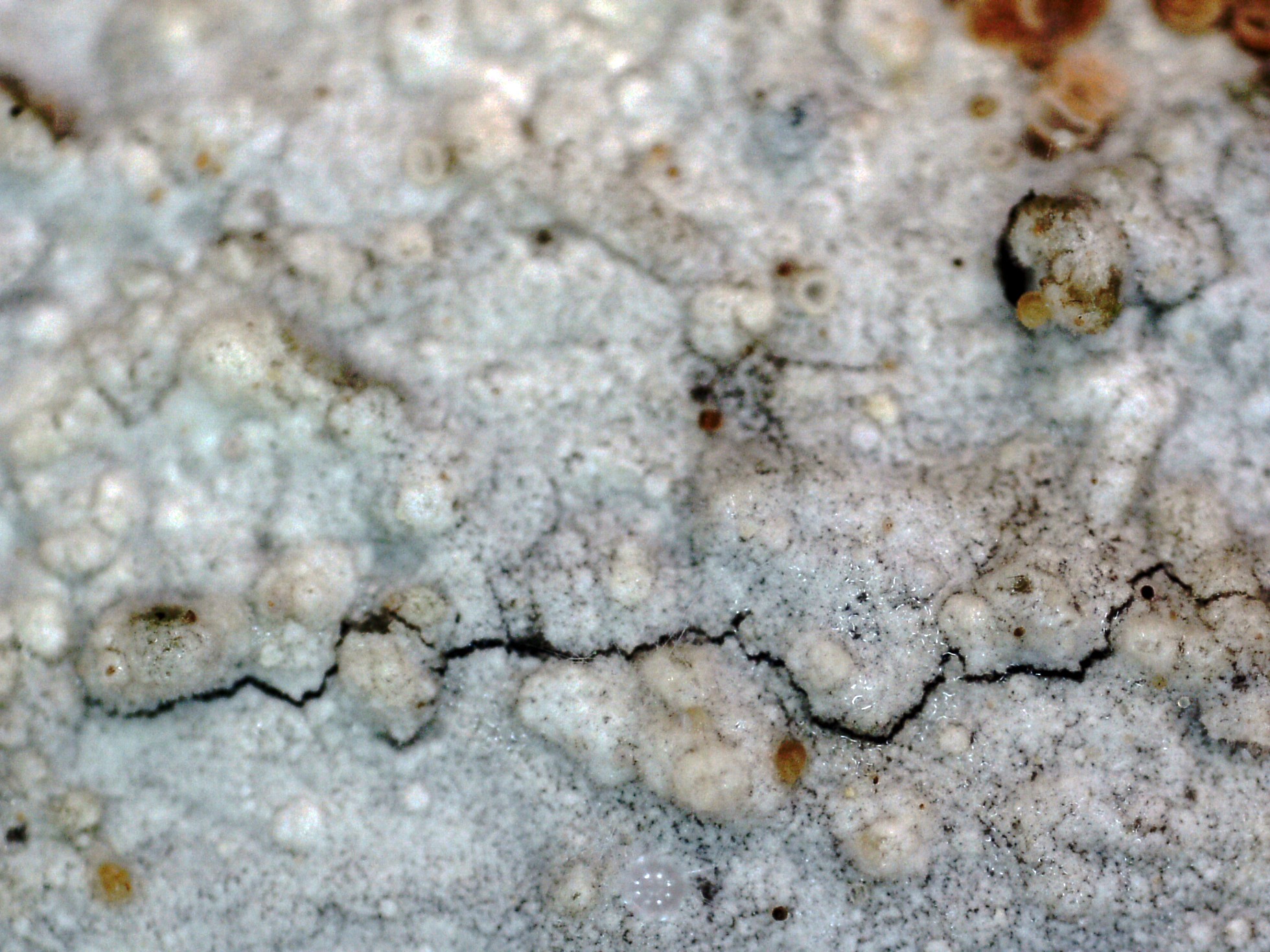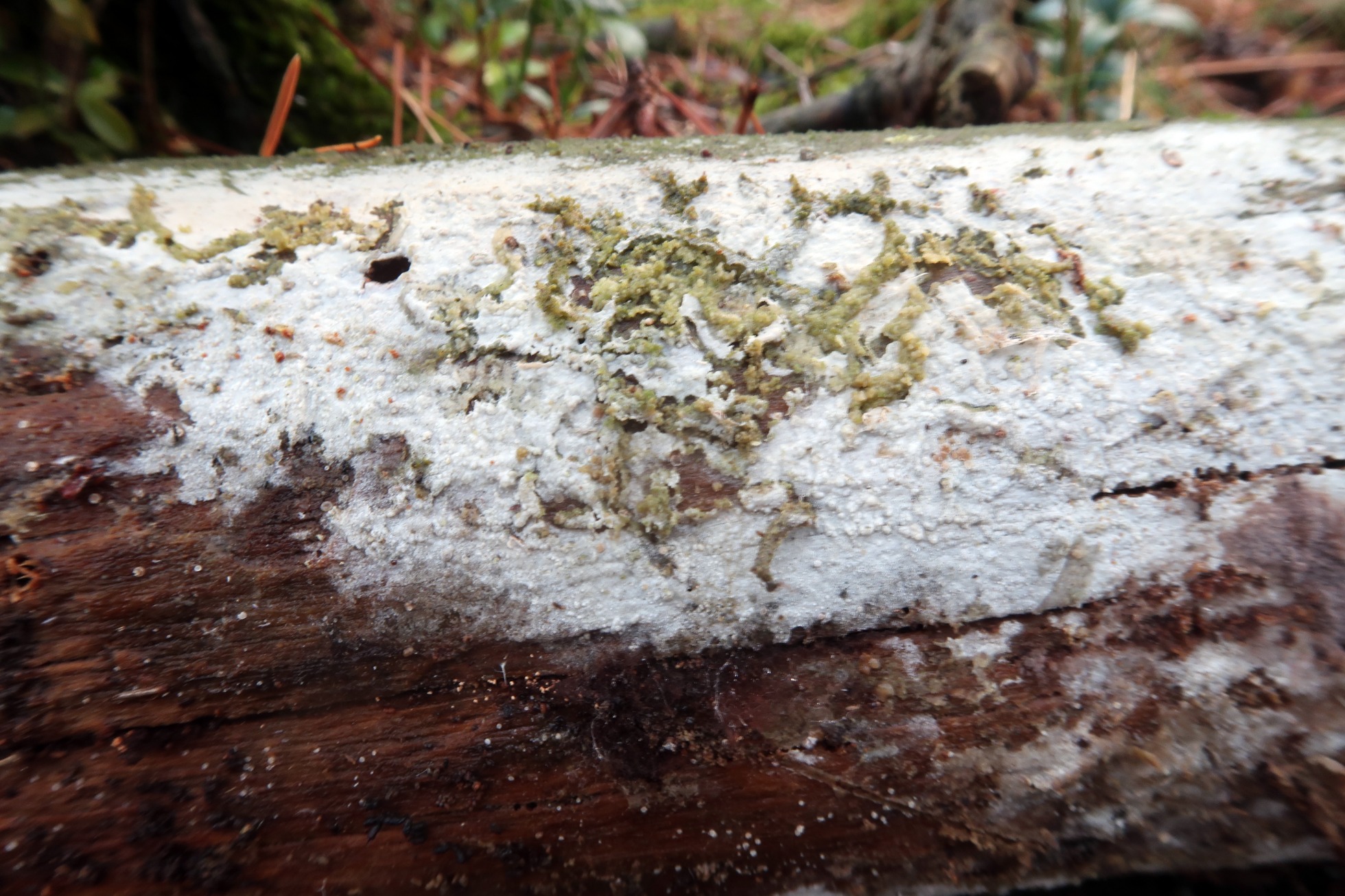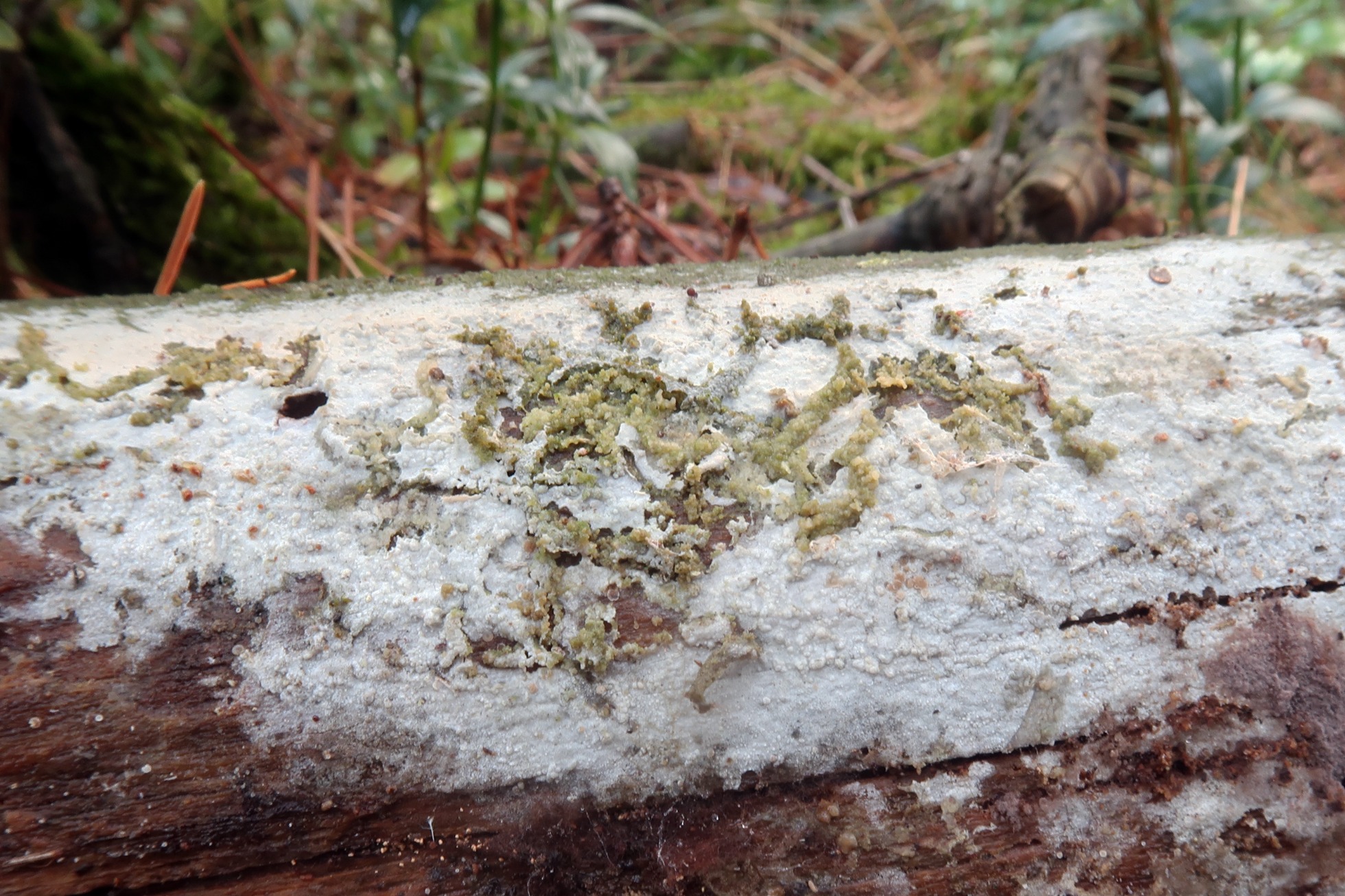 Fructificación completamente resupinada, de poco grosor y de color blanquecino sobre el tronco huésped: