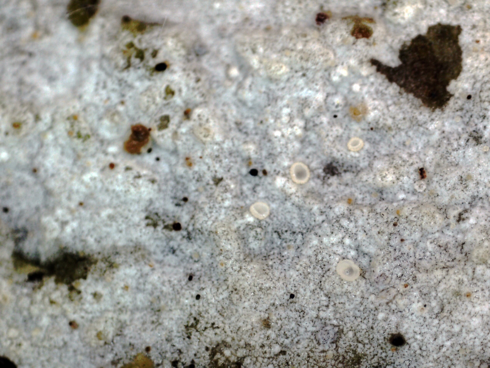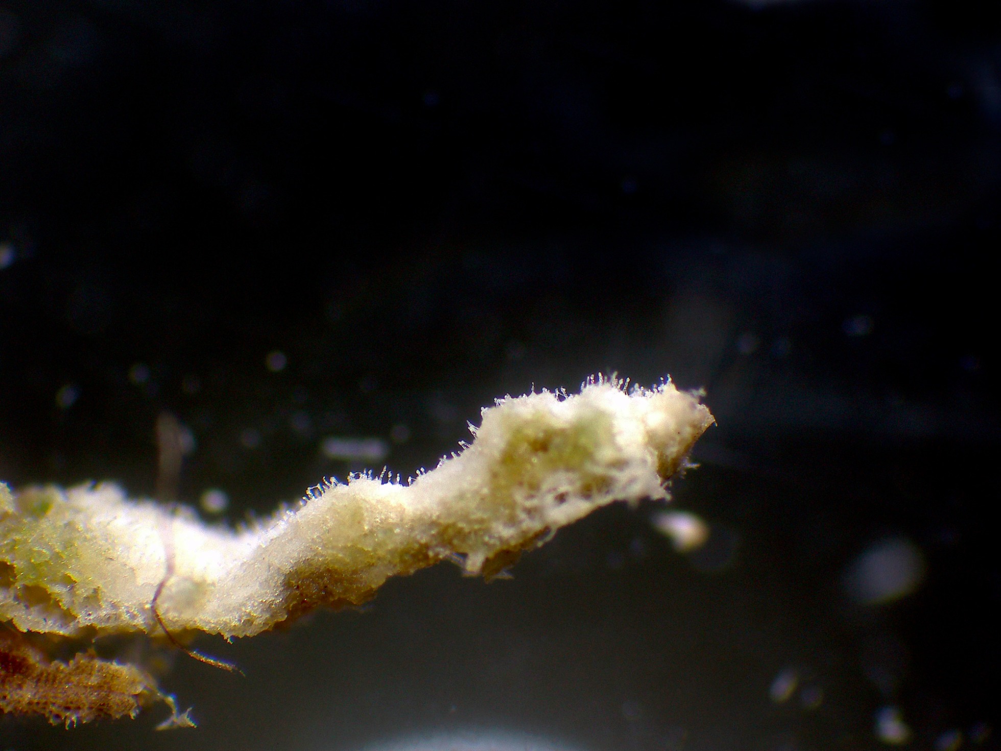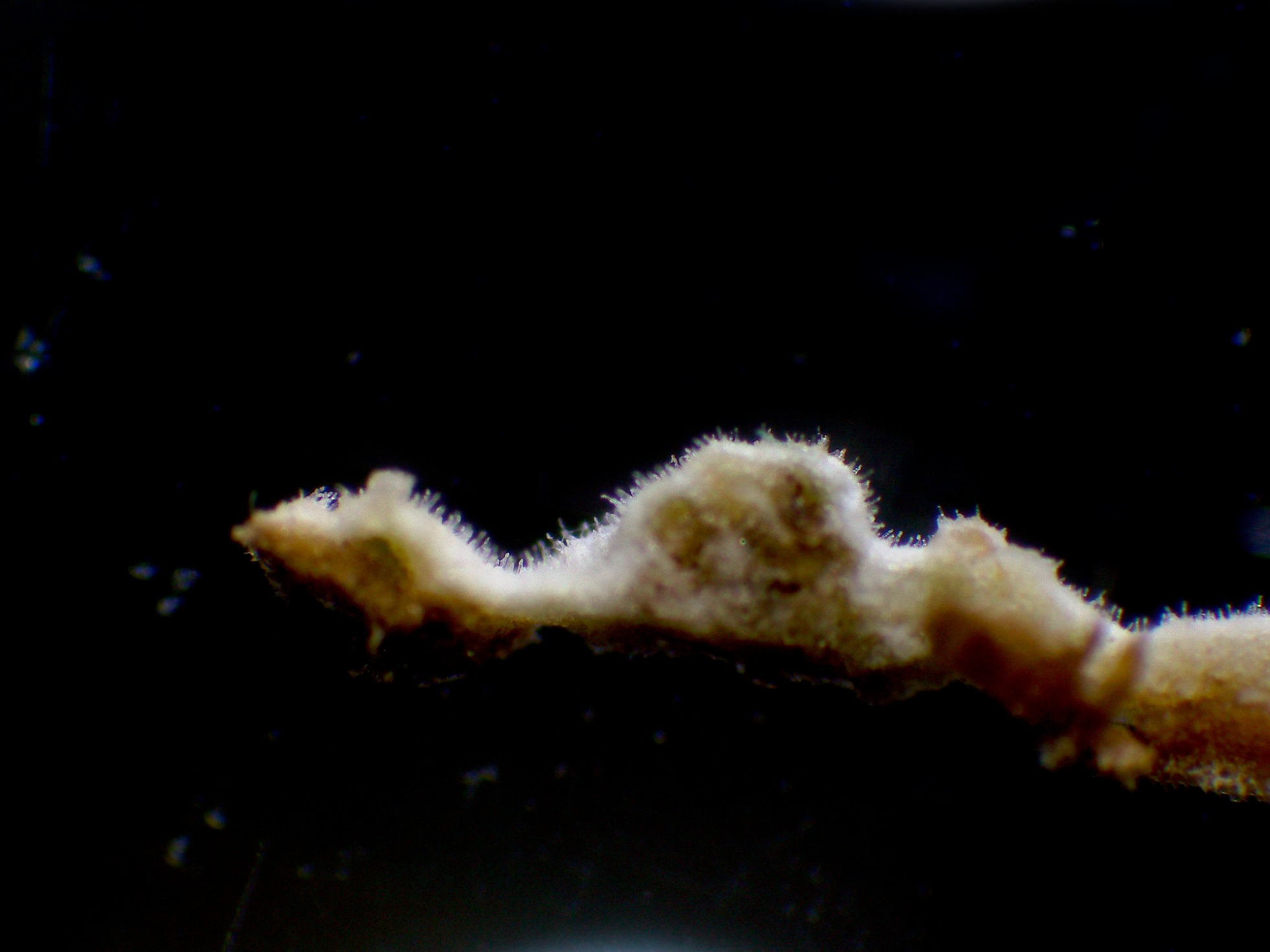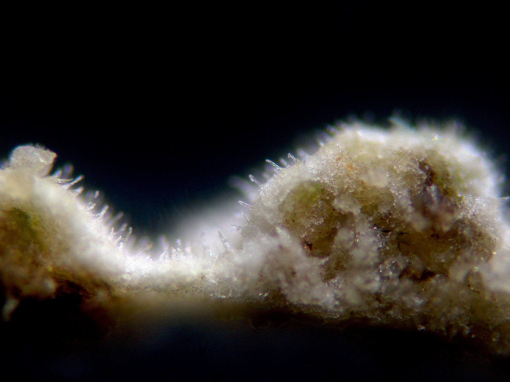 Un par de ampliaciones de su superficie a 20 aumentos, en la segunda imágen se observa como comparte el espacio con unos pequeños apotecios de la muy abundante Hyaloscypha aureliella: