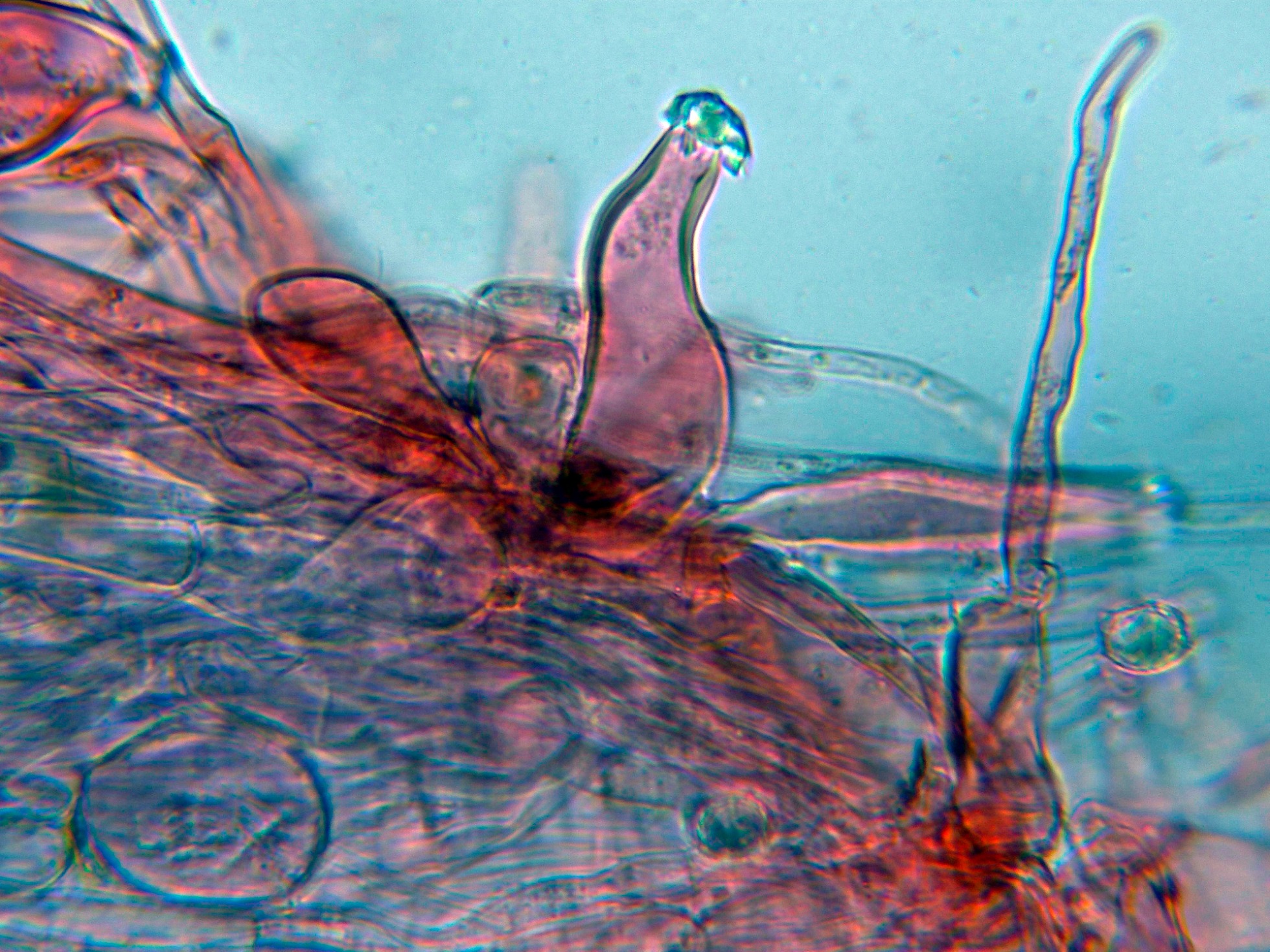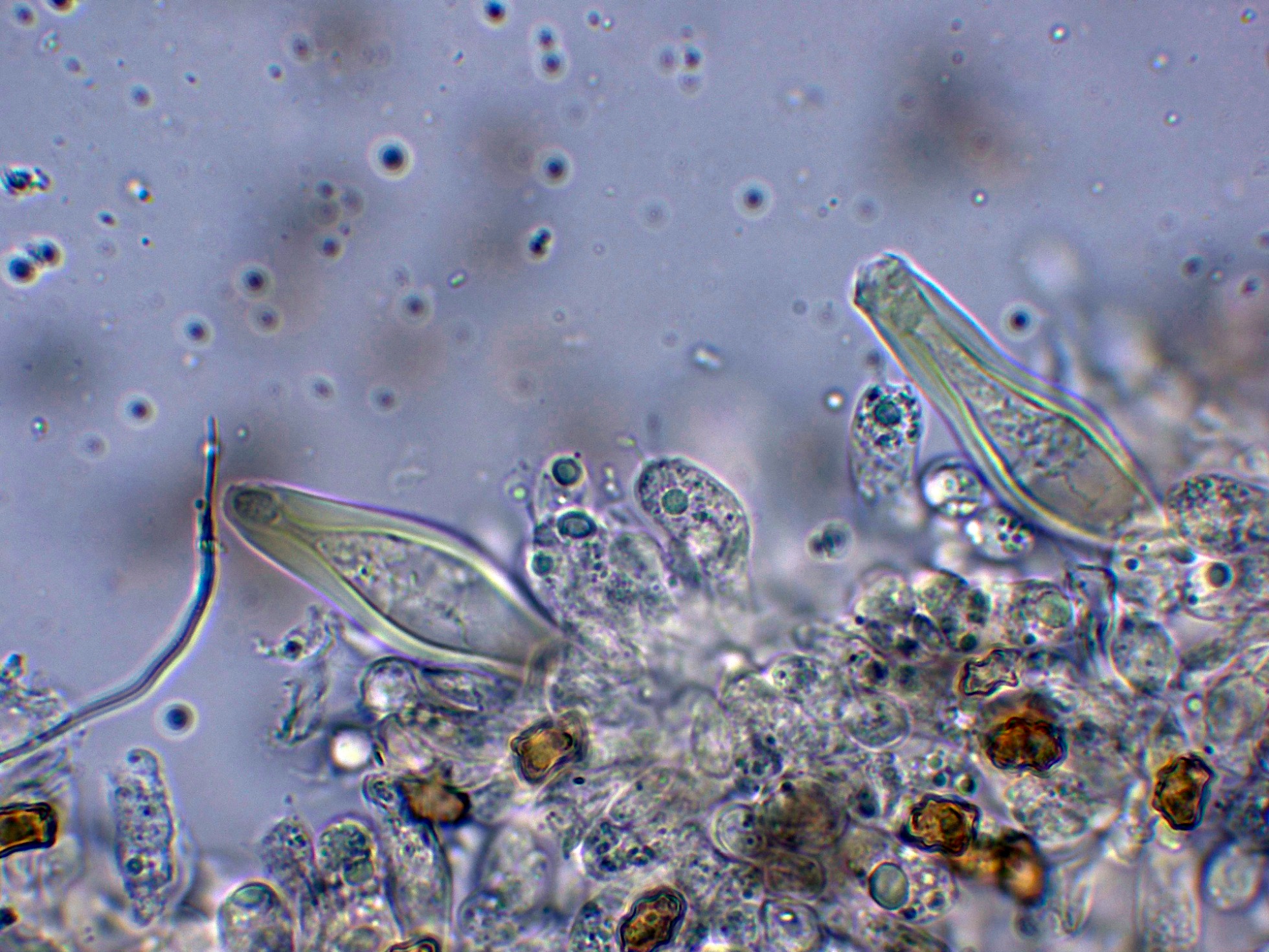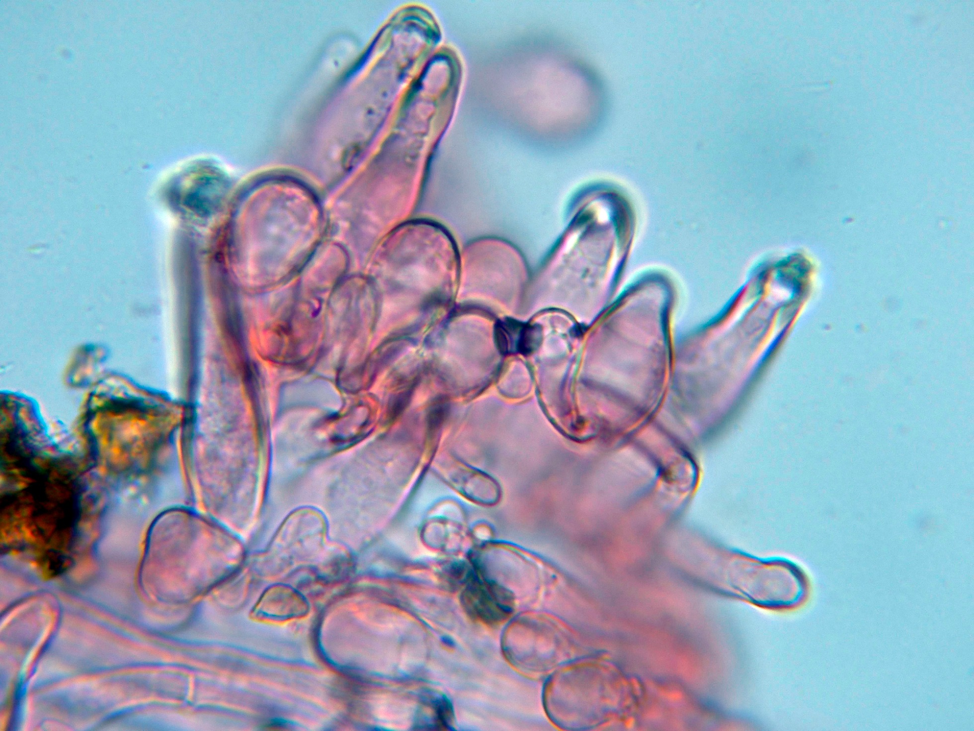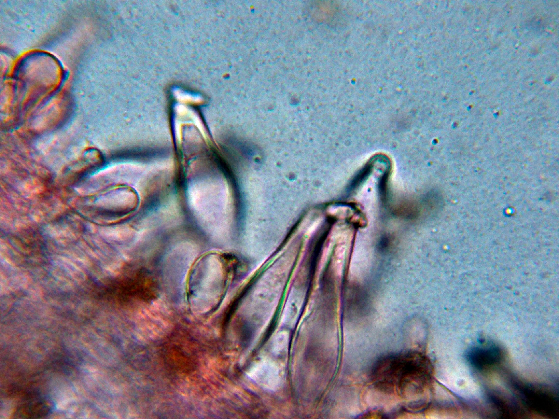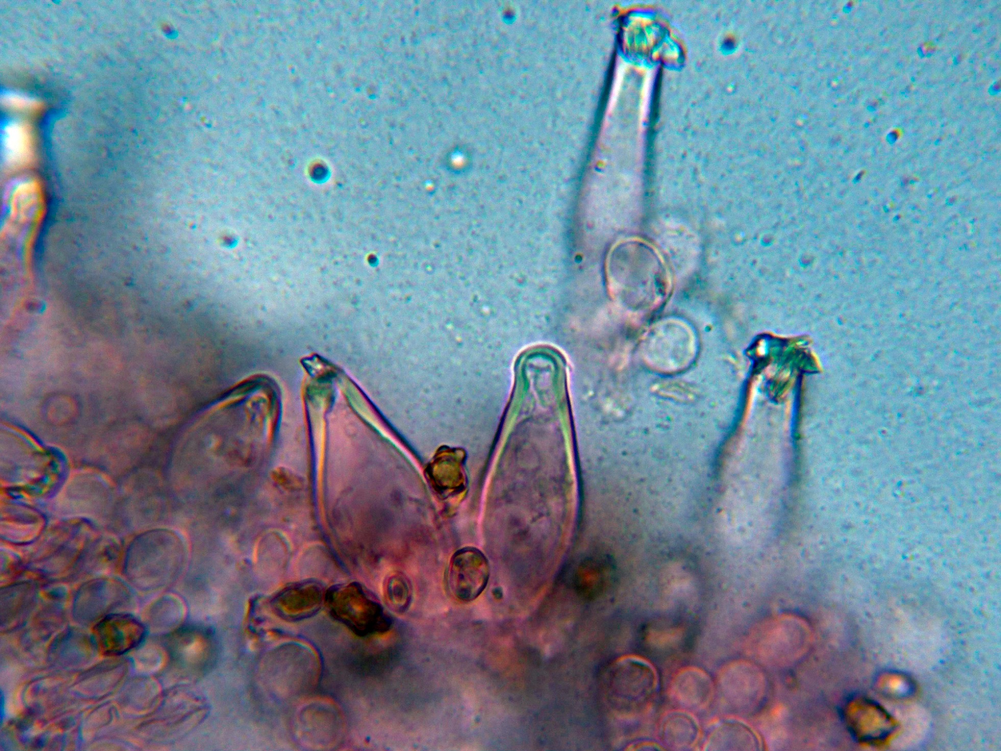Los cistidios en KOH, donde se observa mejor el detalle de su pared gruesa: