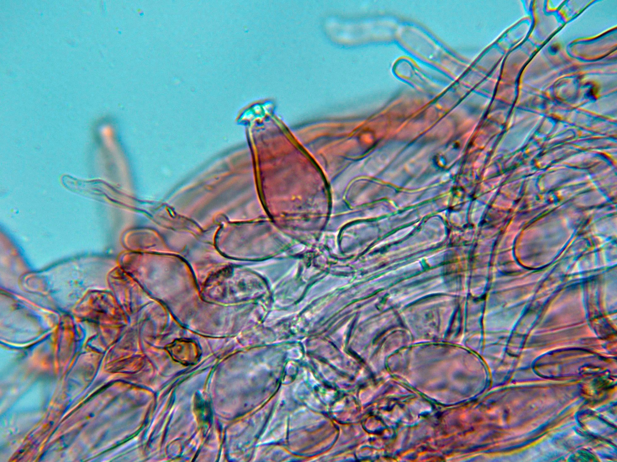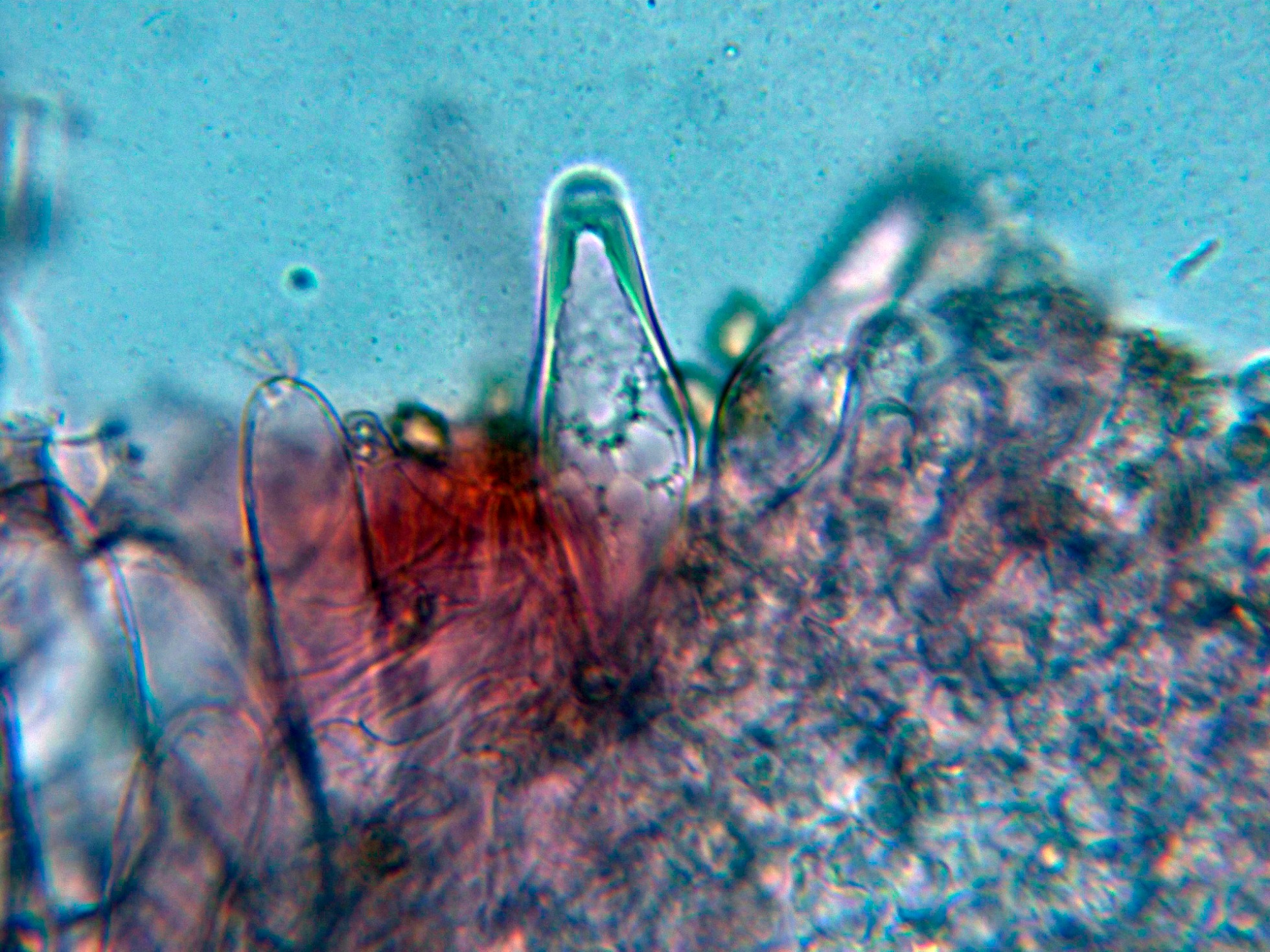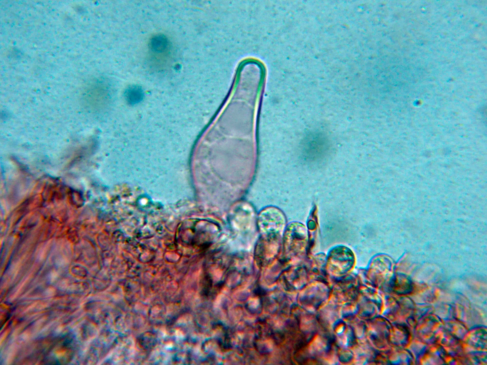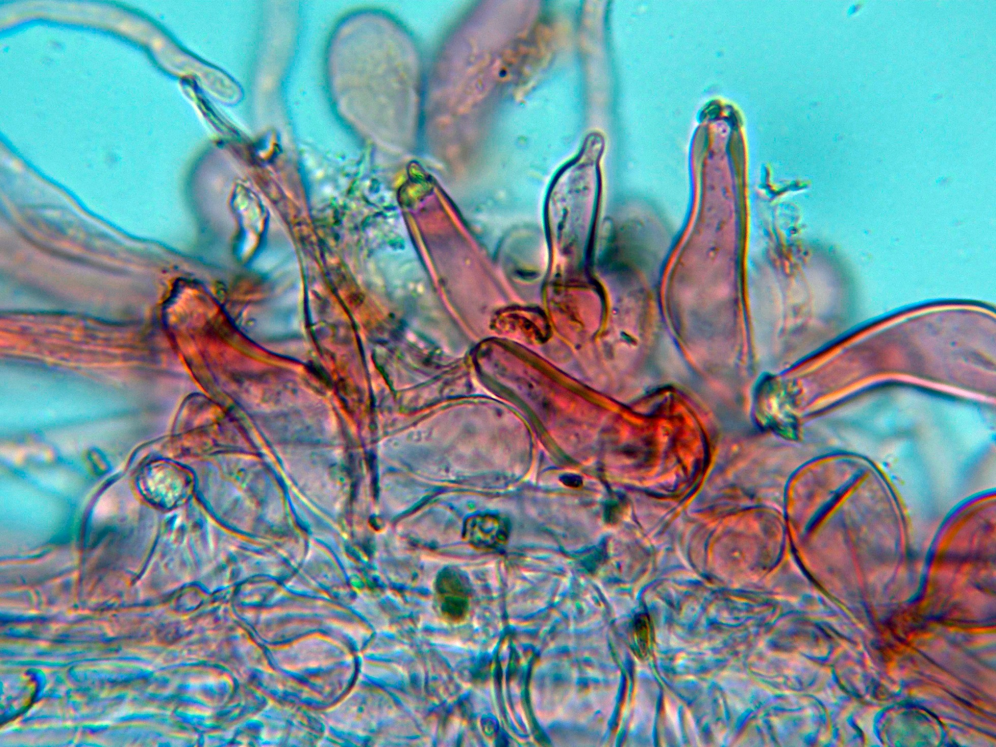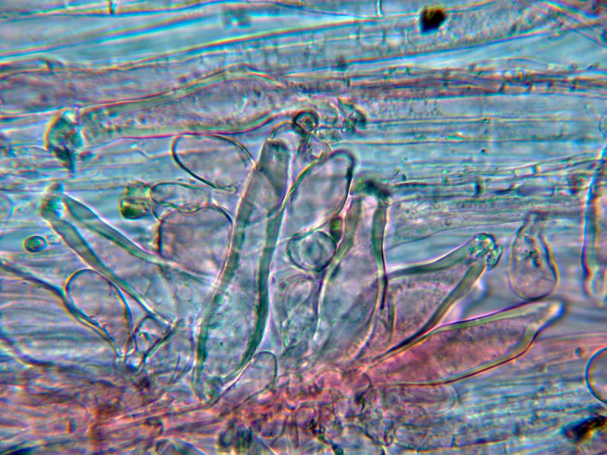 Los cistidios en KOH, donde se observa mejor el detalle de su pared gruesa:
