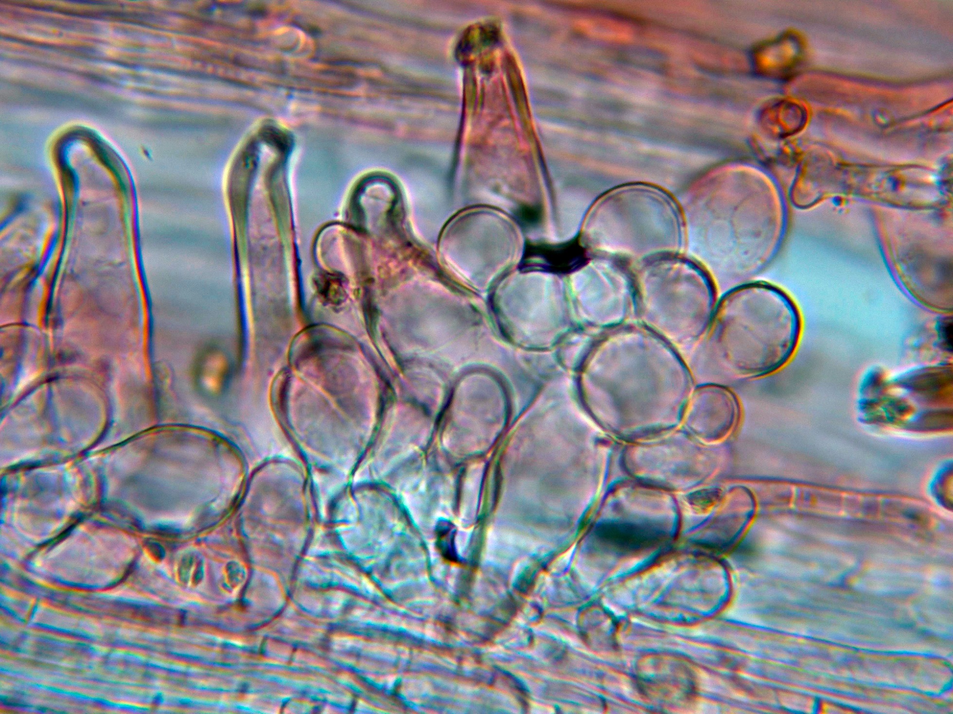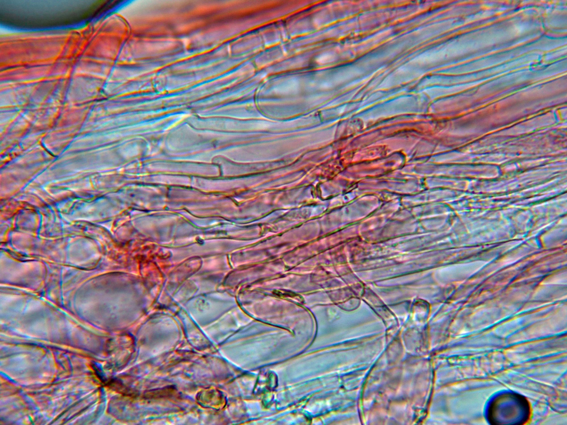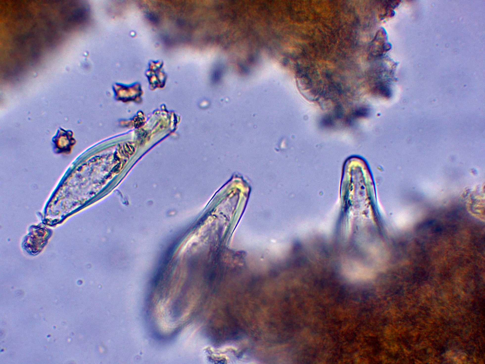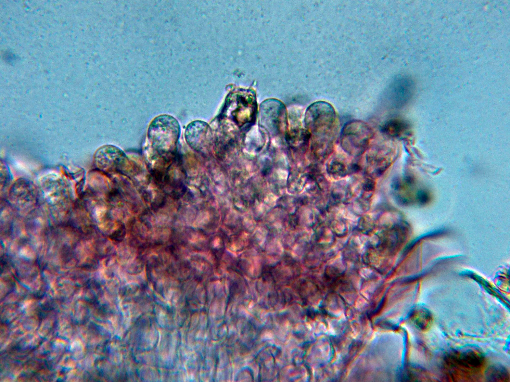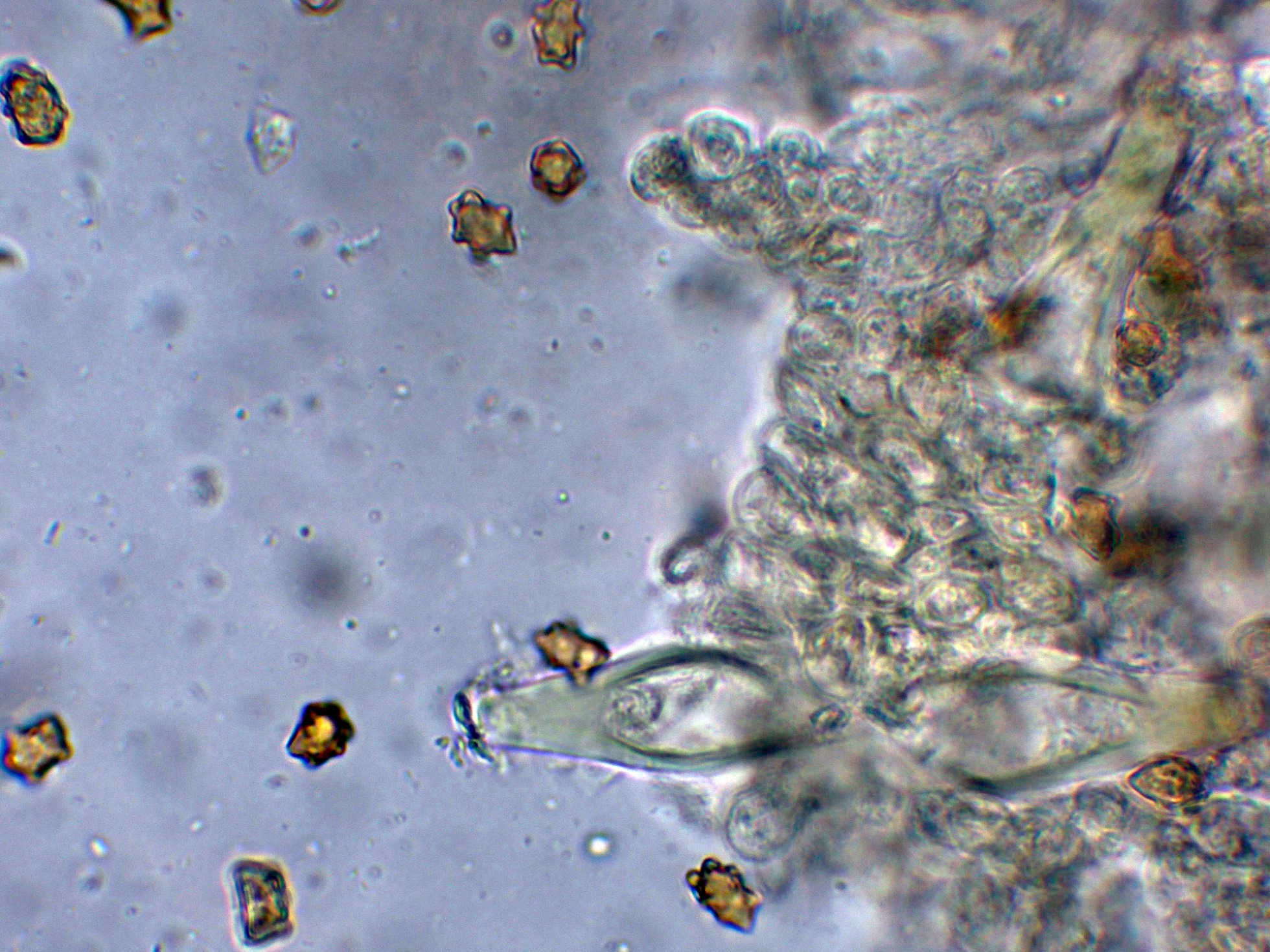 Los cistidios en KOH, donde se observa mejor el detalle de su pared gruesa: