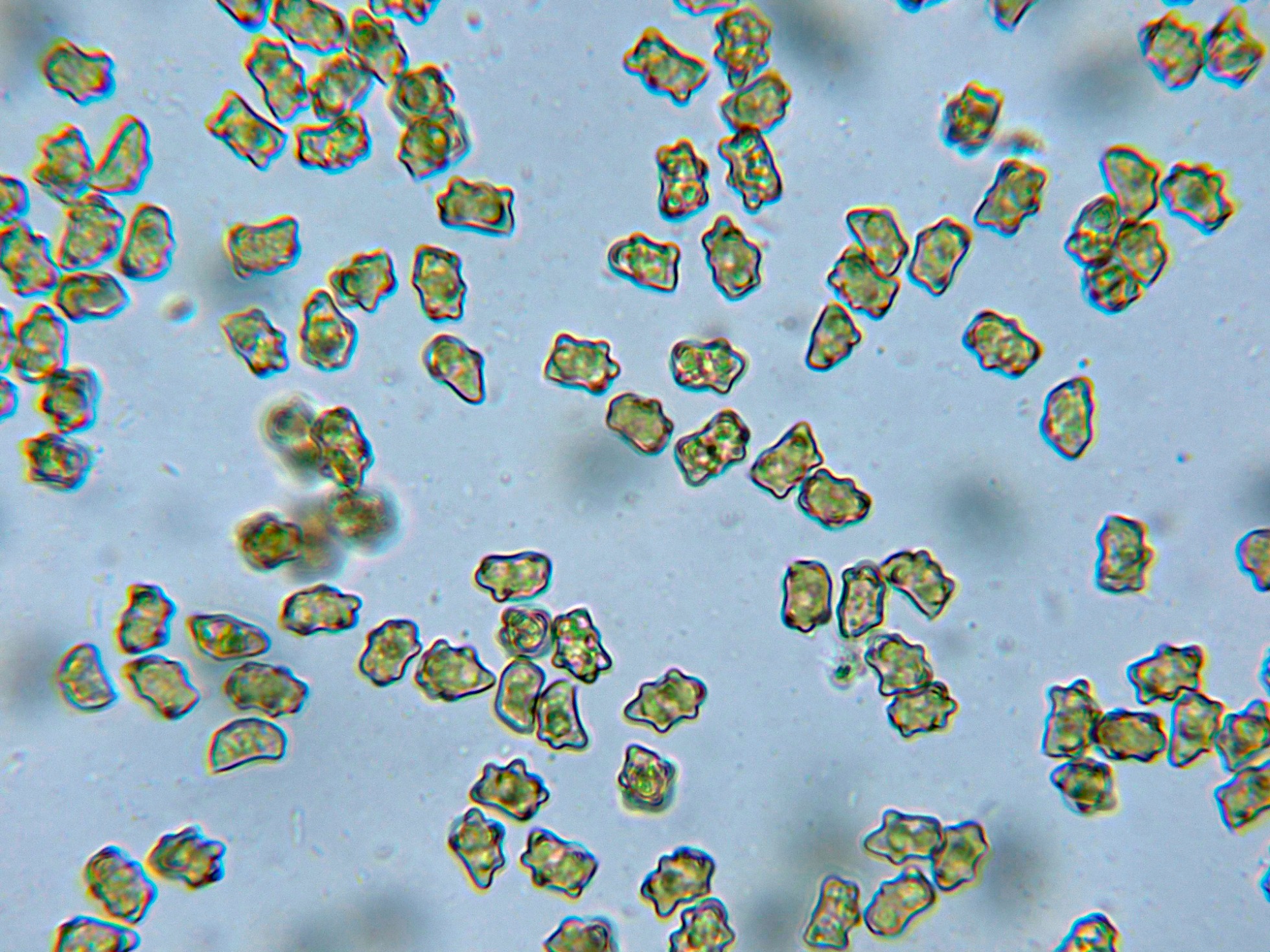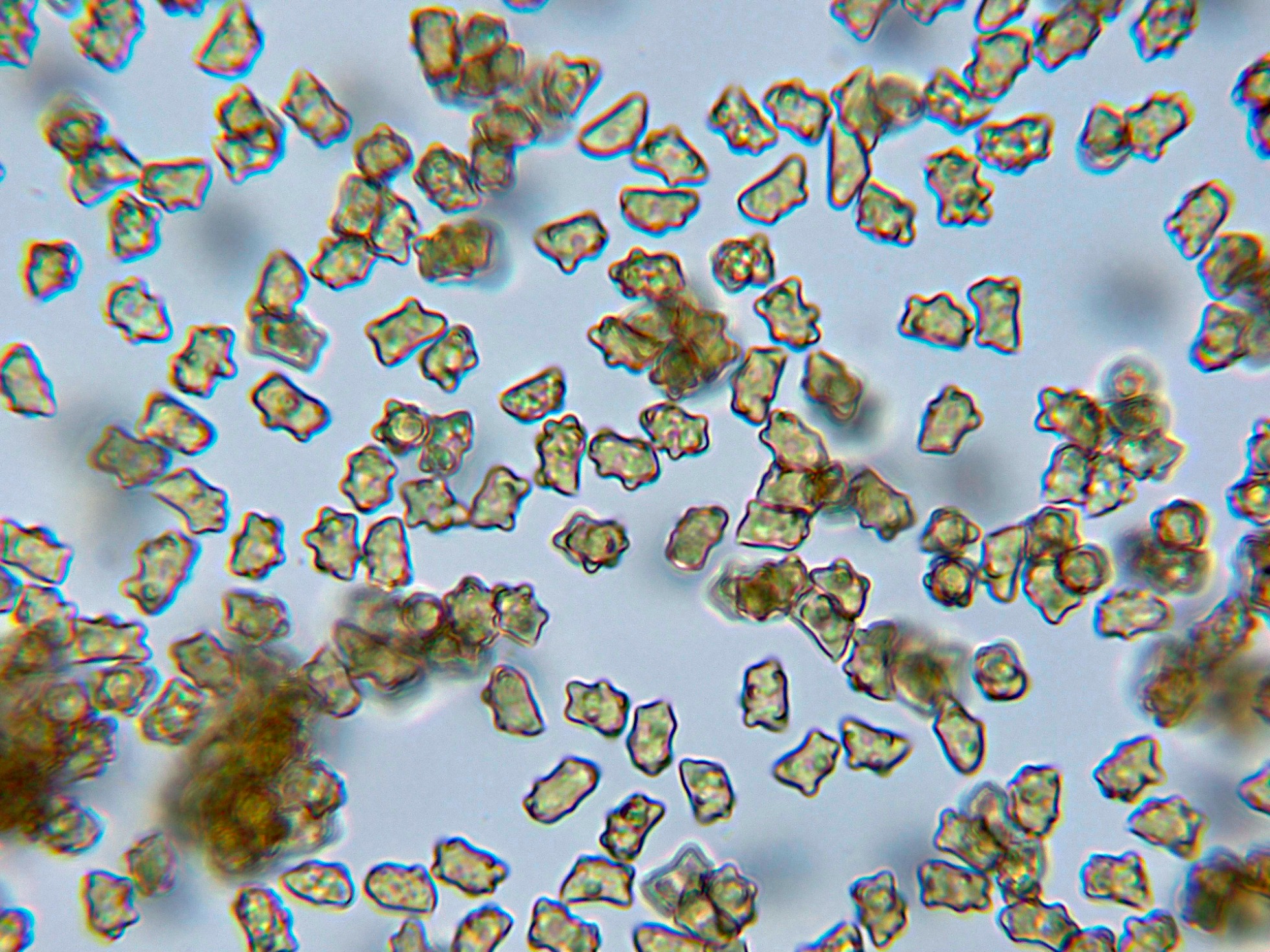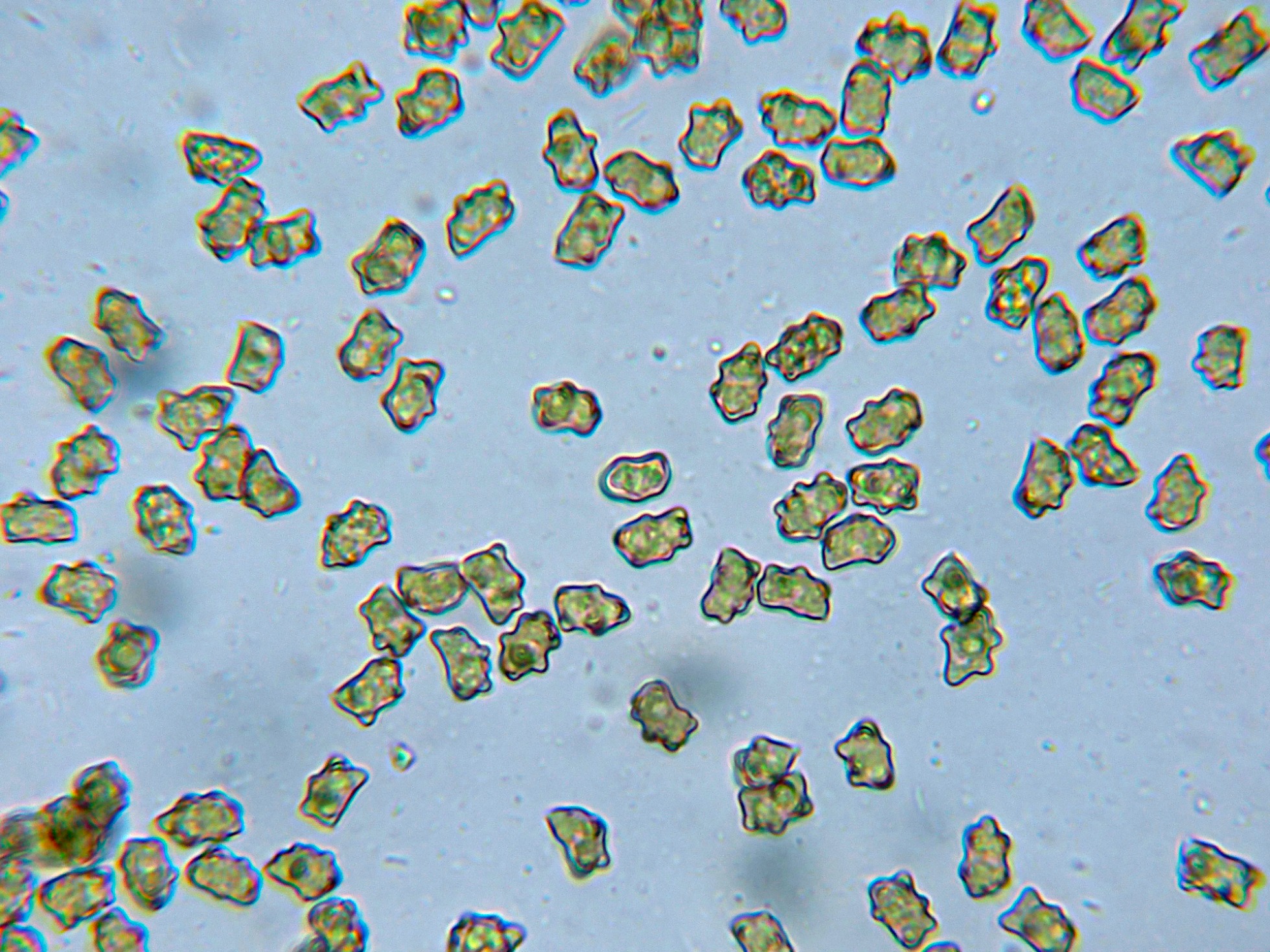 Las esporas con 4 o 5 protuberancias obtusas bajas, algunas de ellas que sugieren formas casi rectangulares.