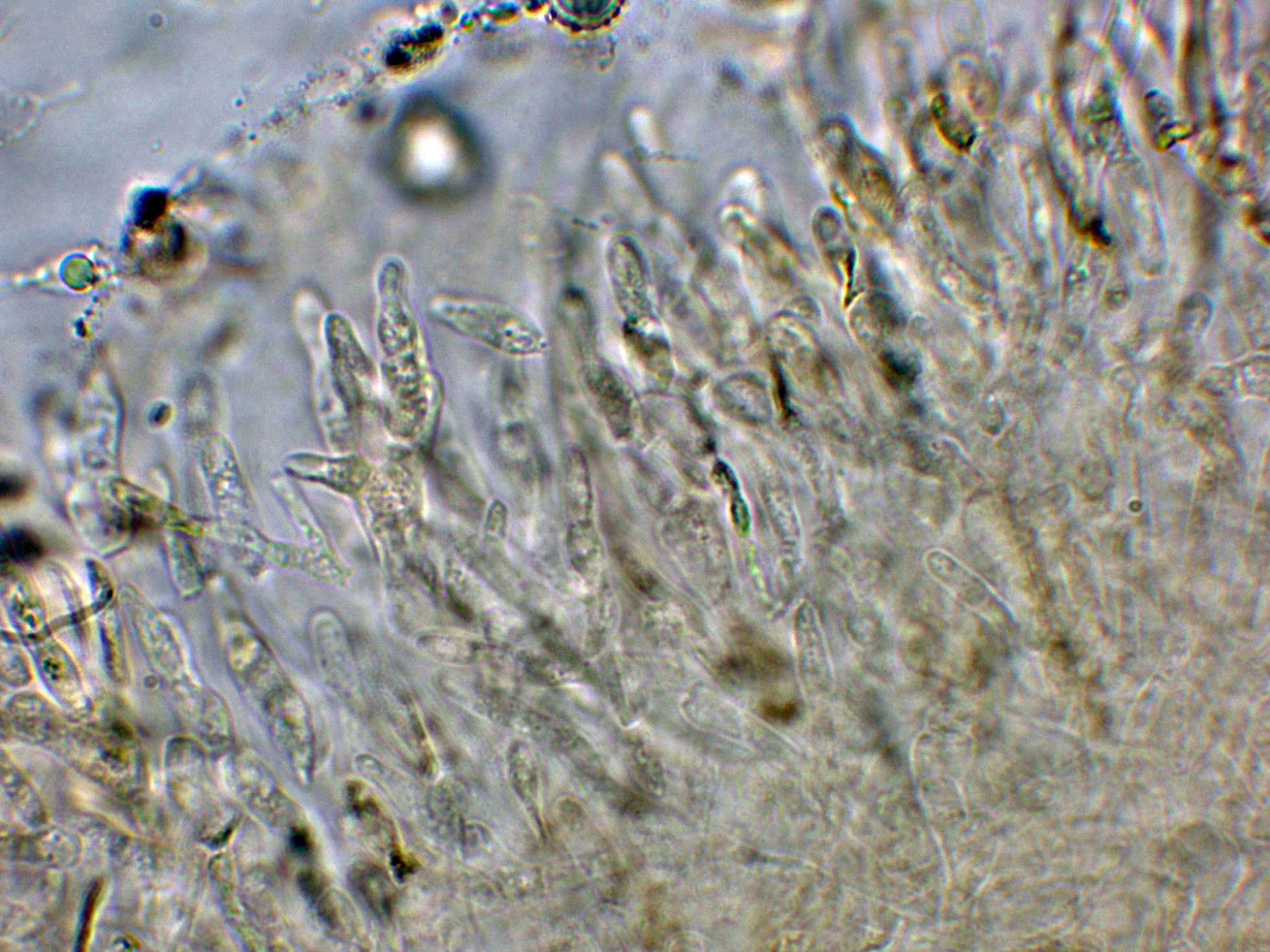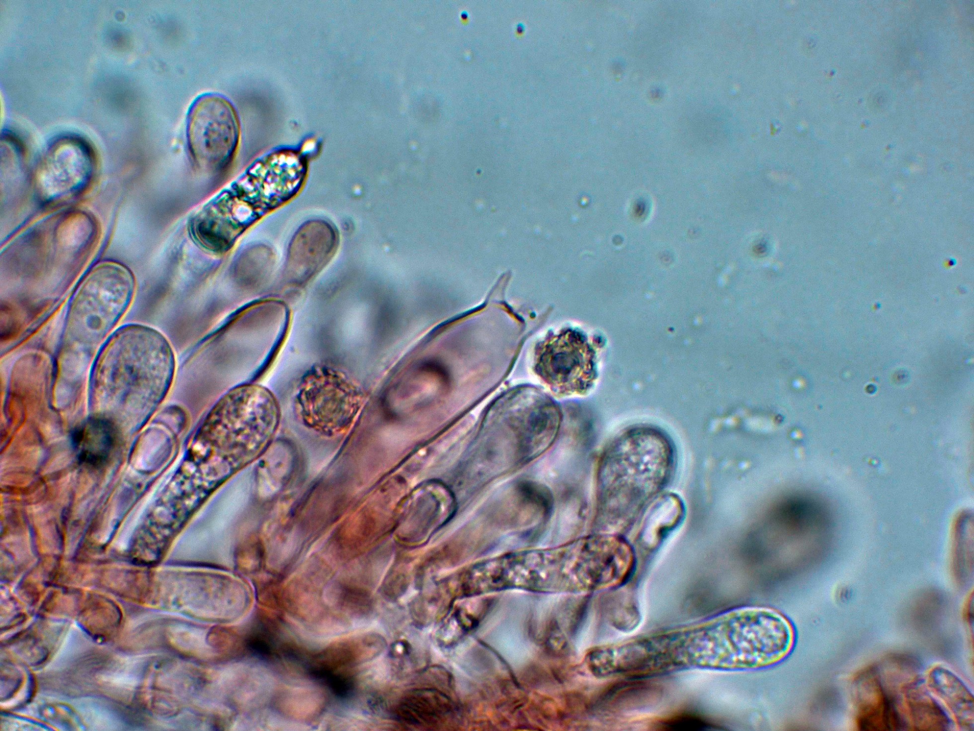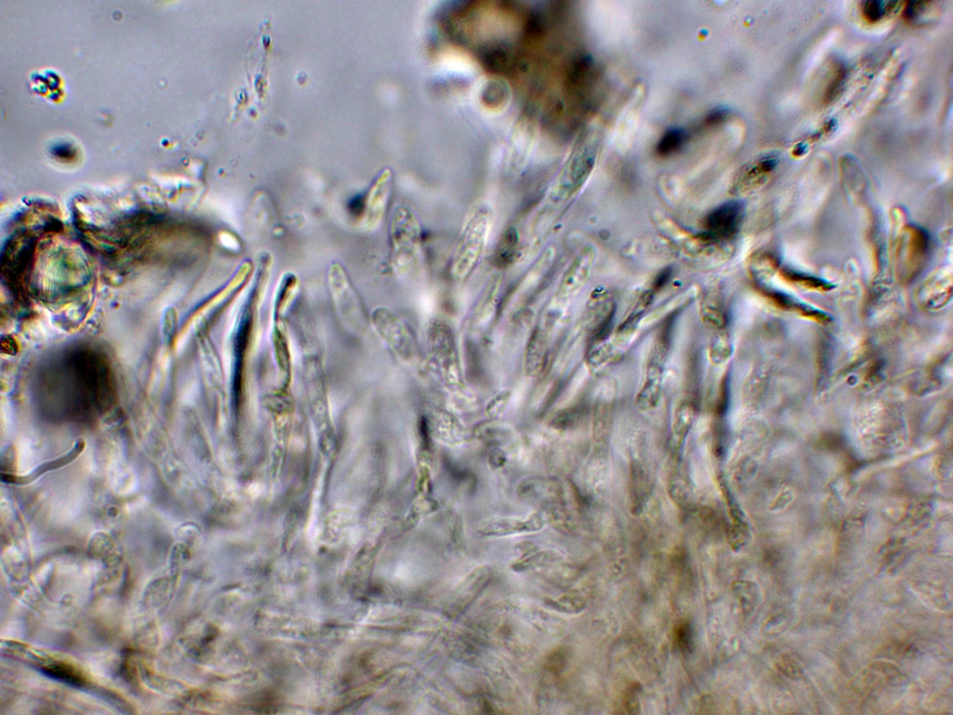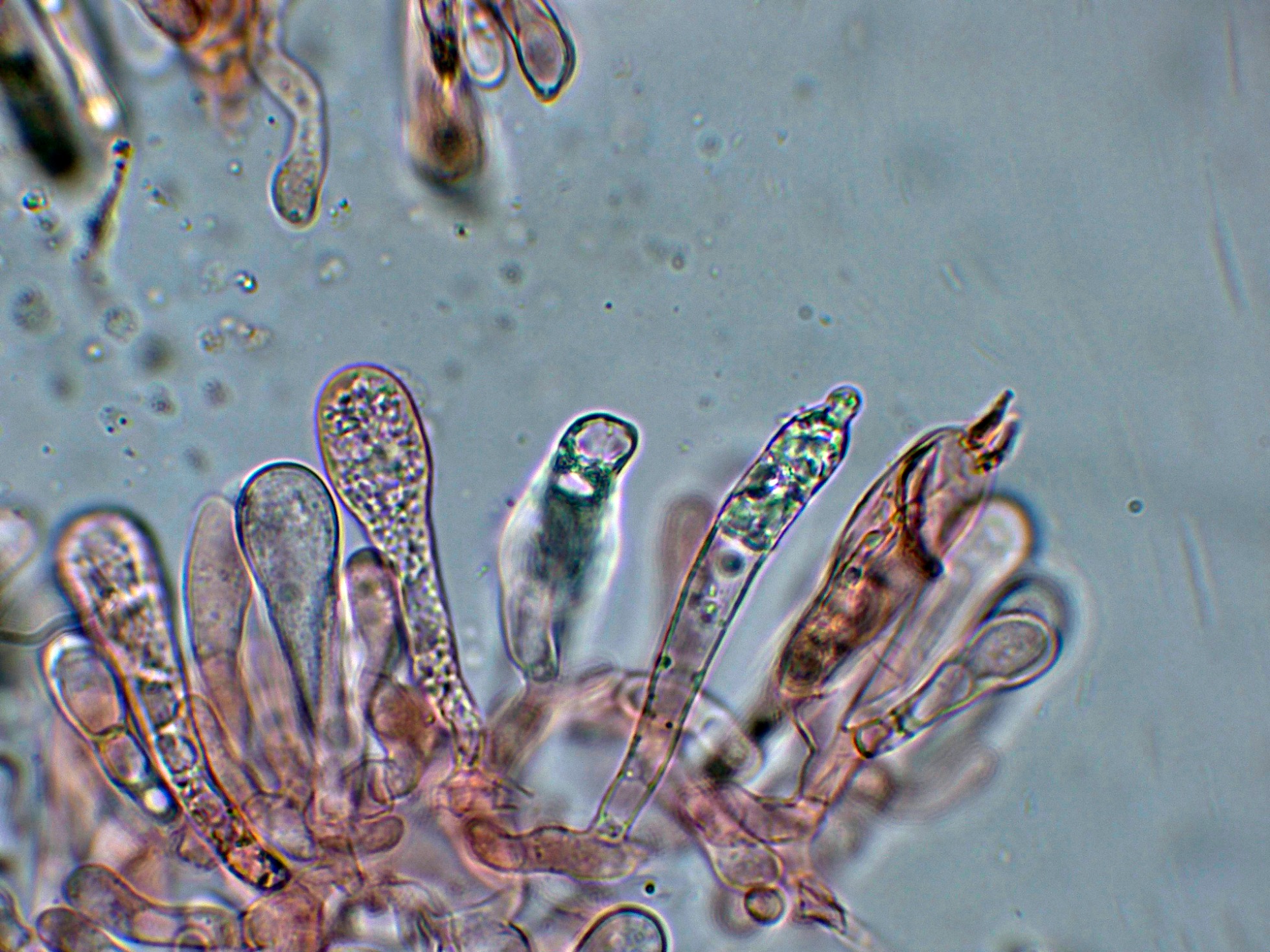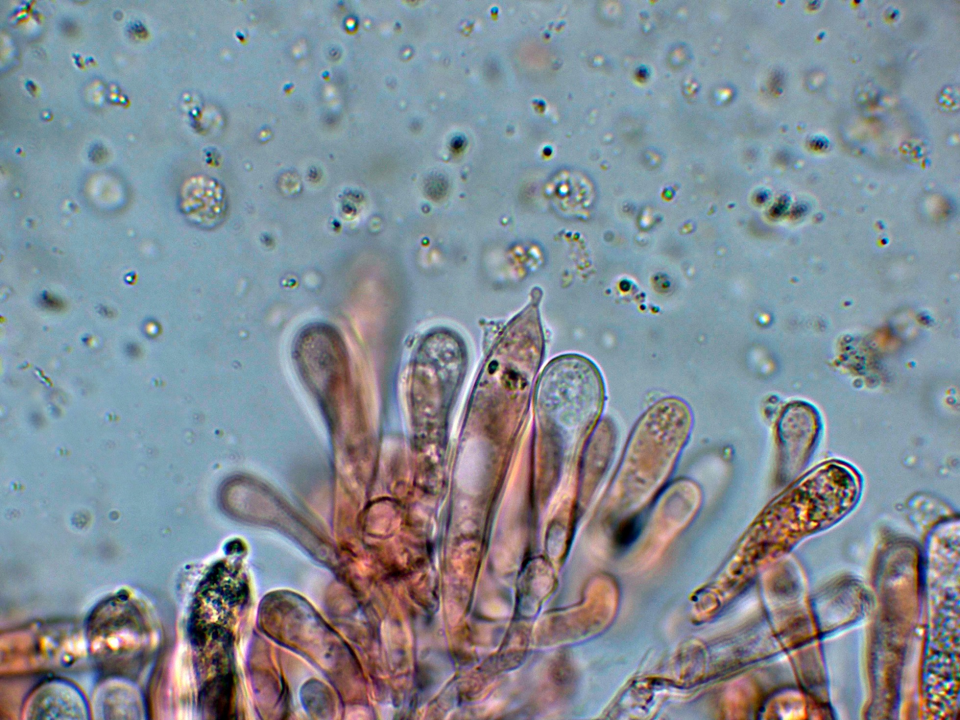 Los cistidios que no sobresalen mucho por encima del nivel de los basidios.