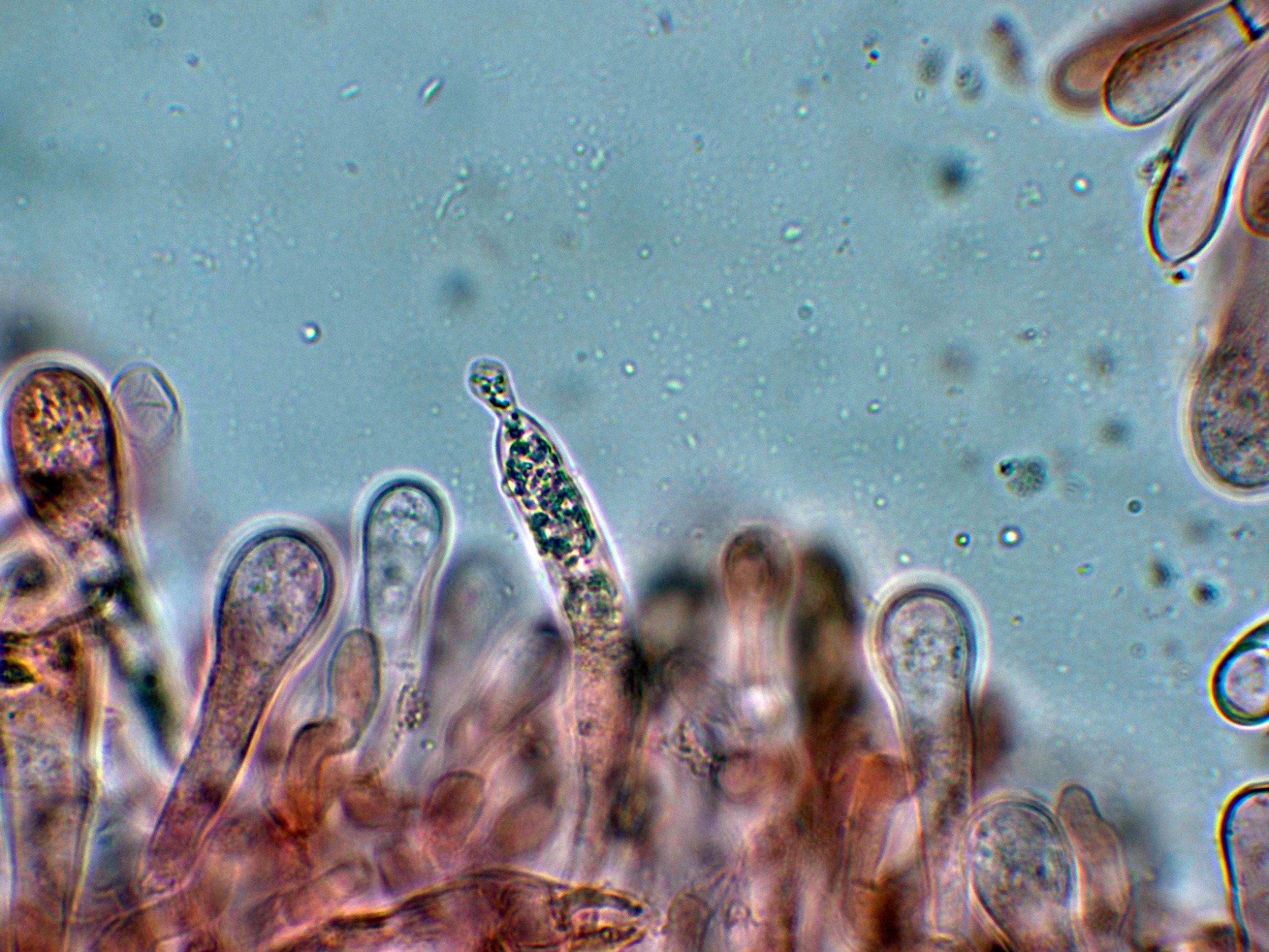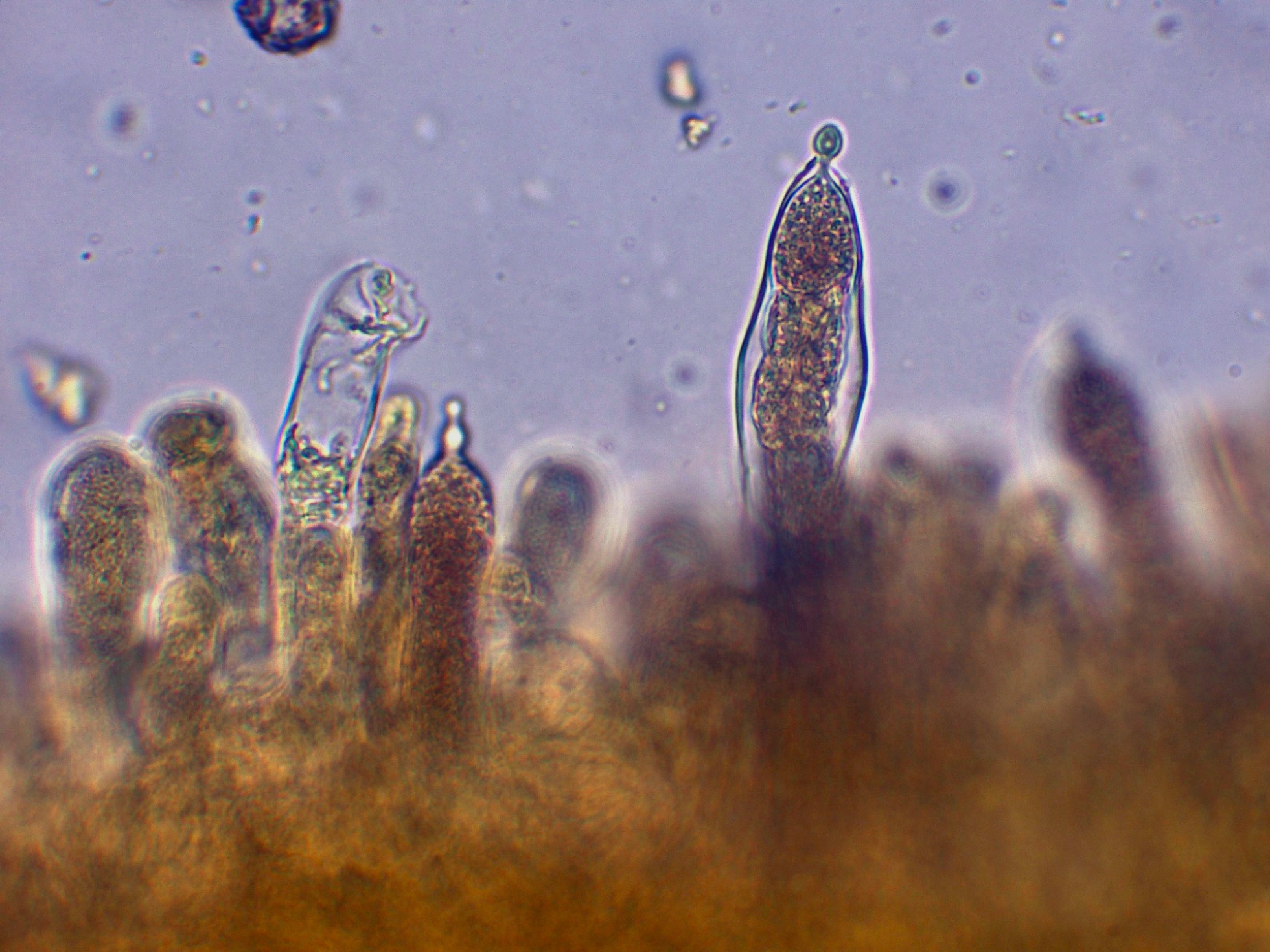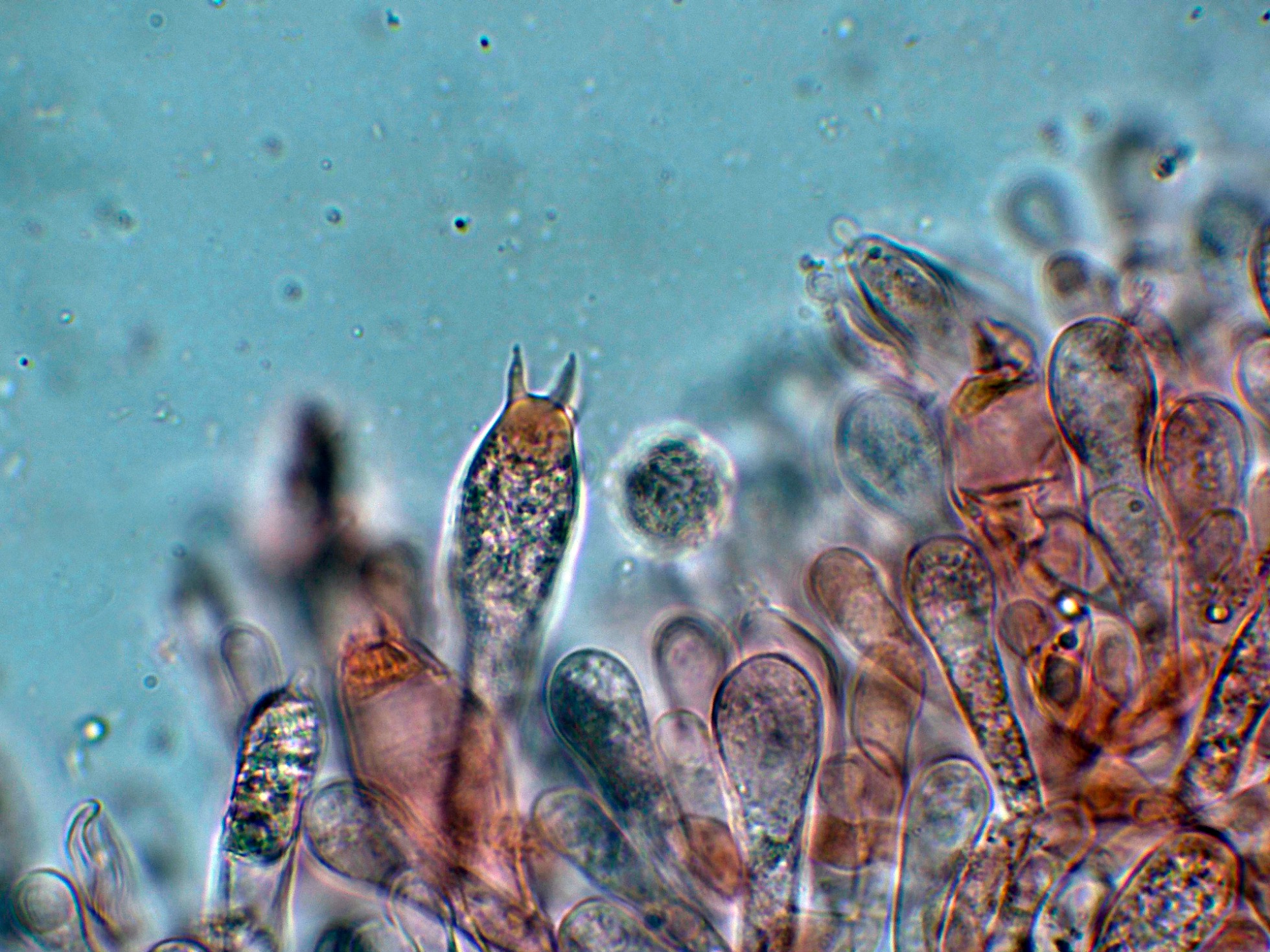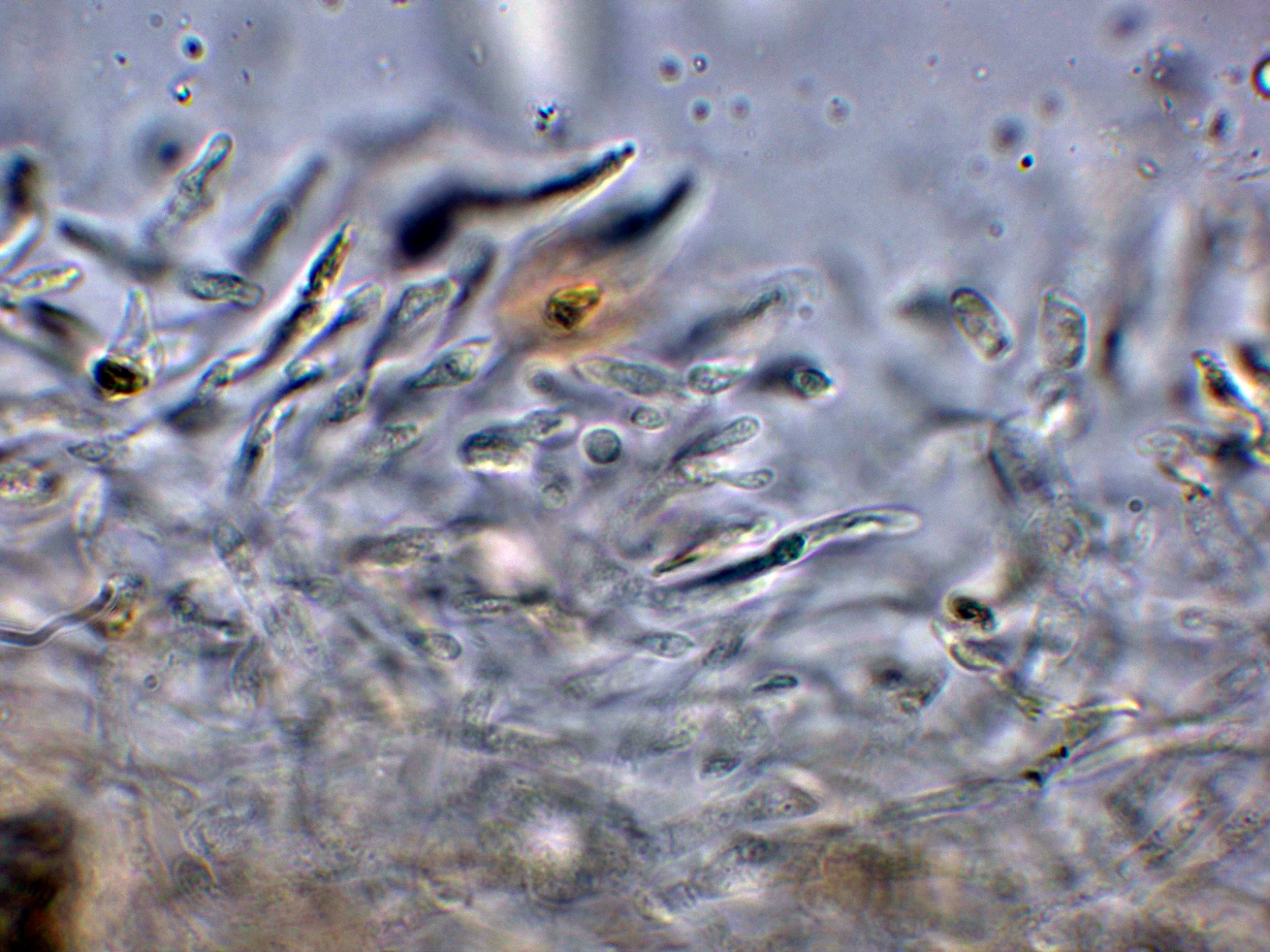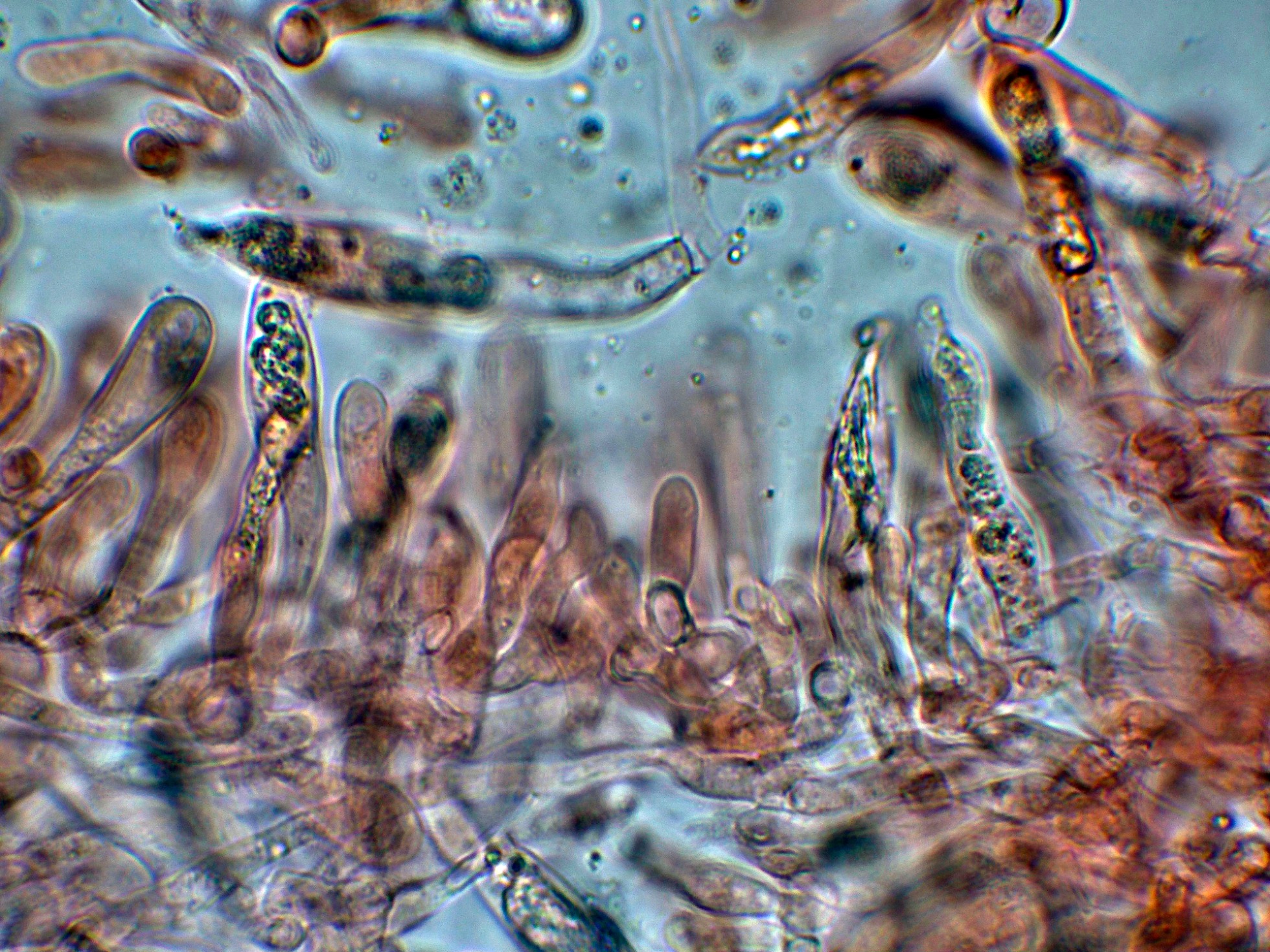 Los cistidios que no sobresalen mucho por encima del nivel de los basidios.
