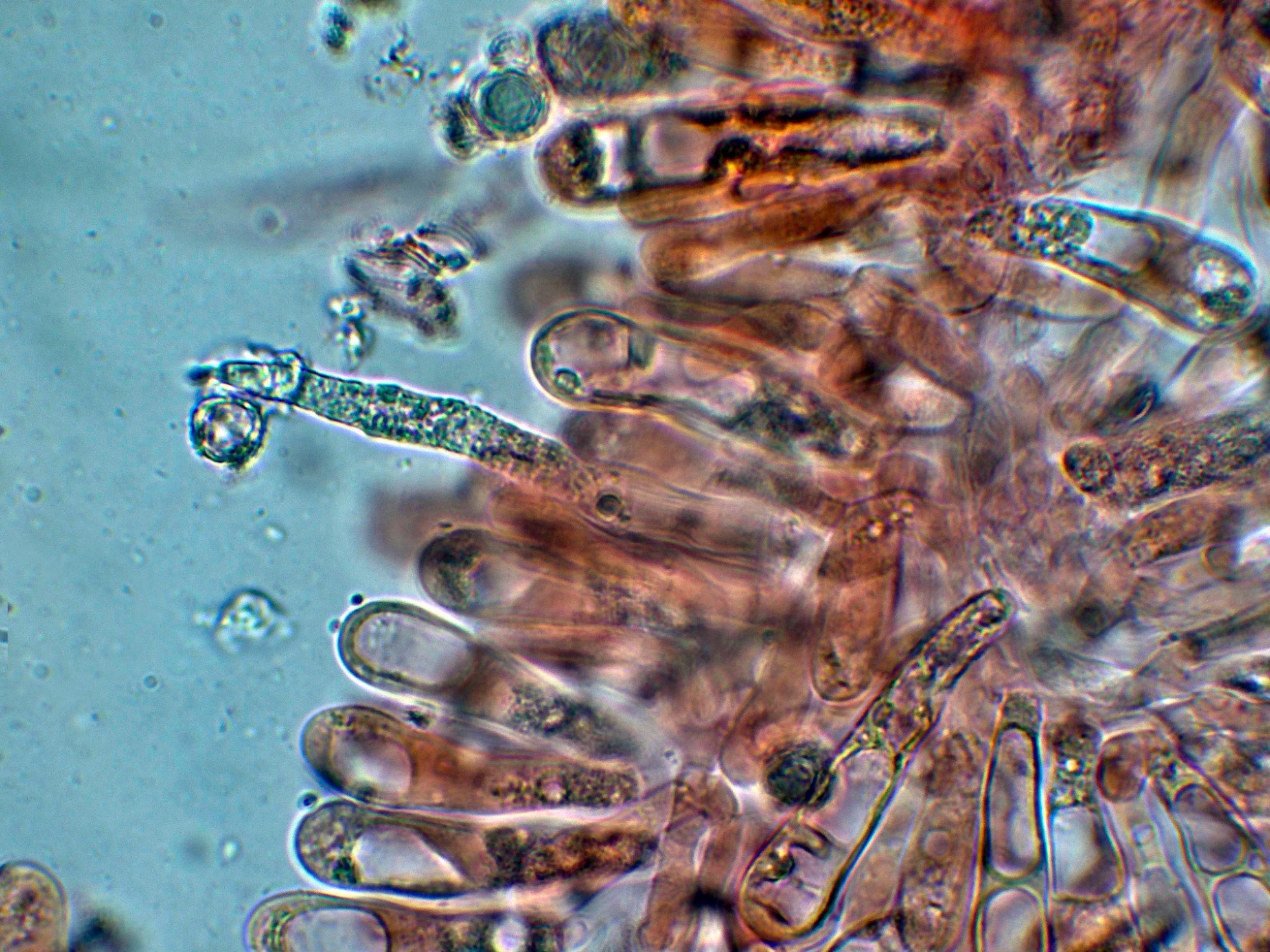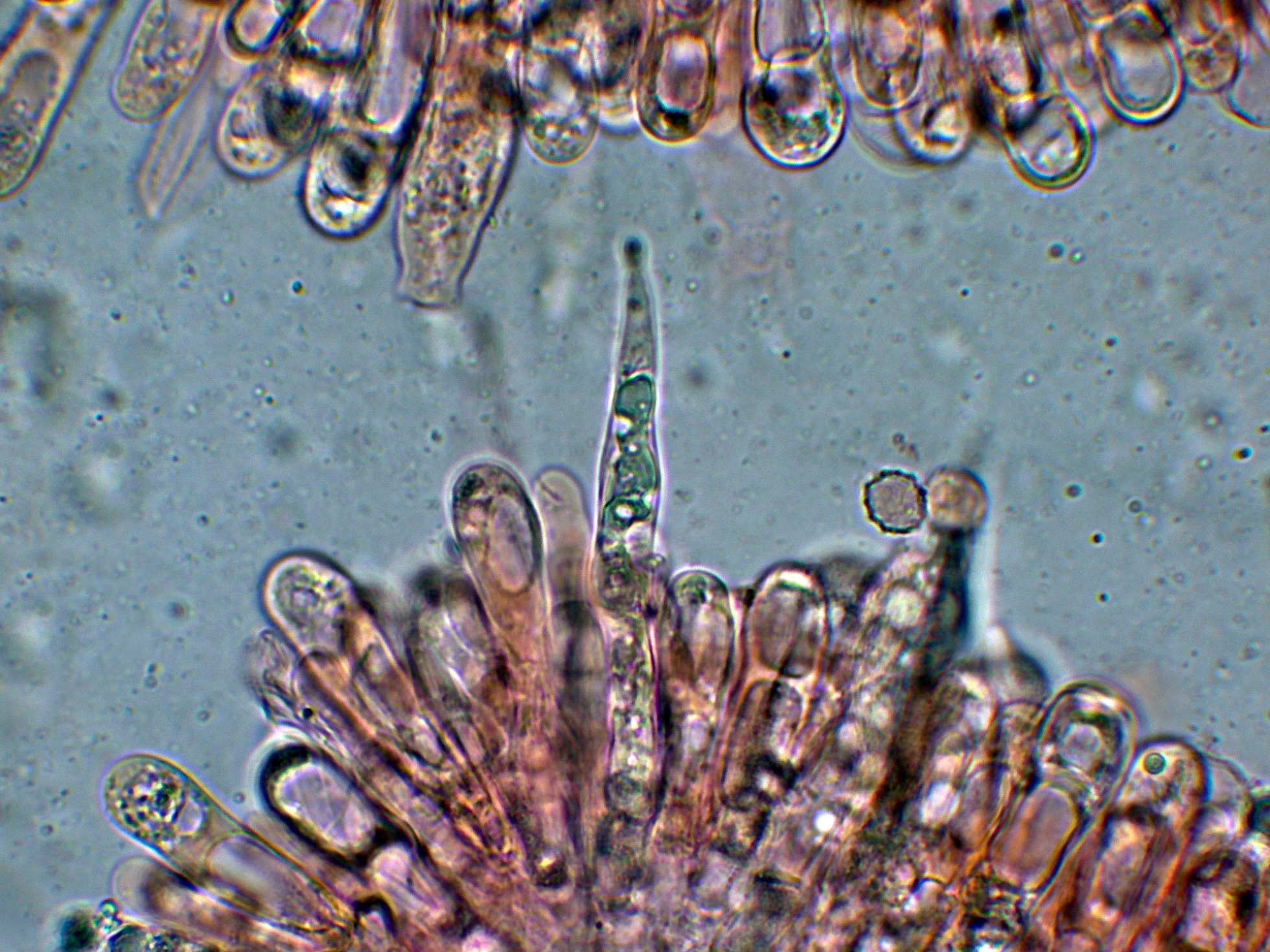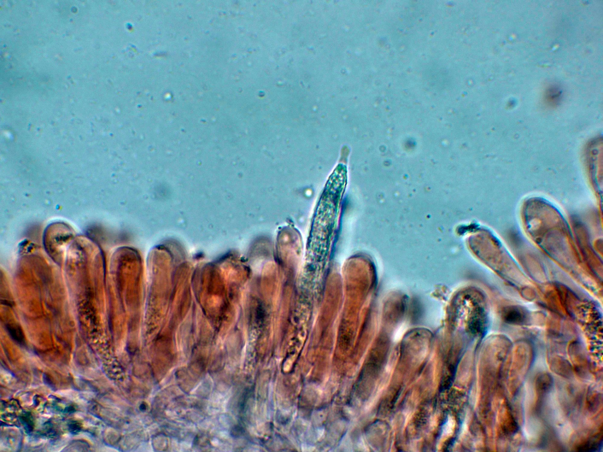 Sus cistidios fusiformes, muy alargados y estrechos, terminados en una larga punta: